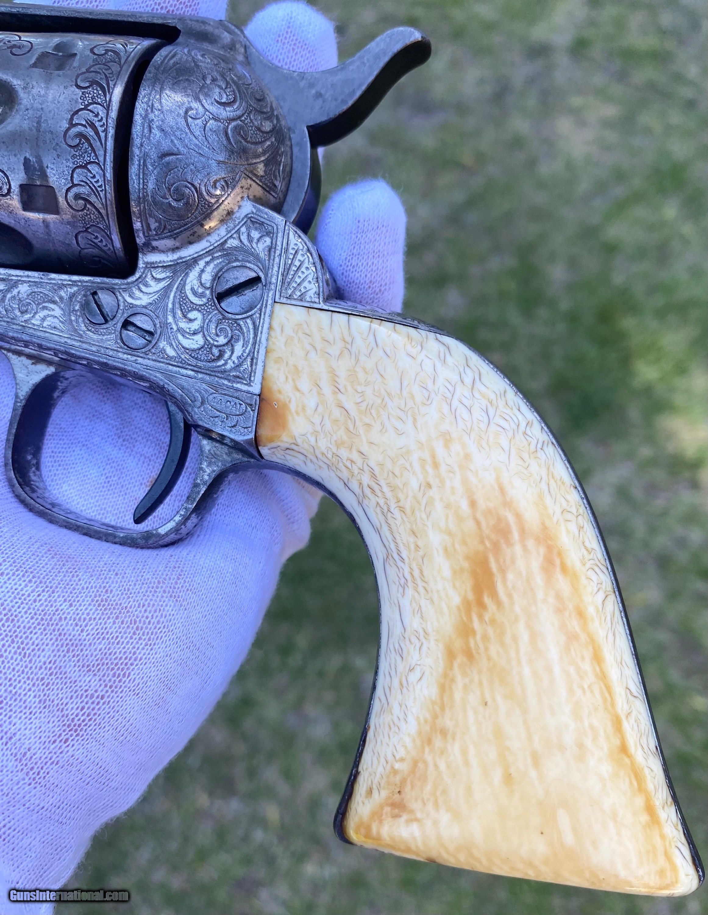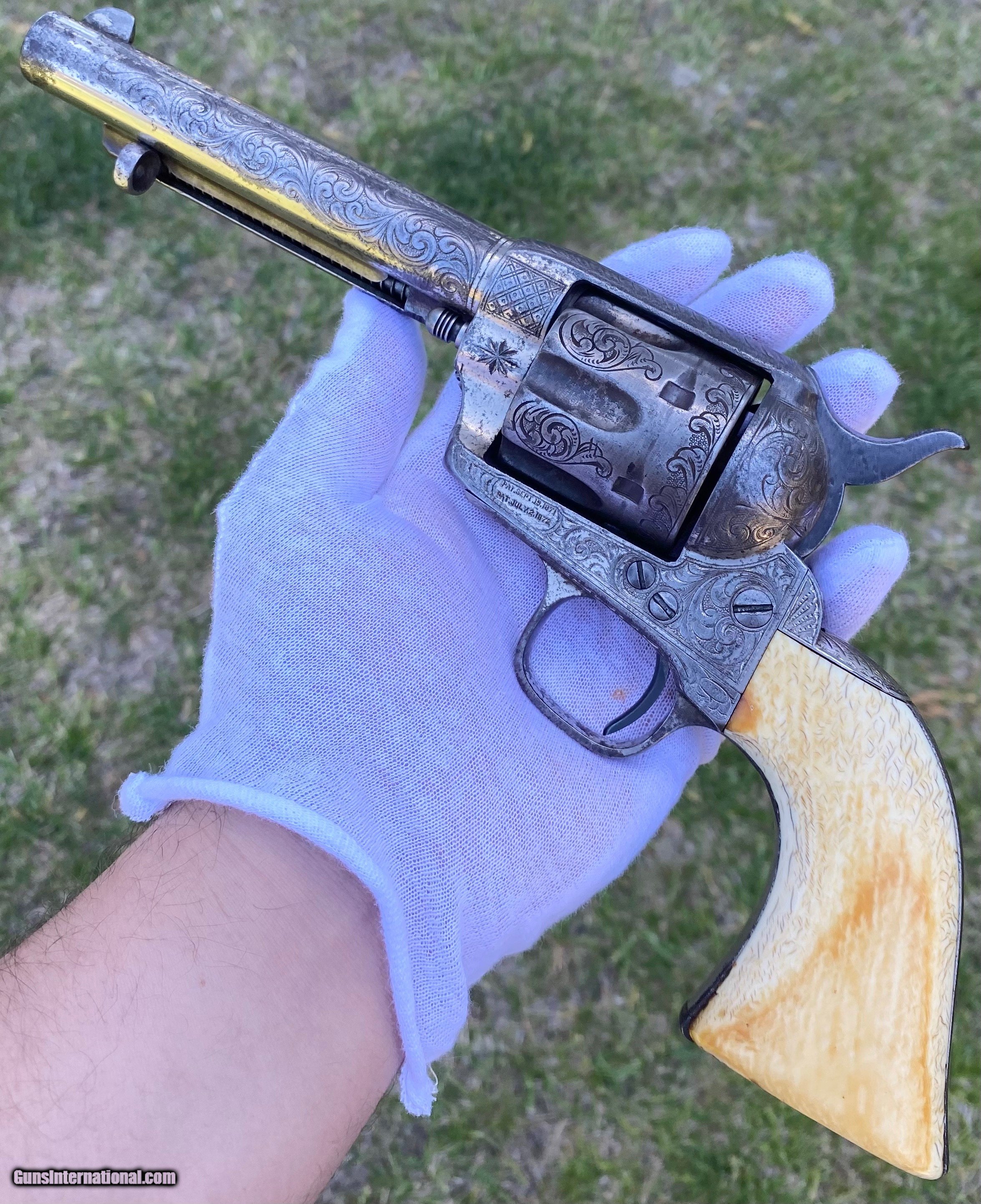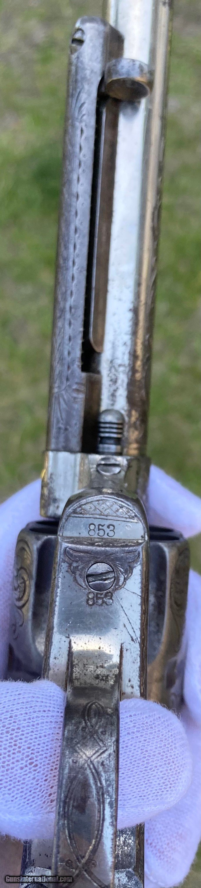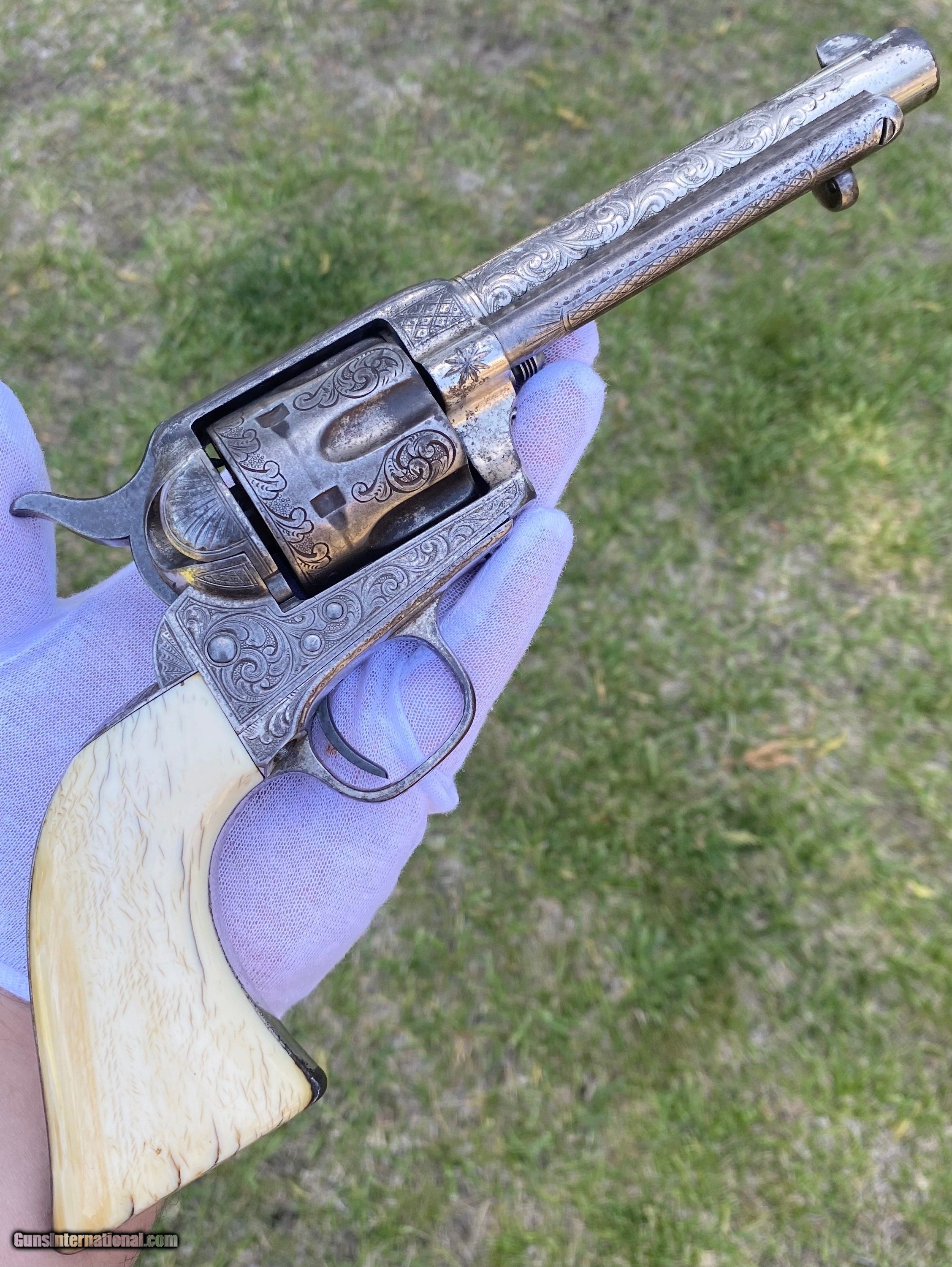 Description: This is a fantastic Colt Single Action Army. This Colt started it's life and left the factory as a .44 Rimfire. After it was converted to the more readily available .44 centerfire. This Colt just has that Wild West down south look to it, The way the ivory aged and the coloration shows it had been in a dry environment for many, many years. This Single Action Army has a 3 digit serial number. The engraving appears to be from the Nimschke shop rather than just some New York engraver as it is much higher quality then most. The motif on the backstrap and the way it's done is the giveaway. The barrel was cut during the period of use to 5 3/8" and the site was moved back. Mechanically works very well. This is really a fantastic looking Colt Single Action with some fantastic and very appealing engraving, excellent Wild West look and even has a 3 digit serial number! Shipping is $30 plus actual insurance. Thank you! Asking: $8,500.00 SOLD Antique: Yes |