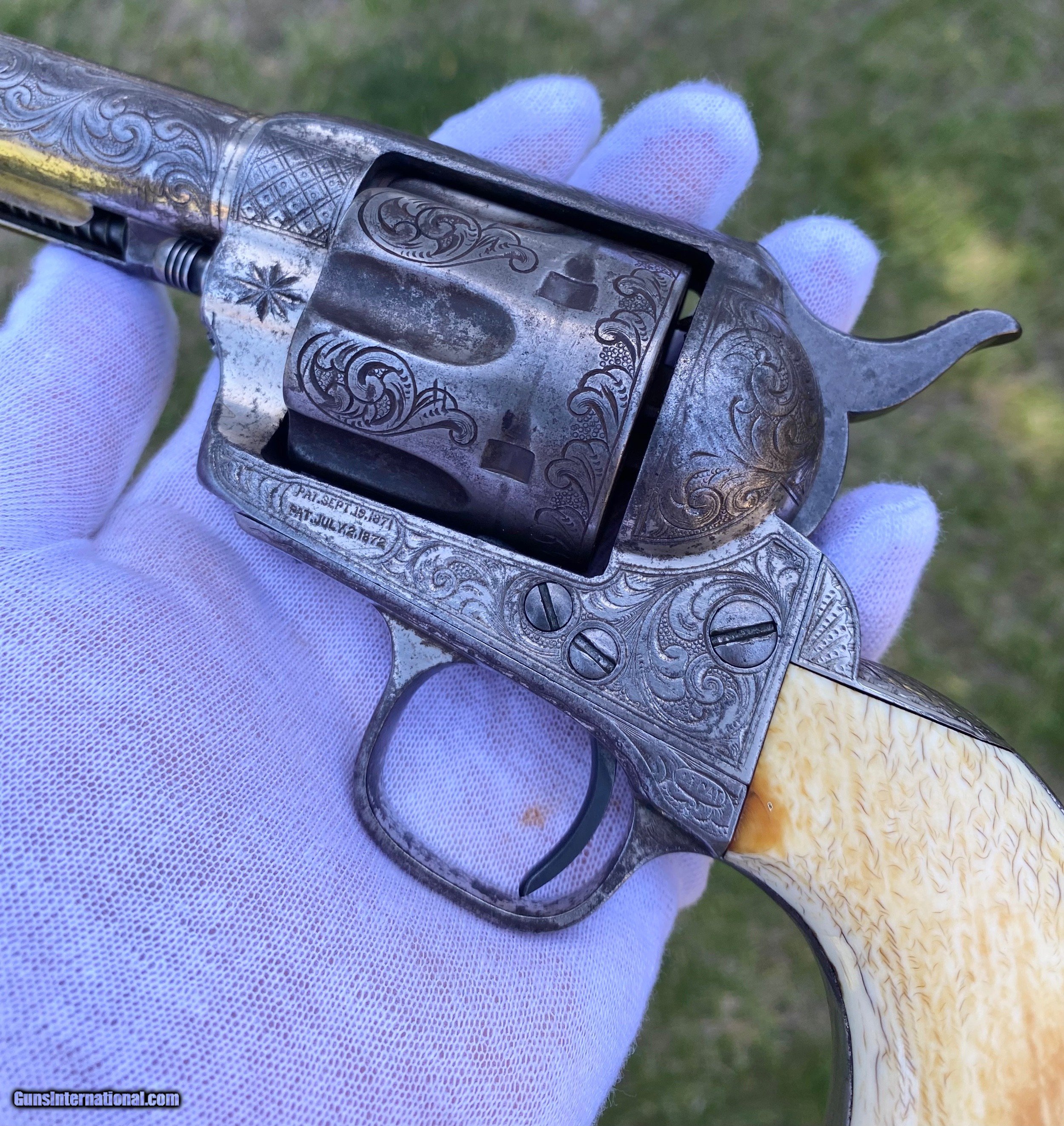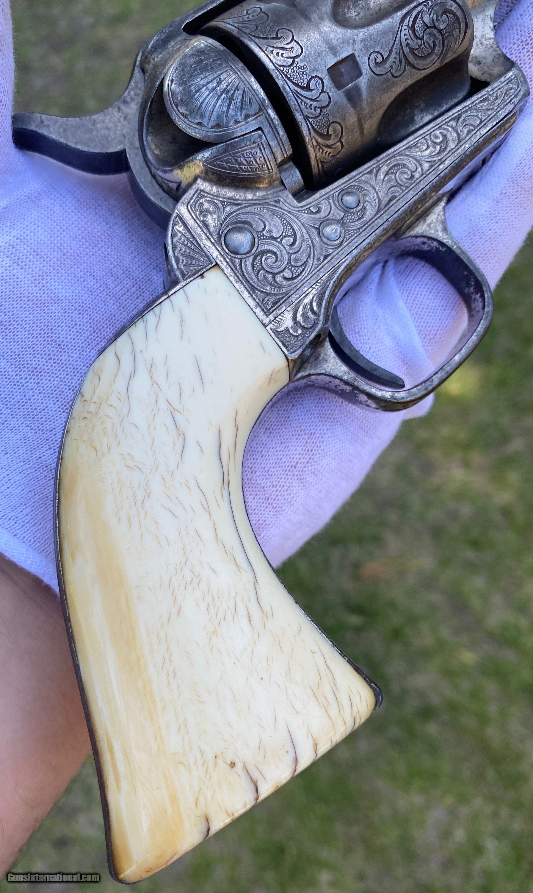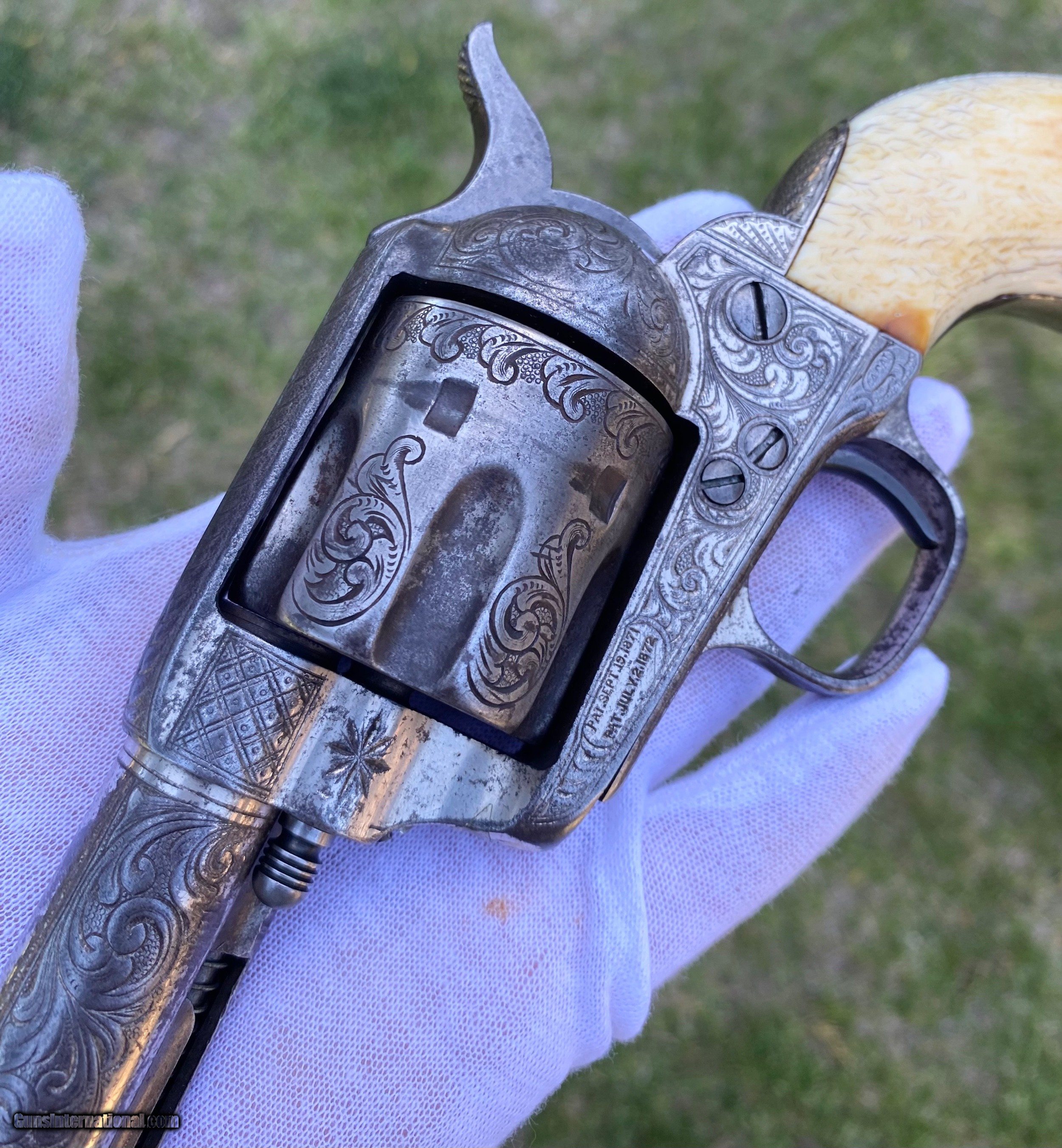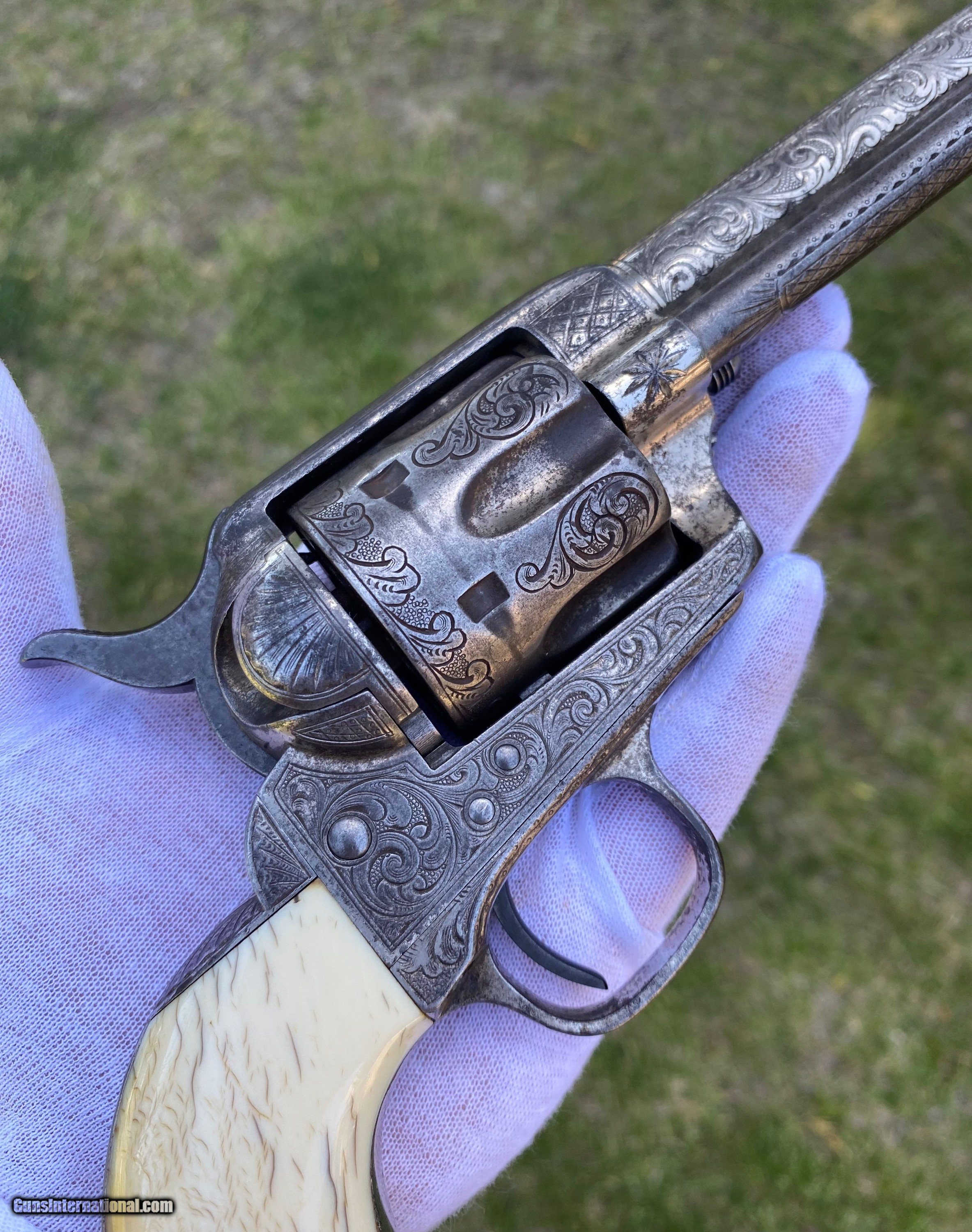 Description: This is a fantastic Colt Single Action Army. This Colt started it's life and left the factory as a .44 Rimfire. After it was converted to the more readily available .44 centerfire. This Colt just has that Wild West down south look to it, The way the ivory aged and the coloration shows it had been in a dry environment for many, many years. This Single Action Army has a 3 digit serial number. The engraving appears to be from the Nimschke shop rather than just some New York engraver as it is much higher quality then most. The motif on the backstrap and the way it's done is the giveaway. The barrel was cut during the period of use to 5 3/8" and the site was moved back. Mechanically works very well. This is really a fantastic looking Colt Single Action with some fantastic and very appealing engraving, excellent Wild West look and even has a 3 digit serial number! Shipping is $30 plus actual insurance. Thank you! Asking: $8,500.00 SOLD Antique: Yes |