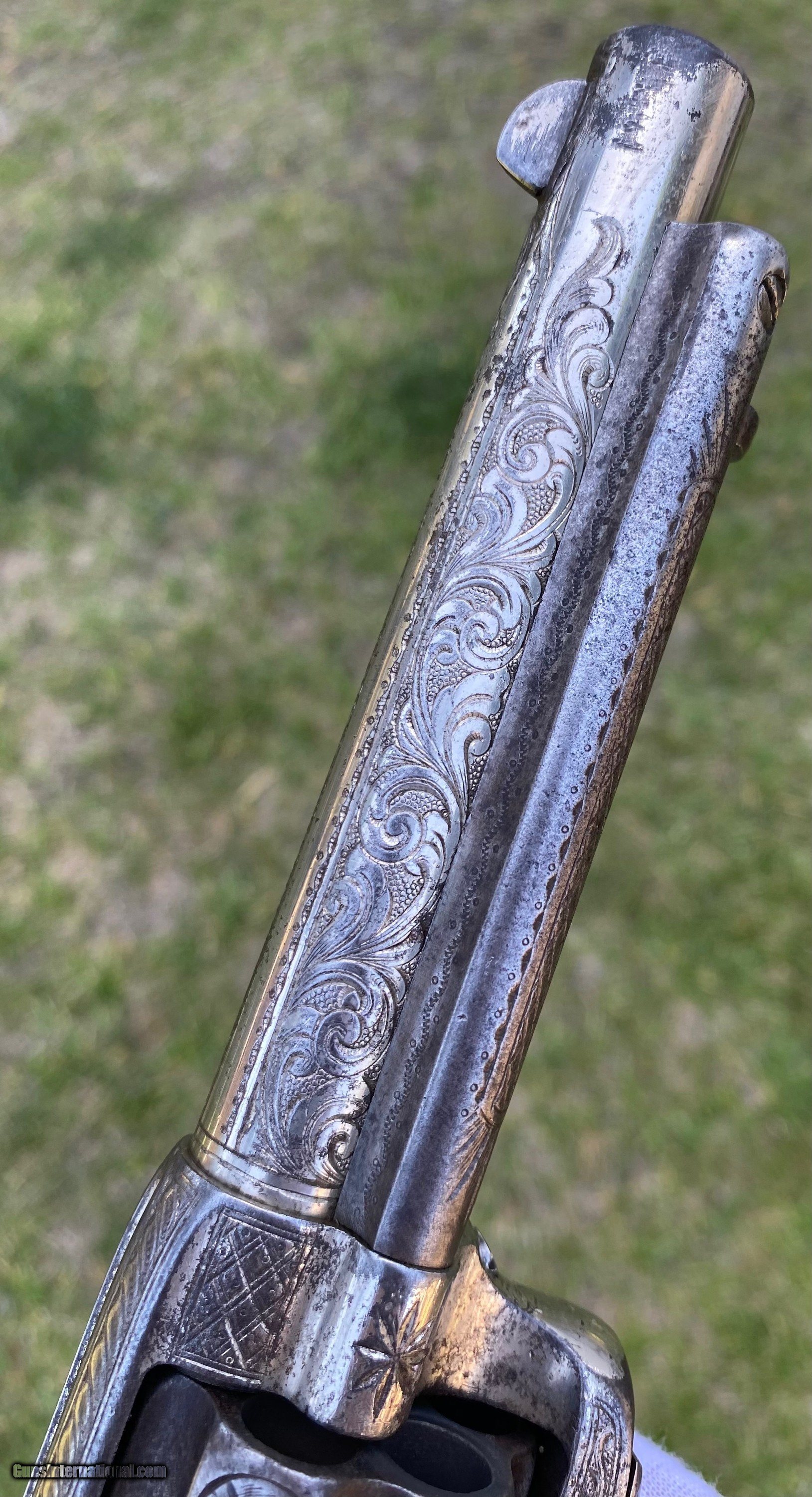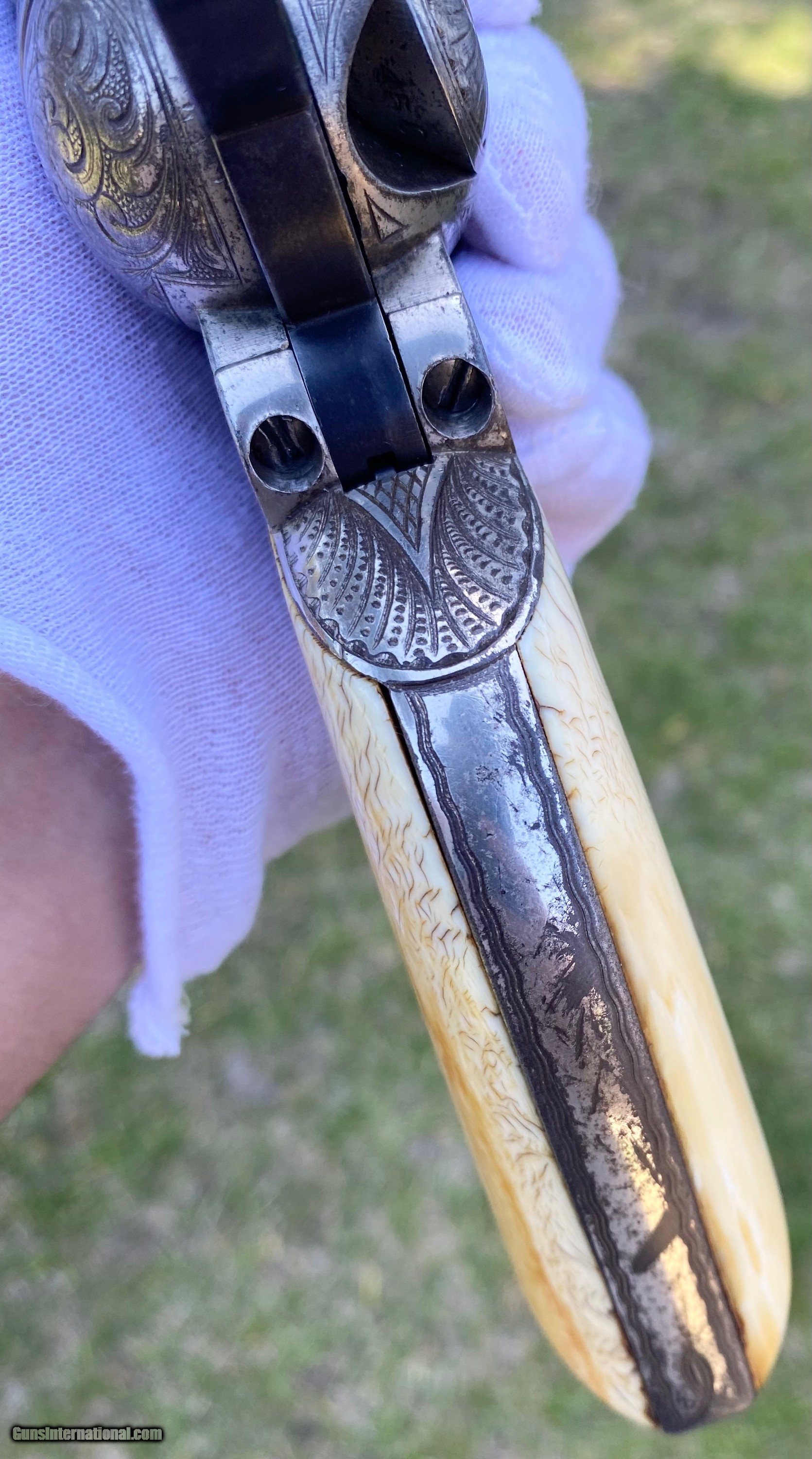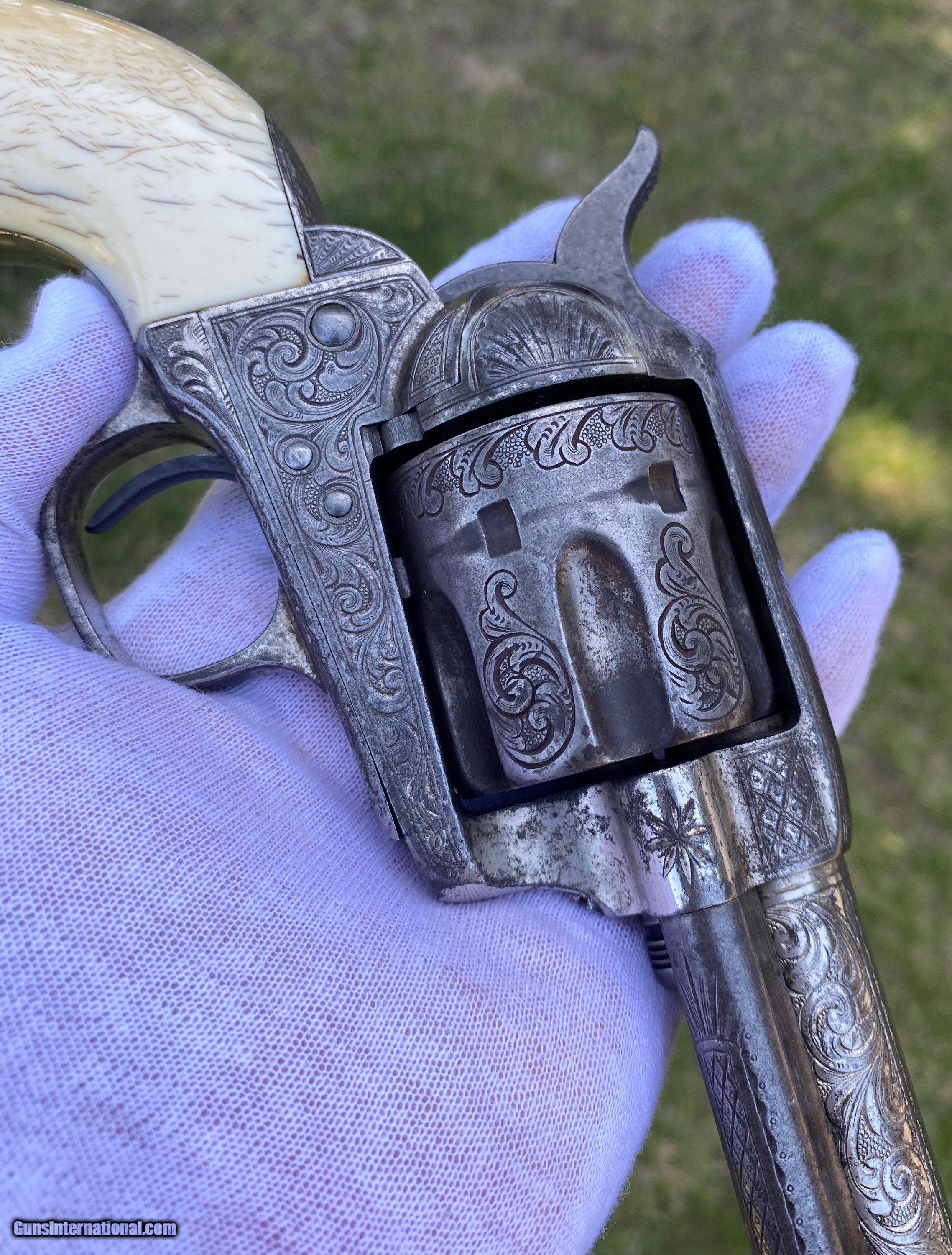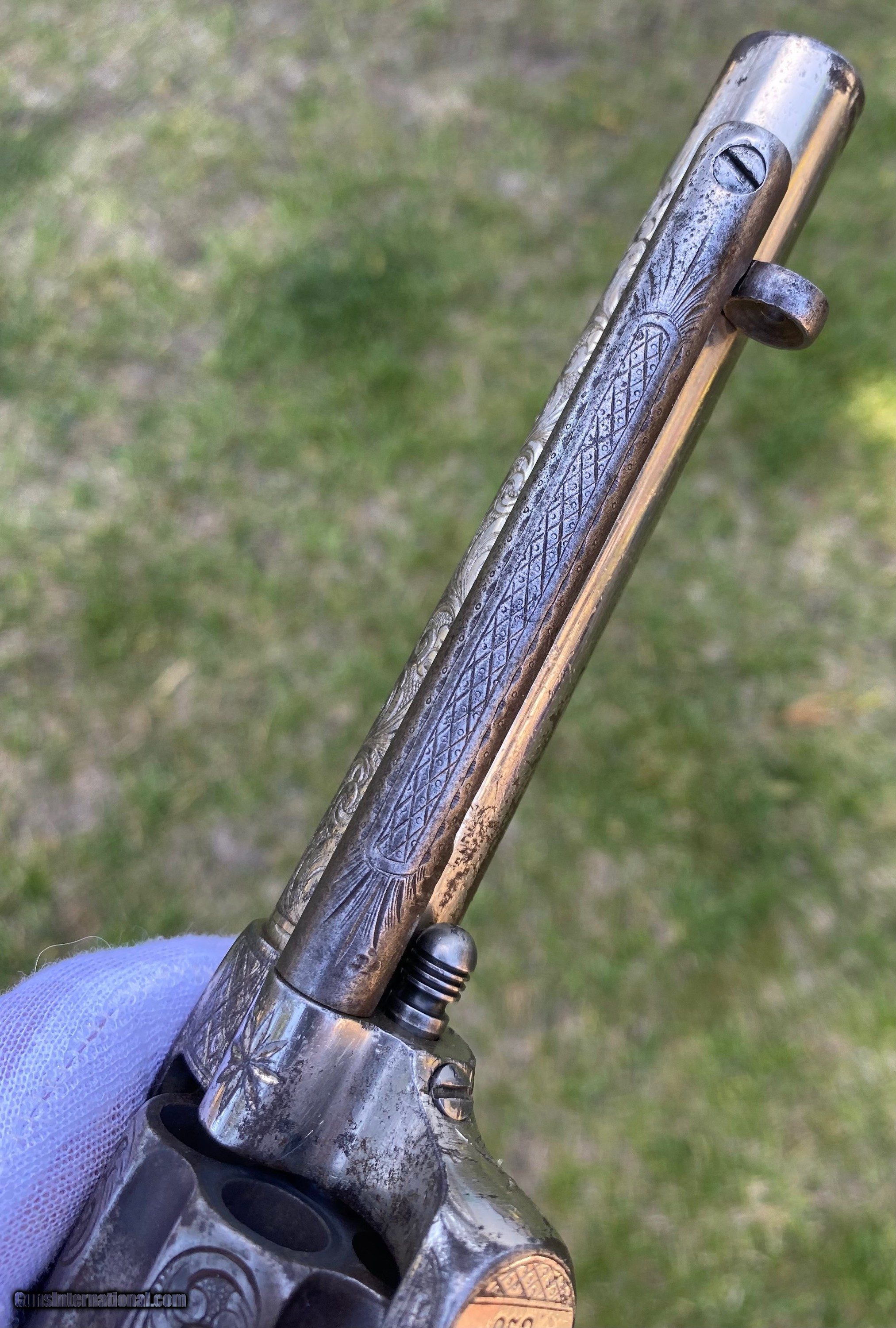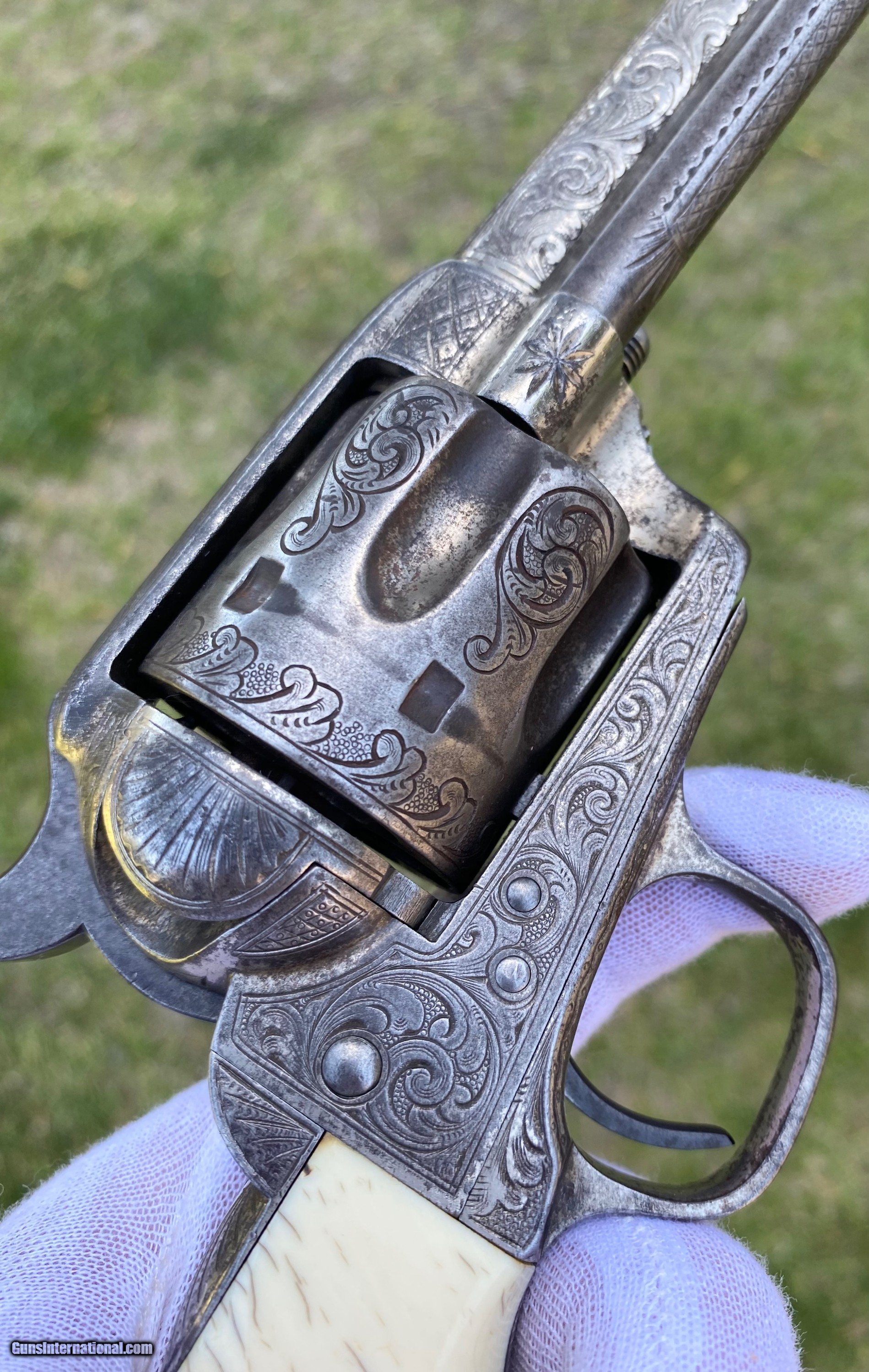 Description: This is a fantastic Colt Single Action Army. This Colt started it's life and left the factory as a .44 Rimfire. After it was converted to the more readily available .44 centerfire. This Colt just has that Wild West down south look to it, The way the ivory aged and the coloration shows it had been in a dry environment for many, many years. This Single Action Army has a 3 digit serial number. The engraving appears to be from the Nimschke shop rather than just some New York engraver as it is much higher quality then most. The motif on the backstrap and the way it's done is the giveaway. The barrel was cut during the period of use to 5 3/8" and the site was moved back. Mechanically works very well. This is really a fantastic looking Colt Single Action with some fantastic and very appealing engraving, excellent Wild West look and even has a 3 digit serial number! Shipping is $30 plus actual insurance. Thank you! Asking: $8,500.00 SOLD Antique: Yes |