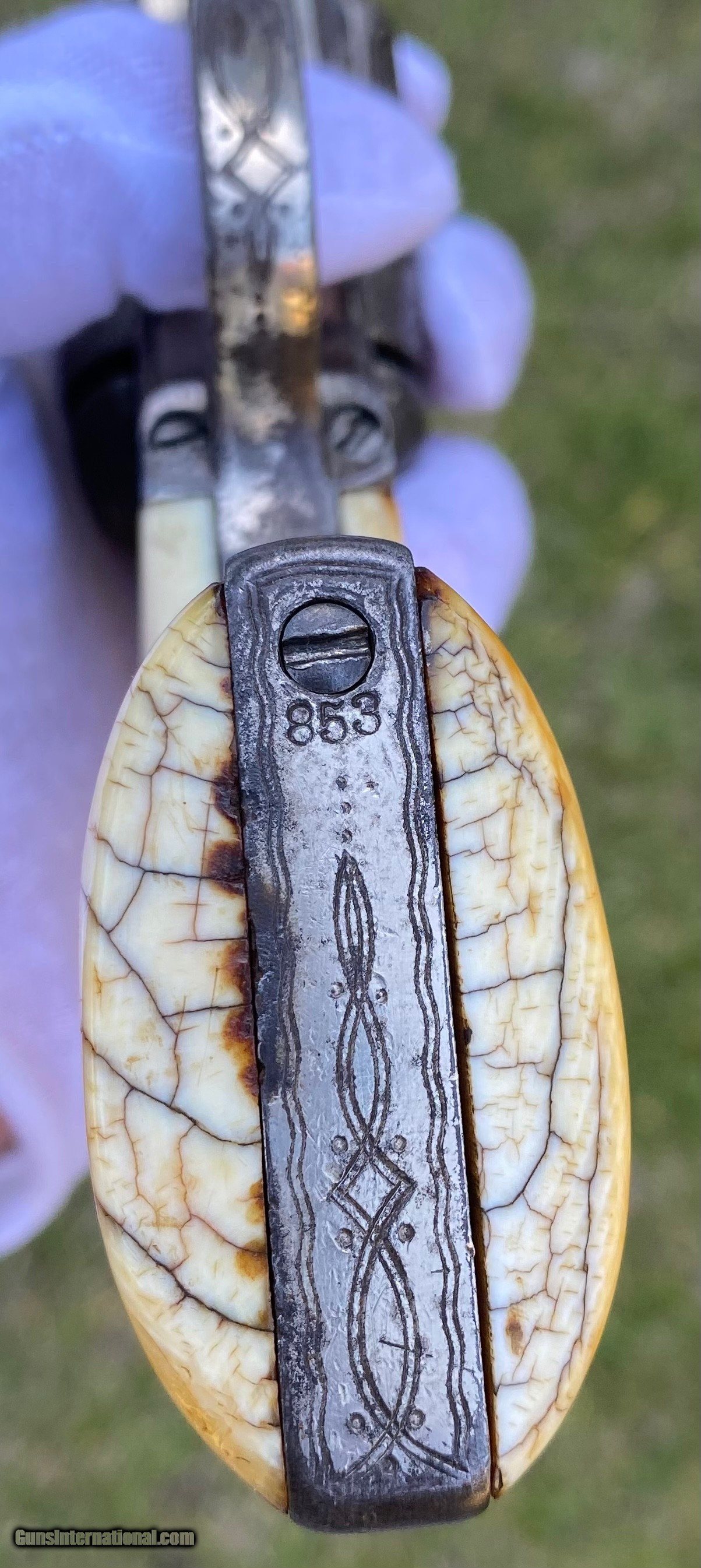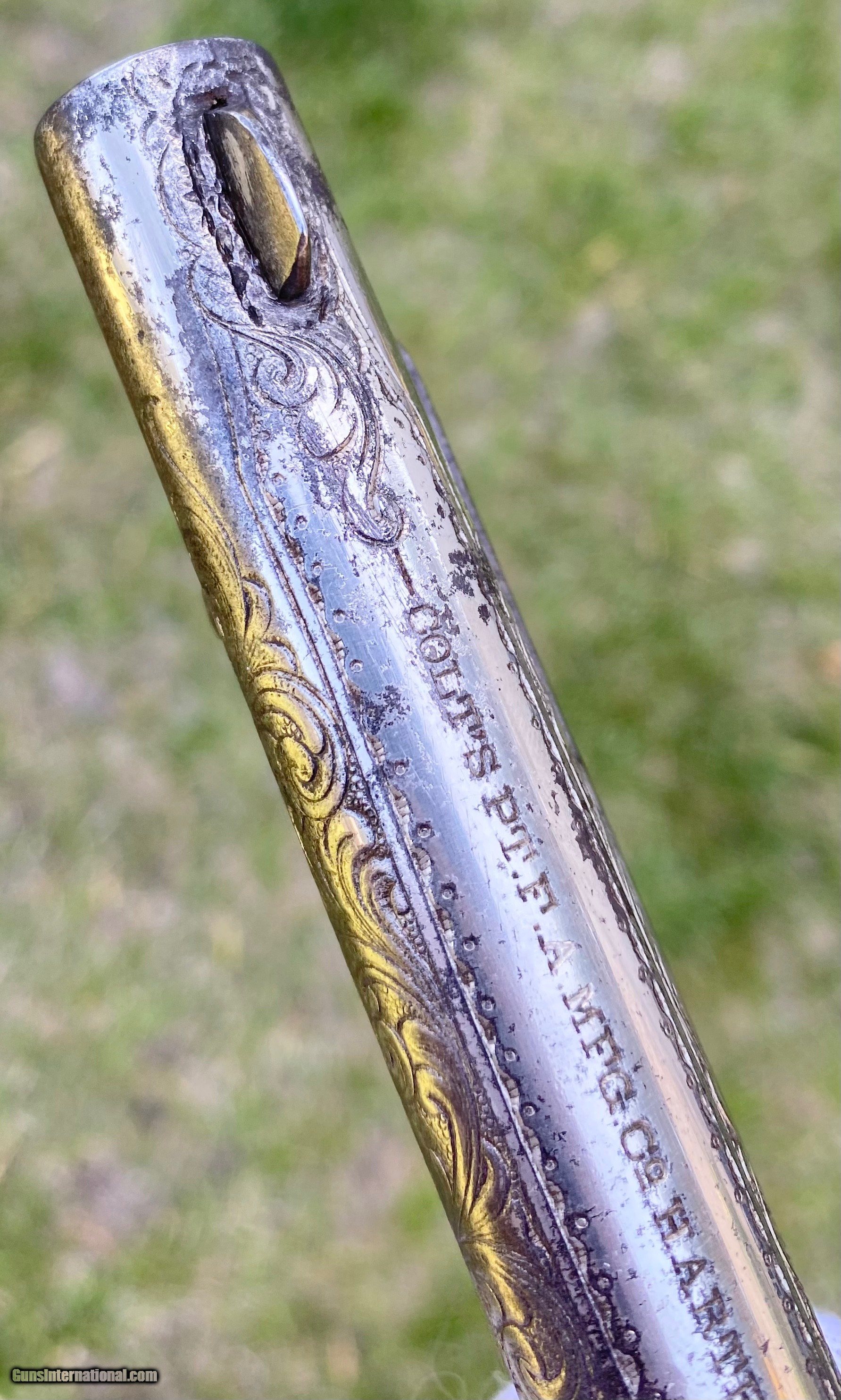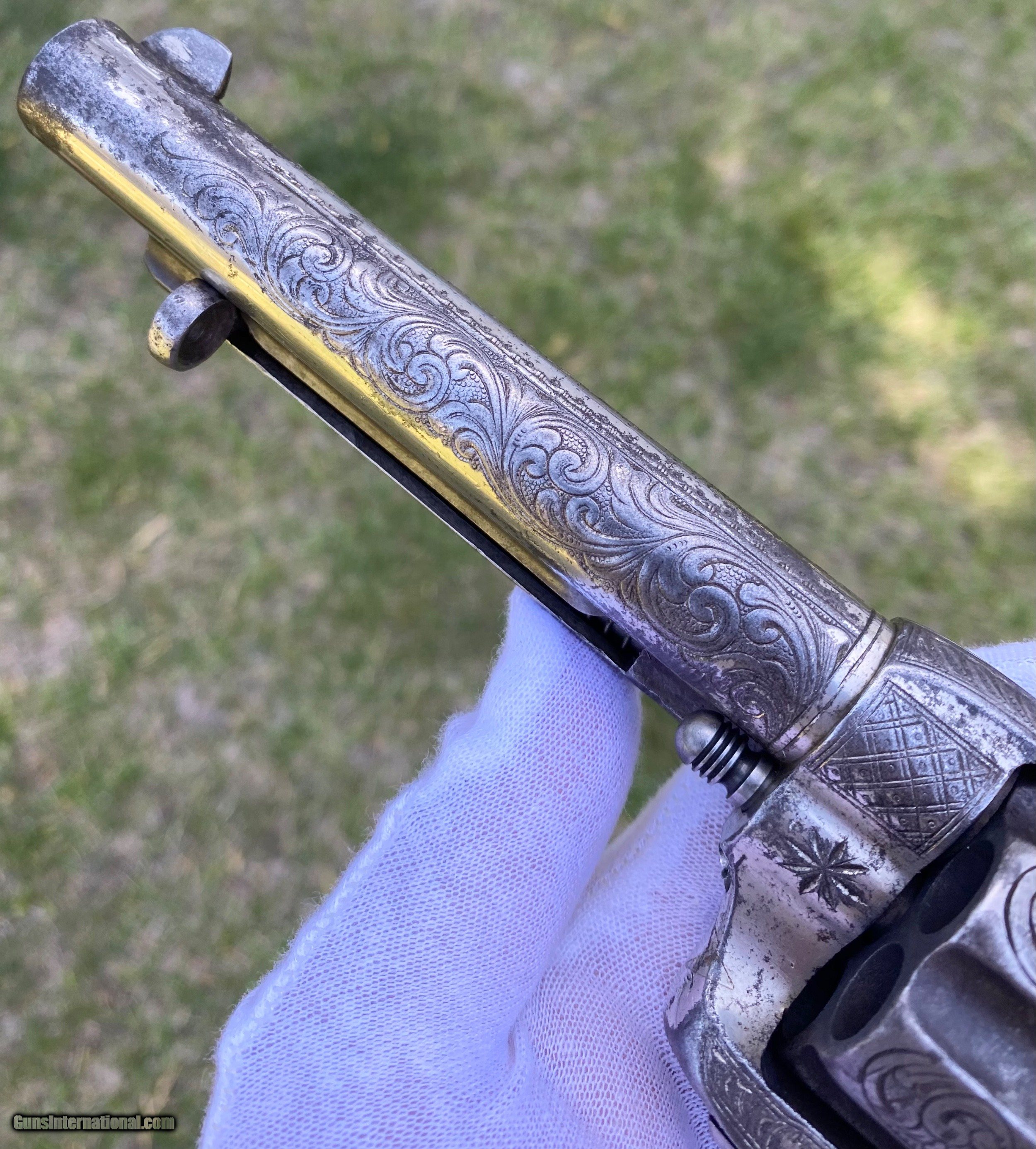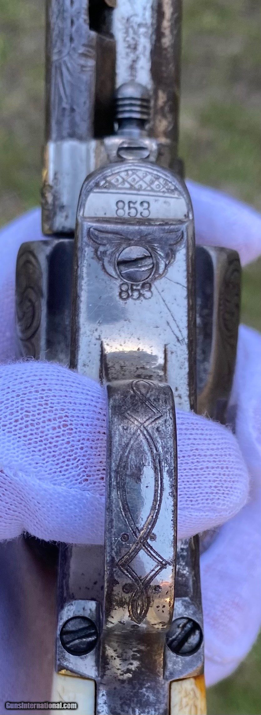 Description: This is a fantastic Colt Single Action Army. This Colt started it's life and left the factory as a .44 Rimfire. After it was converted to the more readily available .44 centerfire. This Colt just has that Wild West down south look to it, The way the ivory aged and the coloration shows it had been in a dry environment for many, many years. This Single Action Army has a 3 digit serial number. The engraving appears to be from the Nimschke shop rather than just some New York engraver as it is much higher quality then most. The motif on the backstrap and the way it's done is the giveaway. The barrel was cut during the period of use to 5 3/8" and the site was moved back. Mechanically works very well. This is really a fantastic looking Colt Single Action with some fantastic and very appealing engraving, excellent Wild West look and even has a 3 digit serial number! Shipping is $30 plus actual insurance. Thank you! Asking: $8,500.00 SOLD Antique: Yes |