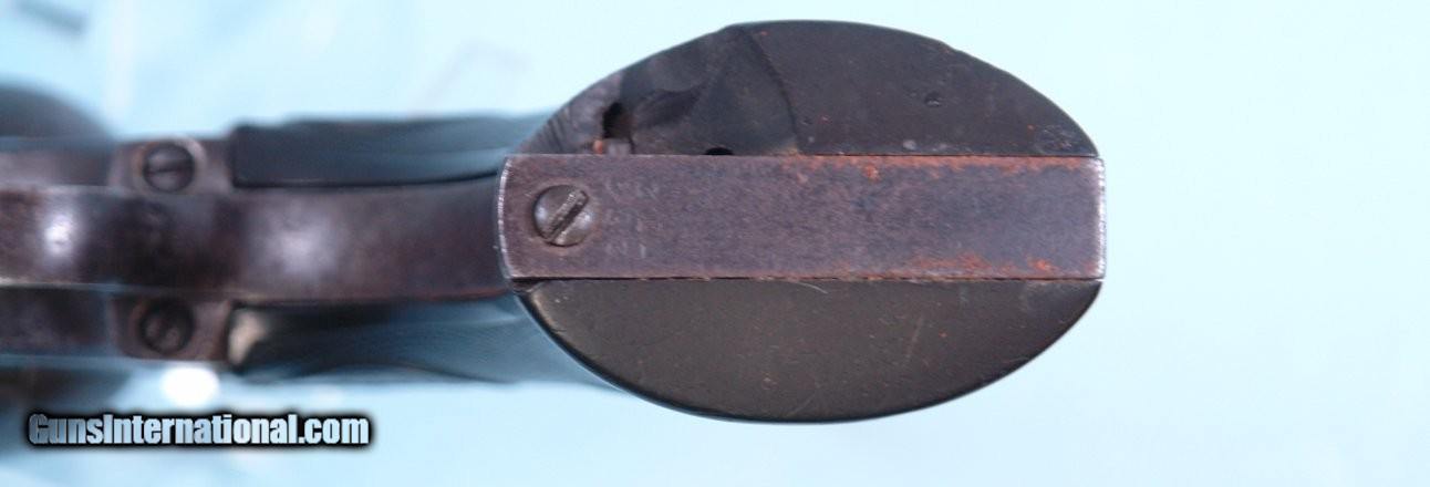 Description: ORIGINAL COLT FIRST GENERATION .32 W.C.F. .32-20 SAA SINGLE ACTION 4 ¾” REVOLVER MFG. 1905. All original and matching in the 269,xxx serial range. Very good untouched condition with no replaced parts, screws or refinishing. As found. Approximately 40% blue mixed with even dark patina. Excellent marking and sharp two-line Colt barrel address. Original hard rubber grips with broken toe of left flat. Perfect and very tight working order. Cycles like new. Excellent bore. SOLD Curio/Relic: Yes Handgun Caliber: .32-20 Winchester (.32 WCF, .32-20 Marlin, .32 Colt Lightning ) |