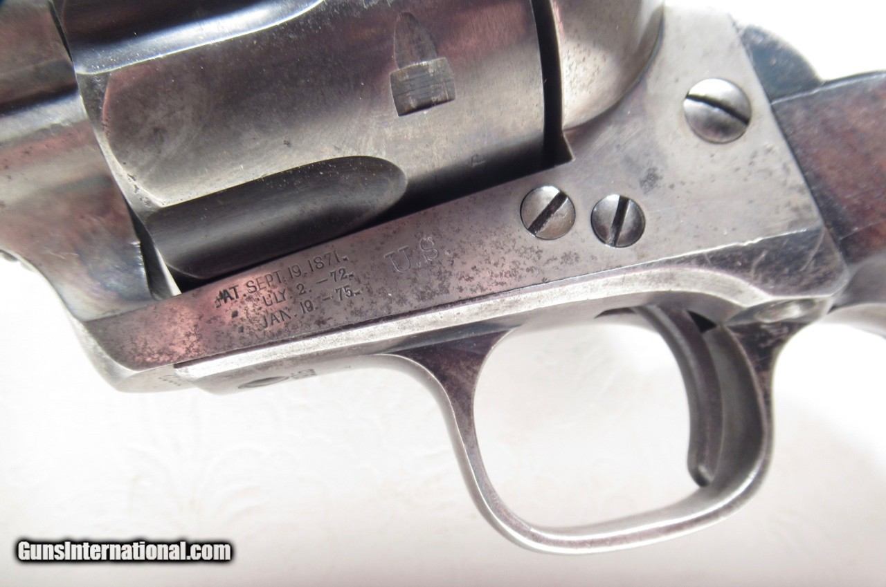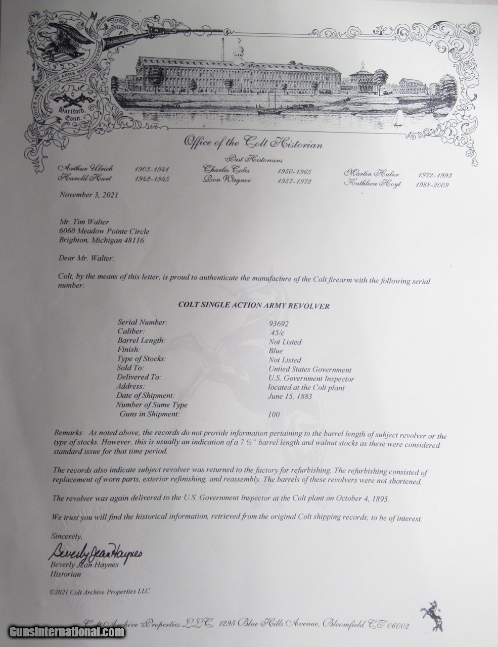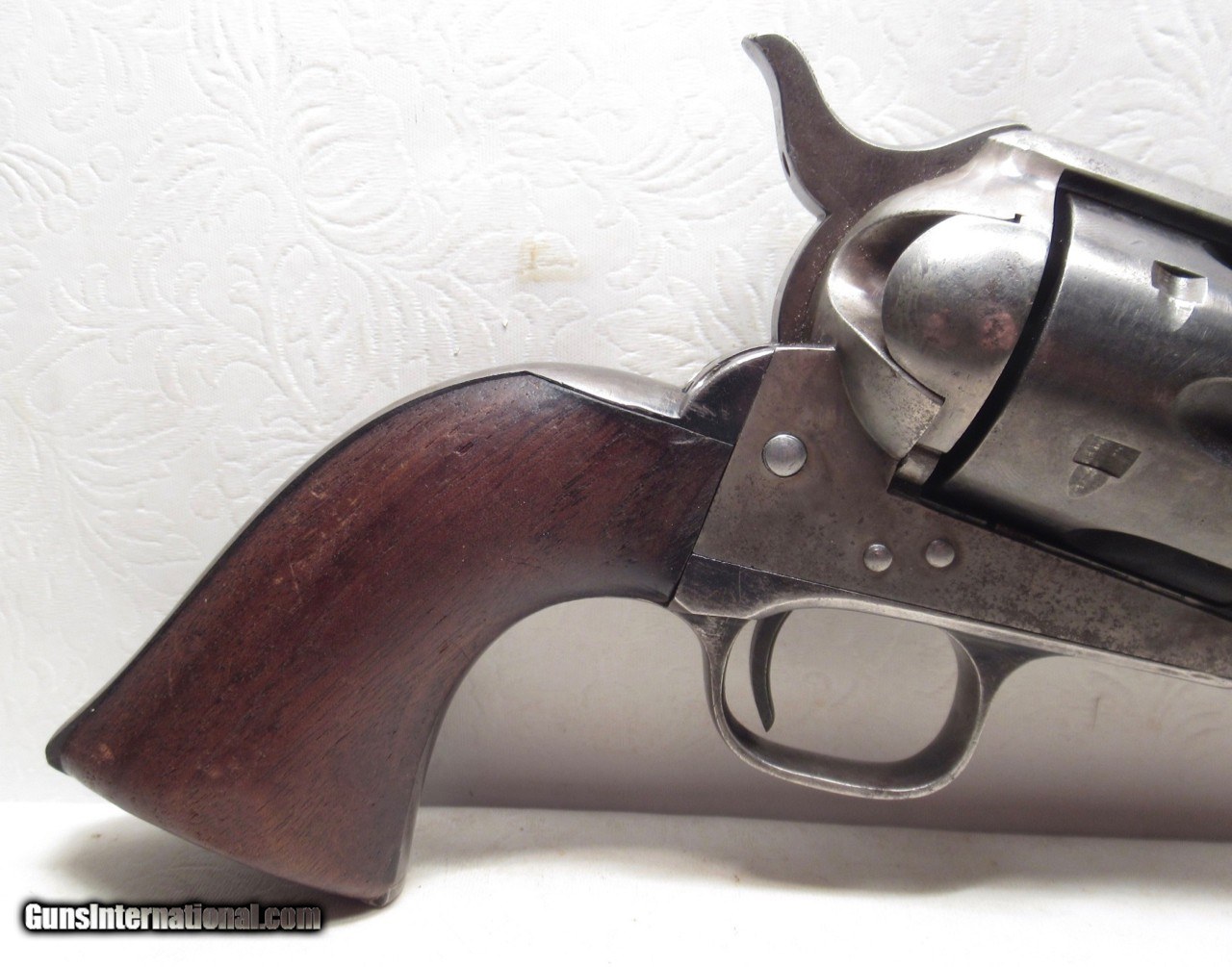 Colt Single Action Army Revolver; Serial No. 93692; Per Included Factory Letter: .45 Caliber, Blue Finish, Shipped June 15, 1883 as Part of a 100 Gun Shipment; Revolver Returned to Factory for Refurbishing and Reassembled for N.Y. Militia; 7 ½” Barrel Not Shortened; Shipped Again in 1895 to N.Y. Inspector; Trigger Guard #6915; This Rare Colt Appears to be 100% Correct with Perfect Tight Action and Perfect Bore; Decent Metal Finish; “RAC” Marked Grips; See All Photos for Condition; No Texts; Call (254)541-5765 or Email Only; PERSONAL PROPERTY of Harold Wieser; NOTICE: We Do Not Do Any Consignments - All Items Listed are Owned by Us - NO SALES to New Jersey or New York City - Antiques Only to Massachusetts and California; NOTE: All Modern Firearms Must Go to FFL Dealer who will Accept From Individual with Texas Driver License; Price: $5,500 + $50 S&H Via USPS Priority Mail; Payment Address: Harold Wieser - 1466 U.S. Hwy 77 - Rosebud, TX 76570; SEND PAYMENTS VIA USPS PRIORITY MAIL; BEWARE of SCAMS!!! - DO NOT SEND MONEY or CORRESPONDENTS ELECTRONICALLY UNLESS YOU HAVE SPOKEN to HAROLD WIESER FIRST! (254)541-5765