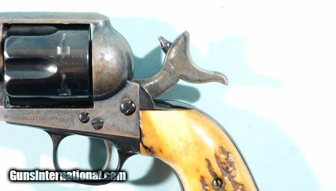 Description: PRE-WAR 1ST GENERATION COLT SINGLE ACTION 4 ¾” FRONTIER SIX SHOOTER .44-40 REVOLVER CIRCA 1909. Beautiful restoration of an original 44-40 with desirable 4 ¾” barrel with original “COLT FRONTIER SIX SHOOTER 44-40” caliber die stamp. Matching serial numbers back strap and trigger guard numbers later stampings) in the 310,xxx range for 1909 production year. Custom high quality restoration case hardening colors and blue with all remaining. Perfect and very tight working order and excellent bore and chambers. Exceptional pre WW2 stag grips of best quality. Factory letter on order. PRICE ON REQUEST SOLD Curio/Relic: Yes |