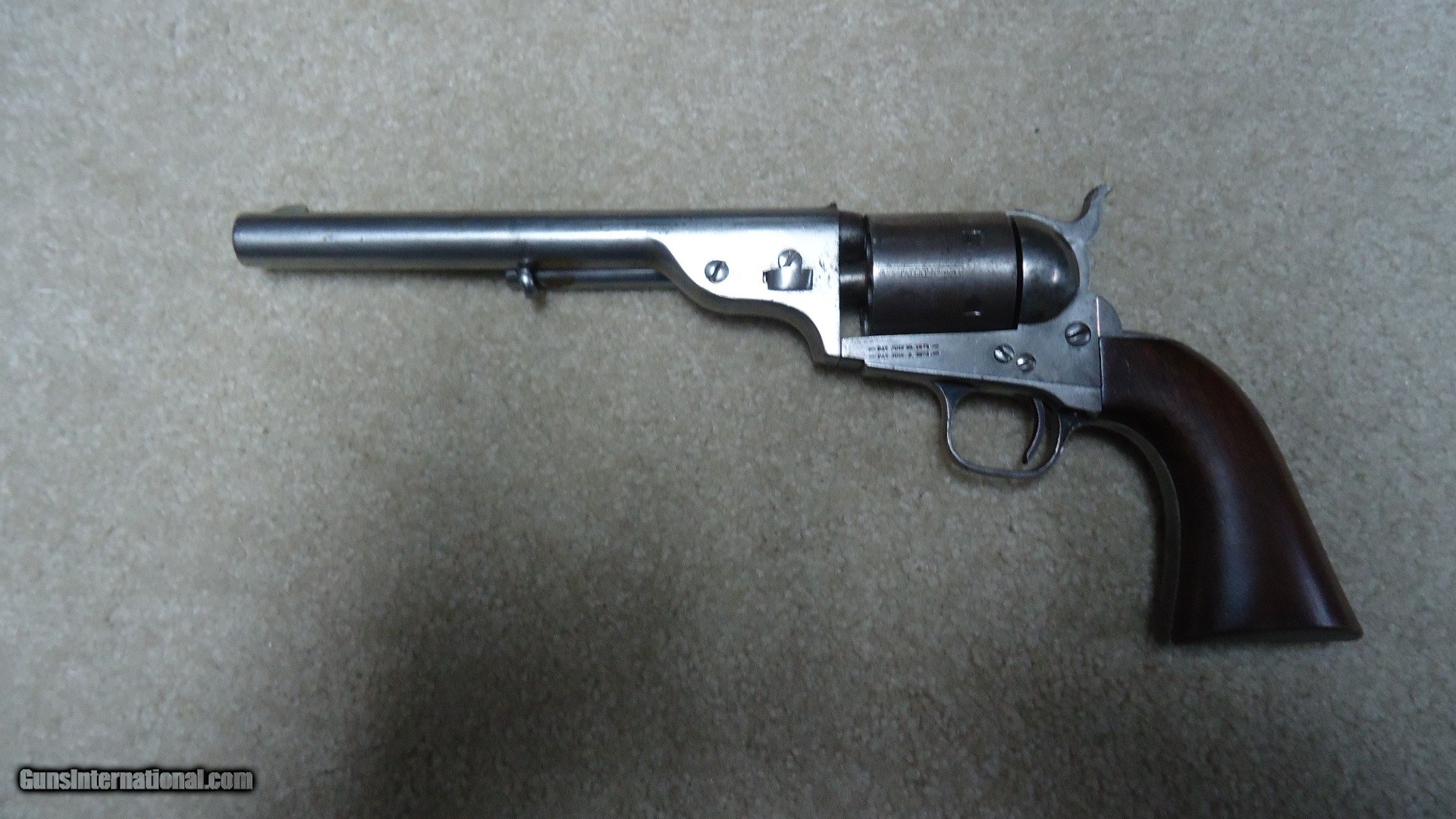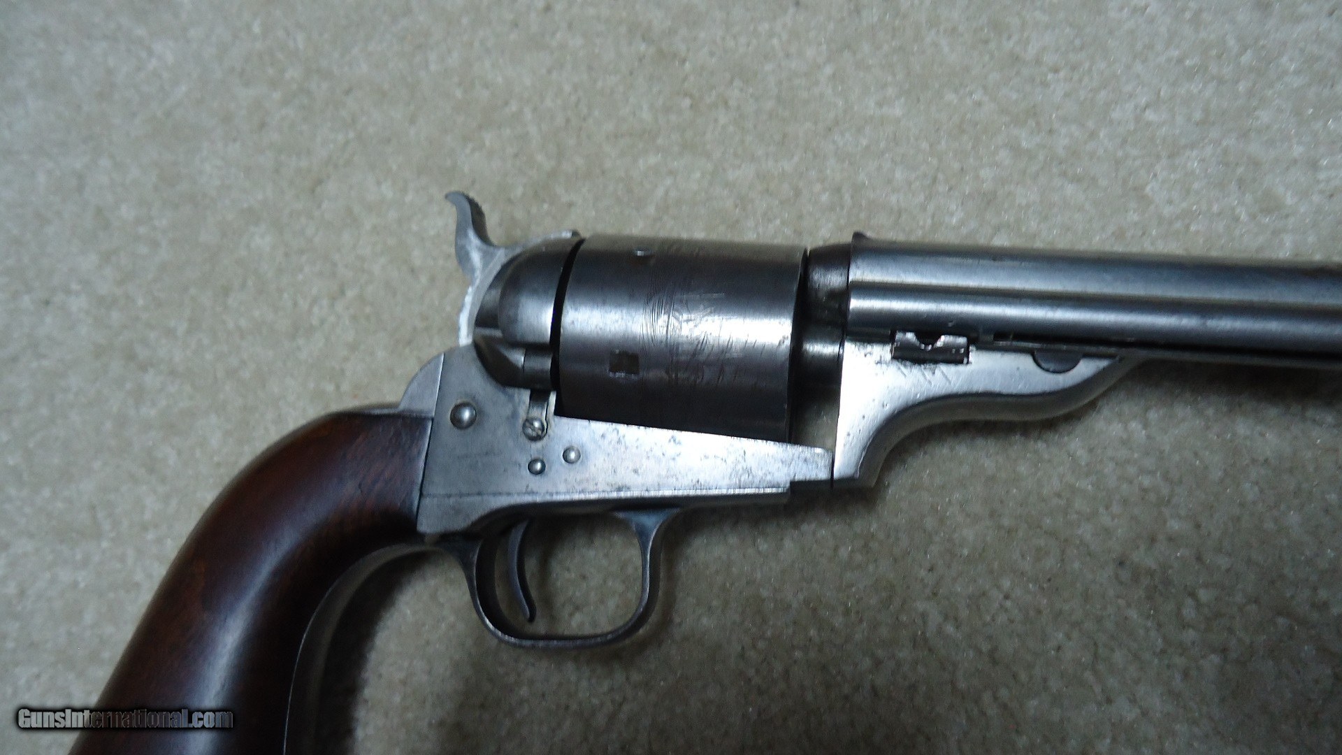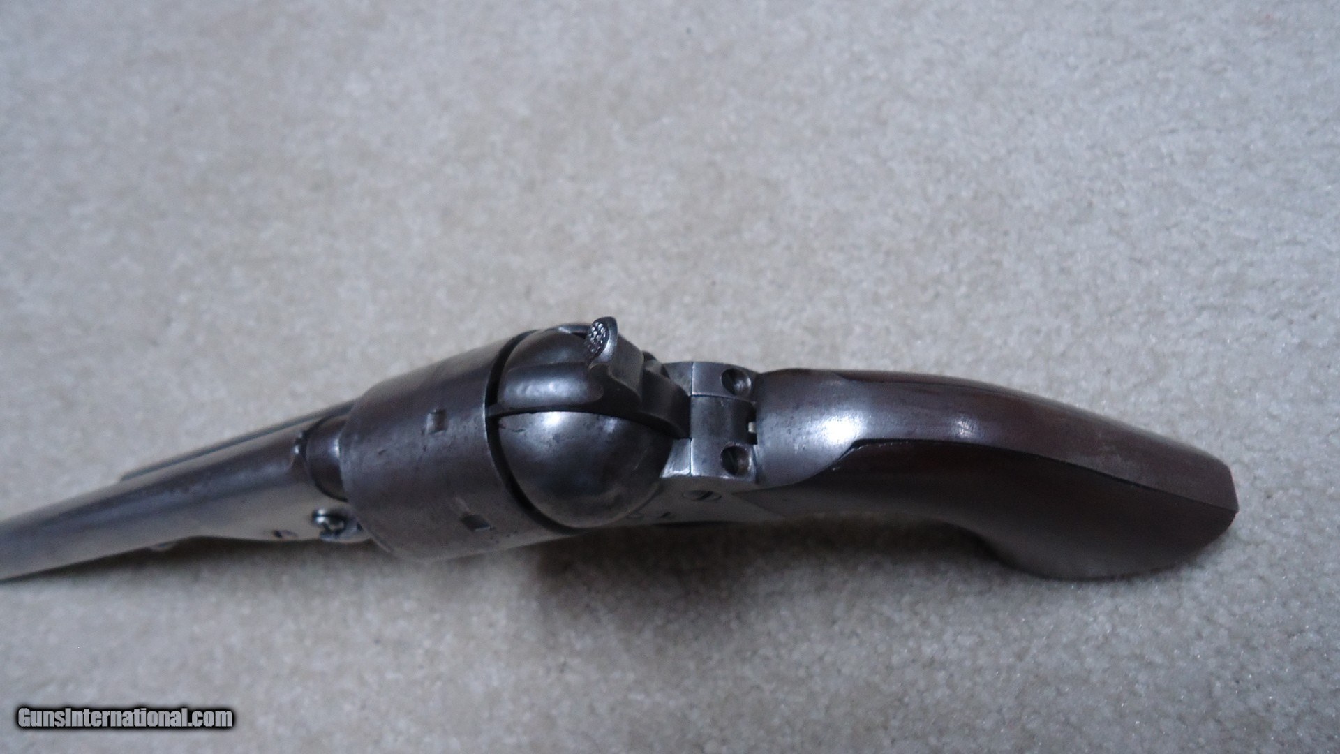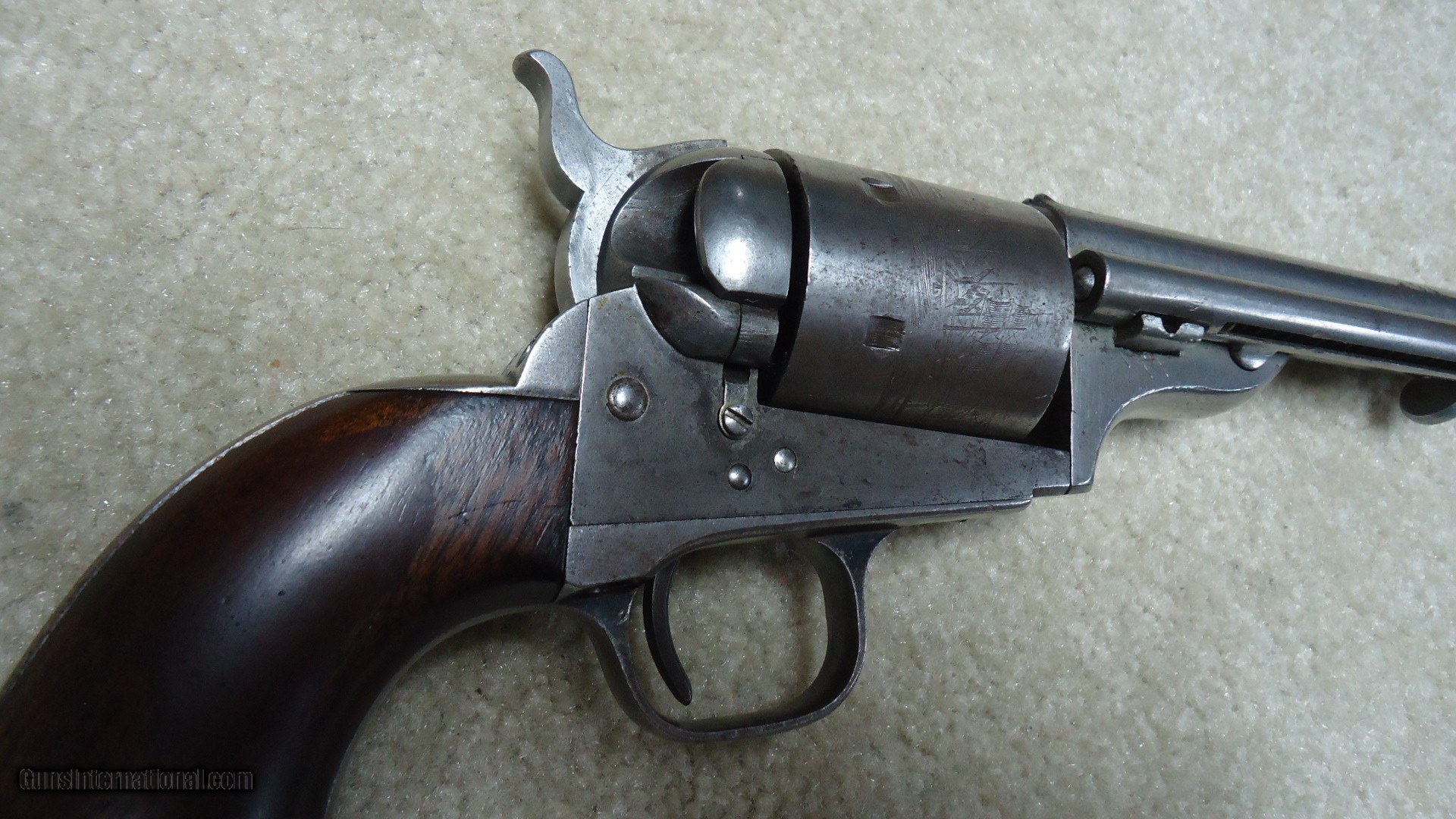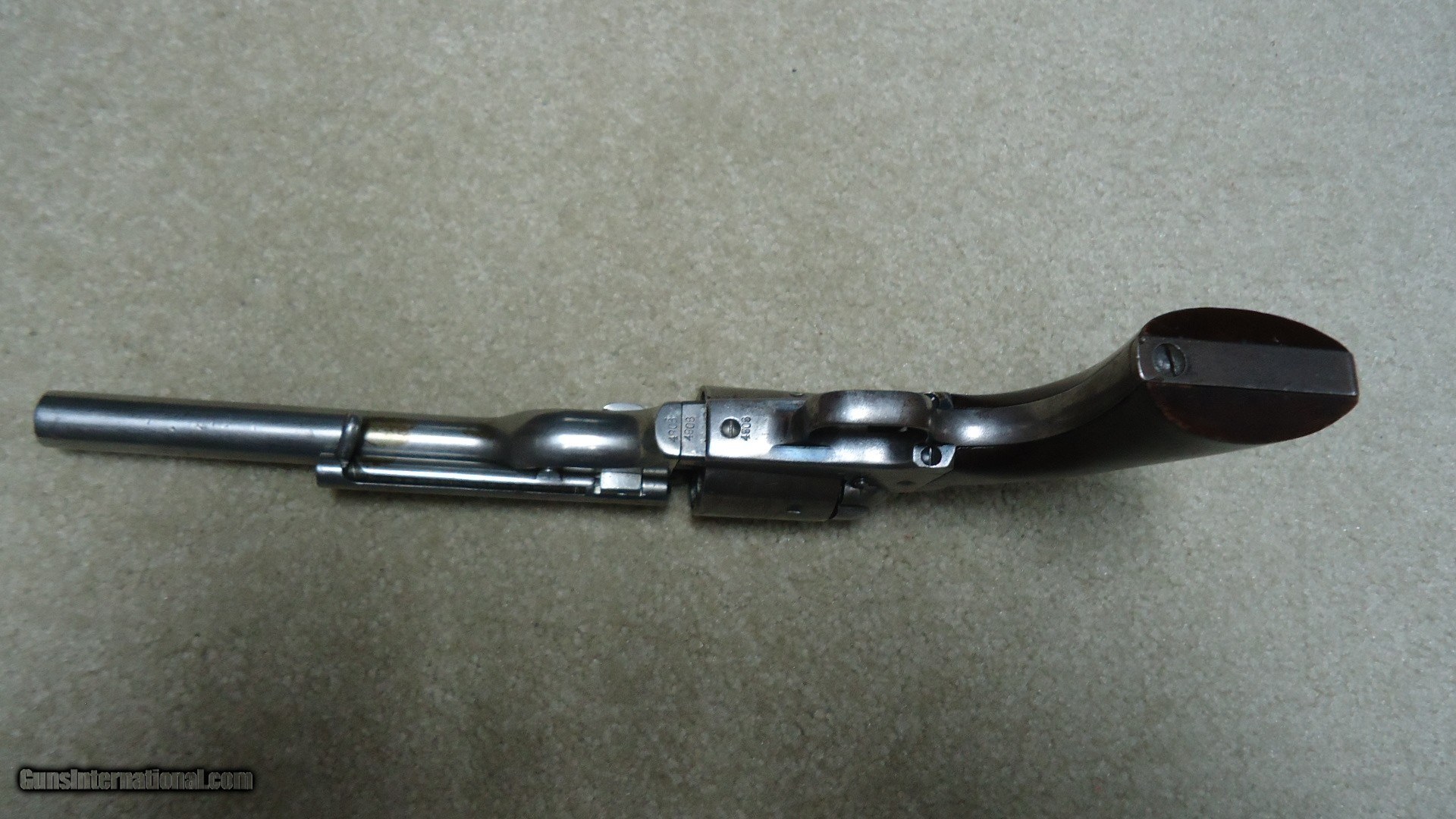 Description: RARE 1871-72 OPEN TOP SINGLE ACTION .44 RF REVOLVER, #40XX, THE PREDECESSOR OF THE GREAT SINGLE ACTION ARMY, ONLY 7000 MADE 1872-1873. These extremely hard to find Colts were very popular in Mexico where many were shipped. Those that came back to the U.S. are often in much abused condition and usually have barrels shortened. This example retains the 7 1/2" barrel and has matching numbers on the frame, cylinder, trigger guard, barrel and back strap. Further, the cylinder retains about all of the roll marked naval engagement scene. The barrel top has the correct Colt New York, U.S. America barrel address and was probably very lightly cleaned at some point. The frame shows the correct 1871 and 1872 patent dates. It also has the correct ejector housing. Metal surfaces are a smooth gray with some traces of blue in the most protected areas mainly around the trigger guard. the one-piece walnut army size grips are excellent and show just a slight undersize which would lead one to believe they were probably freshened at some point. There are still some spots of dried grease on this revolver indicating that it was probably stored for many years. Very tight mechanically with excellent bore. A seldom seen Colt absent from even the most advanced collections. SOLD Antique: Yes Manufacturer: C Model: 1871-72 OPEN TOP Serial Number: 4XXX Barrel Length: 7 1/2 Condition: VG |