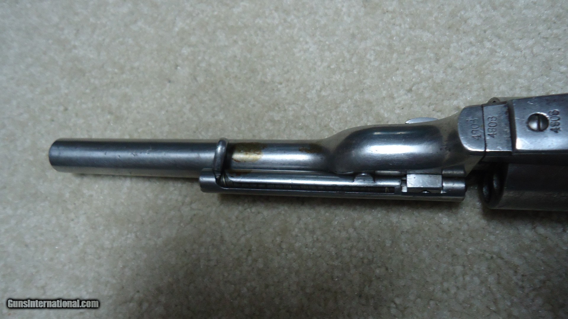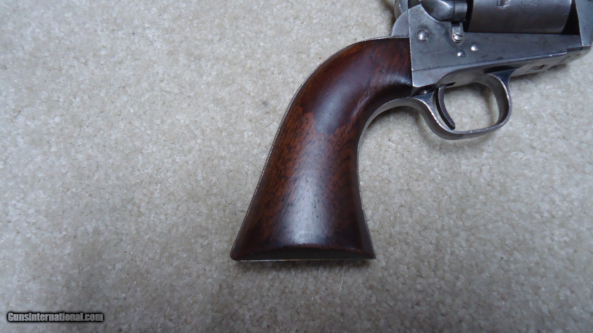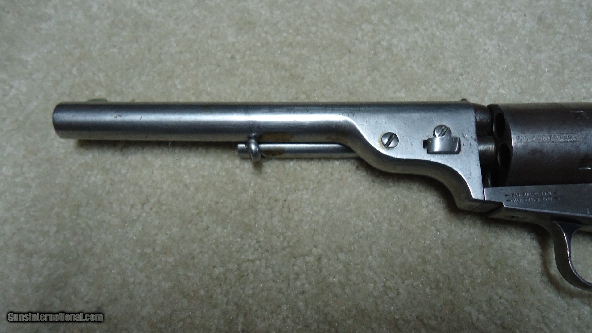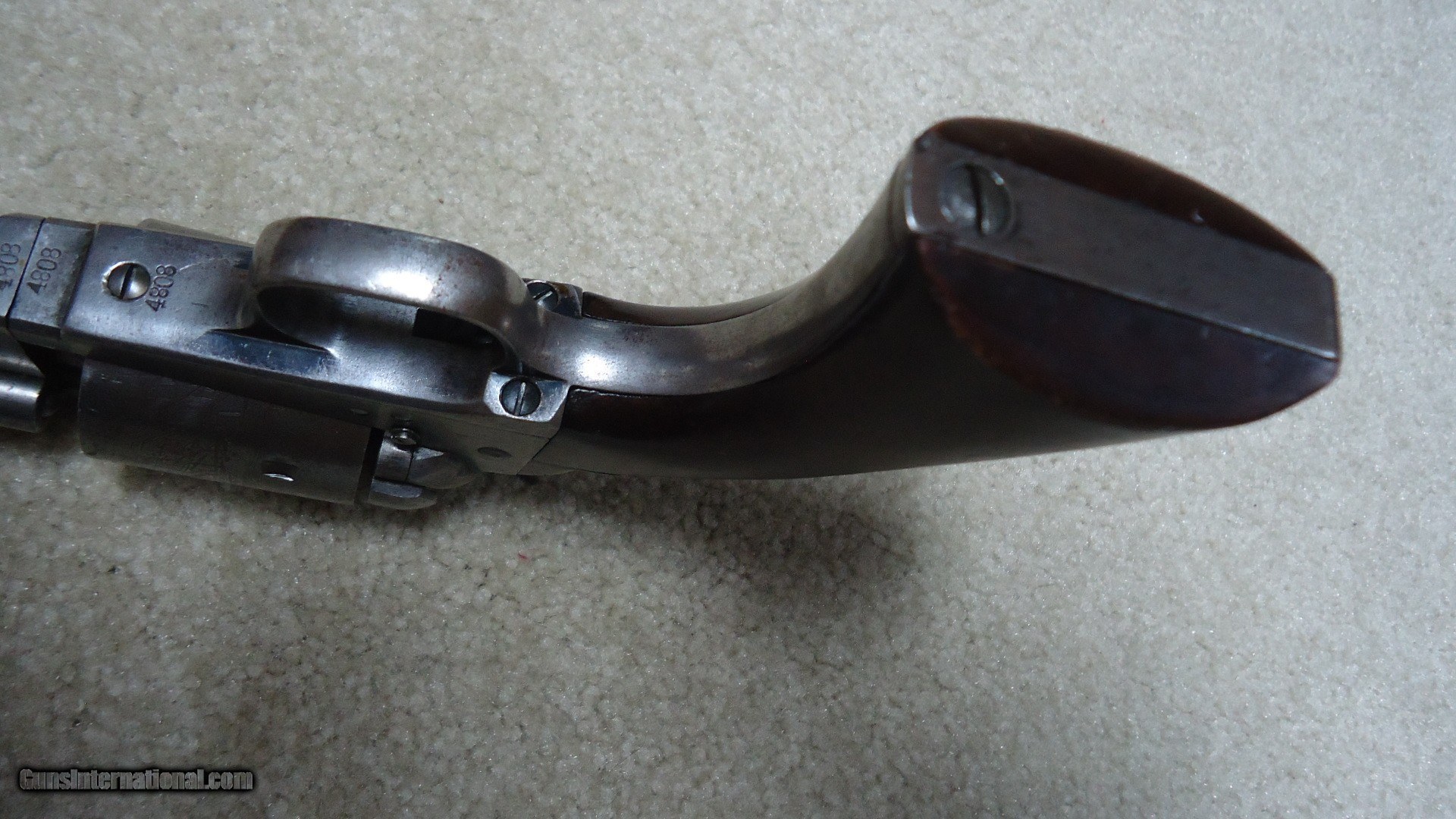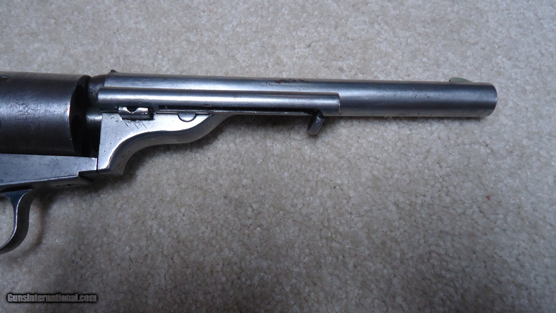 Description: RARE 1871-72 OPEN TOP SINGLE ACTION .44 RF REVOLVER, #40XX, THE PREDECESSOR OF THE GREAT SINGLE ACTION ARMY, ONLY 7000 MADE 1872-1873. These extremely hard to find Colts were very popular in Mexico where many were shipped. Those that came back to the U.S. are often in much abused condition and usually have barrels shortened. This example retains the 7 1/2" barrel and has matching numbers on the frame, cylinder, trigger guard, barrel and back strap. Further, the cylinder retains about all of the roll marked naval engagement scene. The barrel top has the correct Colt New York, U.S. America barrel address and was probably very lightly cleaned at some point. The frame shows the correct 1871 and 1872 patent dates. It also has the correct ejector housing. Metal surfaces are a smooth gray with some traces of blue in the most protected areas mainly around the trigger guard. the one-piece walnut army size grips are excellent and show just a slight undersize which would lead one to believe they were probably freshened at some point. There are still some spots of dried grease on this revolver indicating that it was probably stored for many years. Very tight mechanically with excellent bore. A seldom seen Colt absent from even the most advanced collections. SOLD Antique: Yes Manufacturer: C Model: 1871-72 OPEN TOP Serial Number: 4XXX Barrel Length: 7 1/2 Condition: VG |