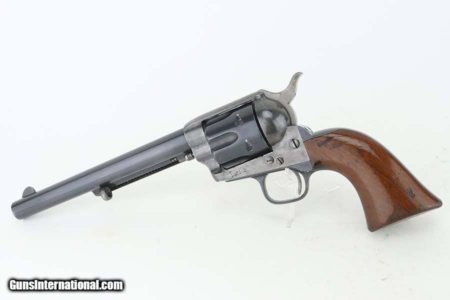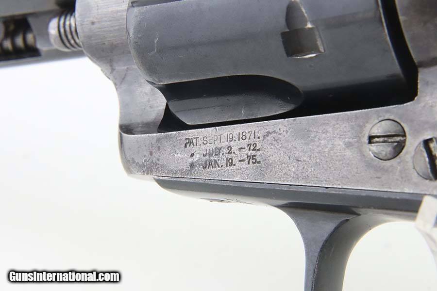 Description: This is an excellent example of a rare 7.5 inch Colt Single Action Army revolver from 1878. According to the included Colt factory letter, this gun was shipped to Schuyler, Hartley Graham (a private distributor) on May 25, 1878, along with 50 other guns. This one has a mixture of military and civilian features. Ours is military inspected "C" (sub inspector Casey), "P", and "J.T.C."(sub inspector John T Cleveland) on the barrel. "LD" on the frame with a "C" in the middle. We're told this means it is a condemned gun. It does not have a "US" property marking and does have a ".45 Cal" civilian marking on the left side of the trigger guard. All parts are numbered and matching. The overall condition of this one is excellent for its age. Most of the bluing remains, but the case-hardening on the frame is worn. Fitted with wood grips. Minty bore. Fully functional. SOLD Curio/Relic: Yes Antique: Yes Handgun Caliber: .45 Colt |