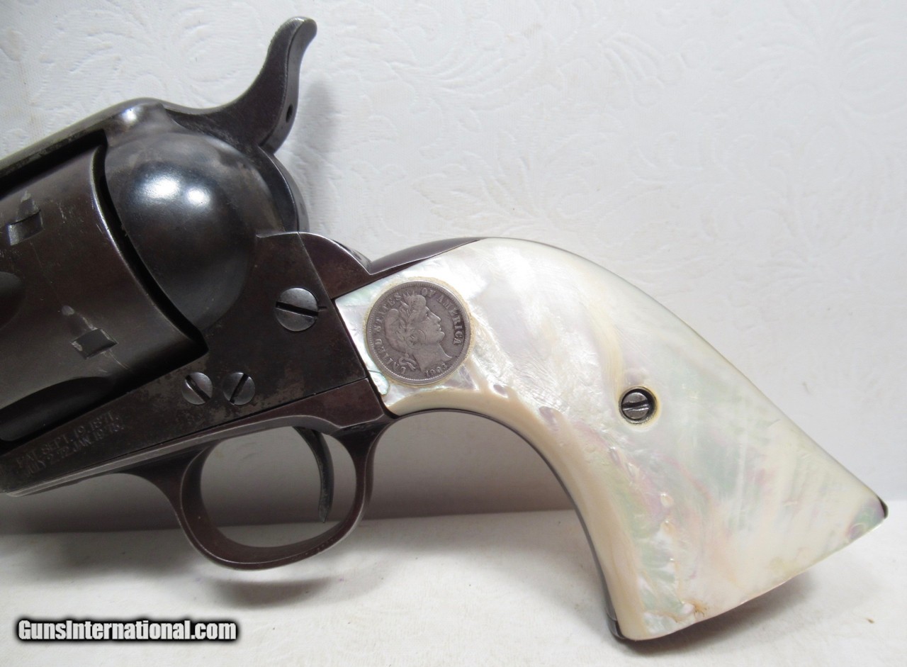Description: Colt Single Action Army Revolver; Serial No. 205204; Antique by Caliber and Design; Per Included Factory Letter: .44 Russian Caliber with 5 ½” Barrel and Blue Finish; Shipped to Roberts, Sanford & Taylor of Sherman, Texas C/O: Tom Bailey on January 29, 1901 as a One Gun Shipment; Tom Bailey is Documented as Being Involved in the Johnson County, Wyoming Powder River Range War – Many Documents Available On-Line; He Was Described as a Resilient Defender with Fellow Settlers Defying the Powerful Cattle Interests; This Great Old Colt is Un-Cleaned, Un-Altered, Un-Polished with Original .44 Russian Short Chamber Cylinder; Metal is a Dark Patina; All Matching; Perfect Action; Good Bore with some chattering; Great Old Carved Steer Head Pearl Grips with 1903 Barber Dime on Left Grip; Not Original to Gun but Fit Great and Look Sharp; Rare Opportunity to Own a Documented .44 Russian Caliber Colt Revolver with Johnson County, Wy. Range War History; See All Photos for Condition; No Texts; Call (254)541-5765 or Email Only; PERSONAL PROPERTY of Harold Wieser; NOTICE: We Do Not Do Any Consignments - All Items Listed are Owned by Us - NO SALES to New Jersey or New York City - Antiques Only to Massachusetts and California; NOTE: All Modern Firearms Must Go to FFL Dealer who will Accept From Individual with Texas Driver License; Price: $24,975 Shipped; Payment Address: Harold Wieser - 1466 U.S. Hwy 77 - Rosebud, TX 76570; SEND PAYMENTS VIA USPS PRIORITY MAIL; BEWARE of SCAMS!!! - DO NOT SEND MONEY or CORRESPONDENTS ELECTRONICALLY UNLESS YOU HAVE SPOKEN to HAROLD WIESER FIRST! (254)541-5765 SOLD Manufacturer: Colt Model: 1873 S.A.A. Serial Number: 205204 |