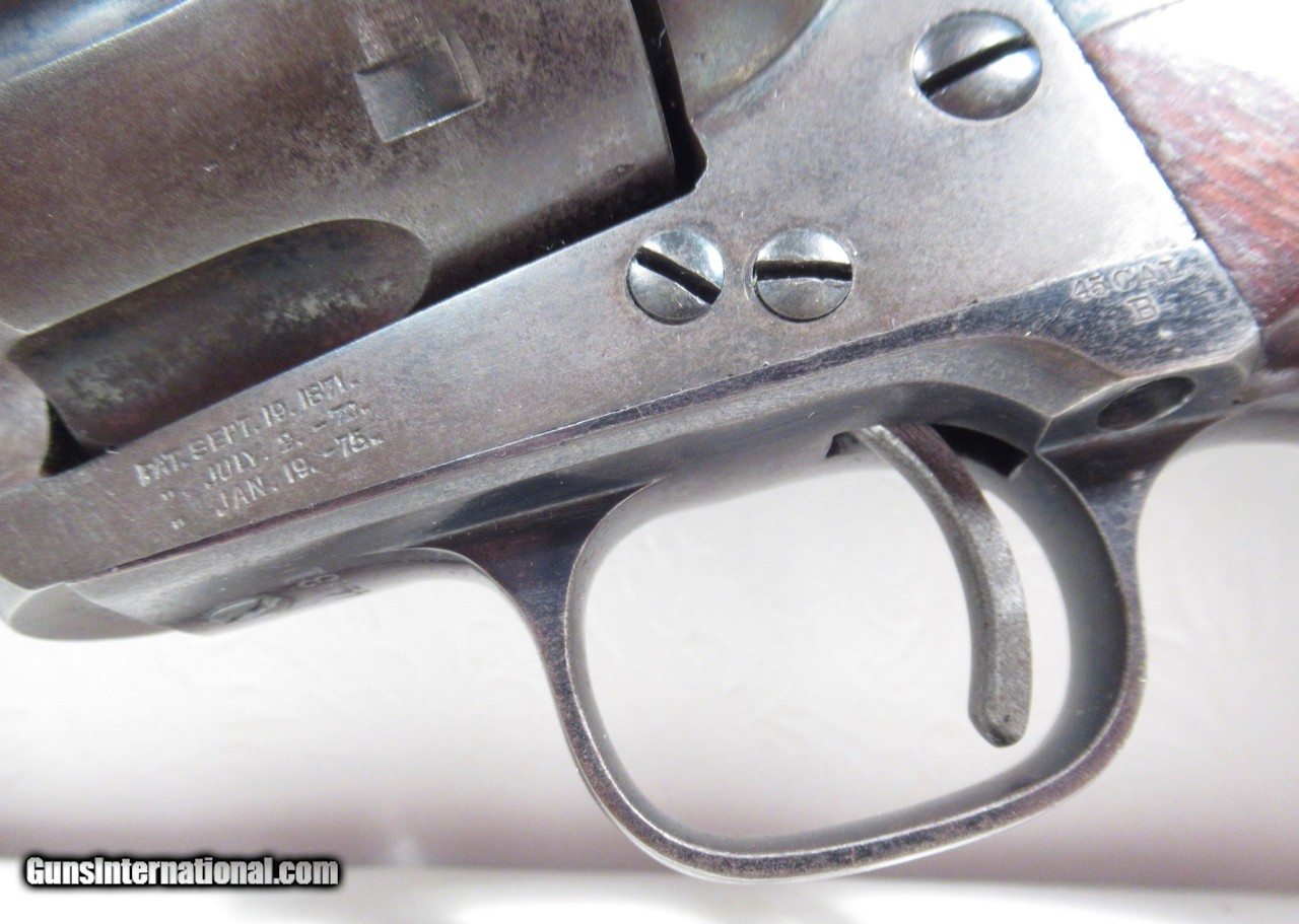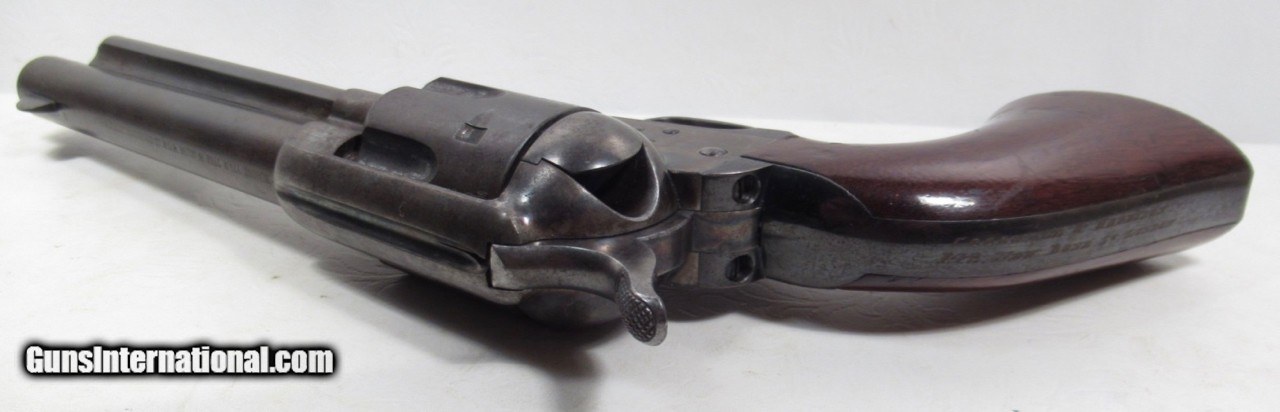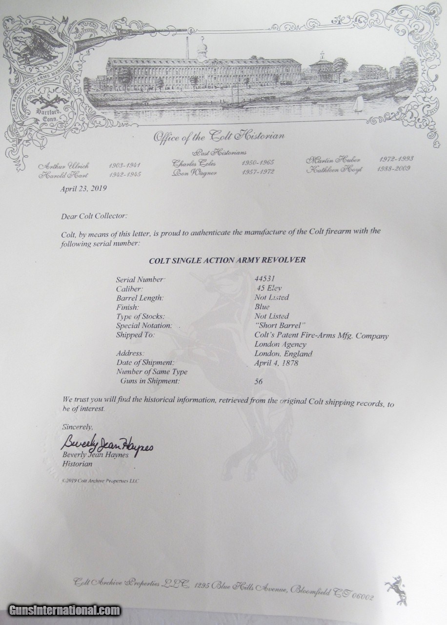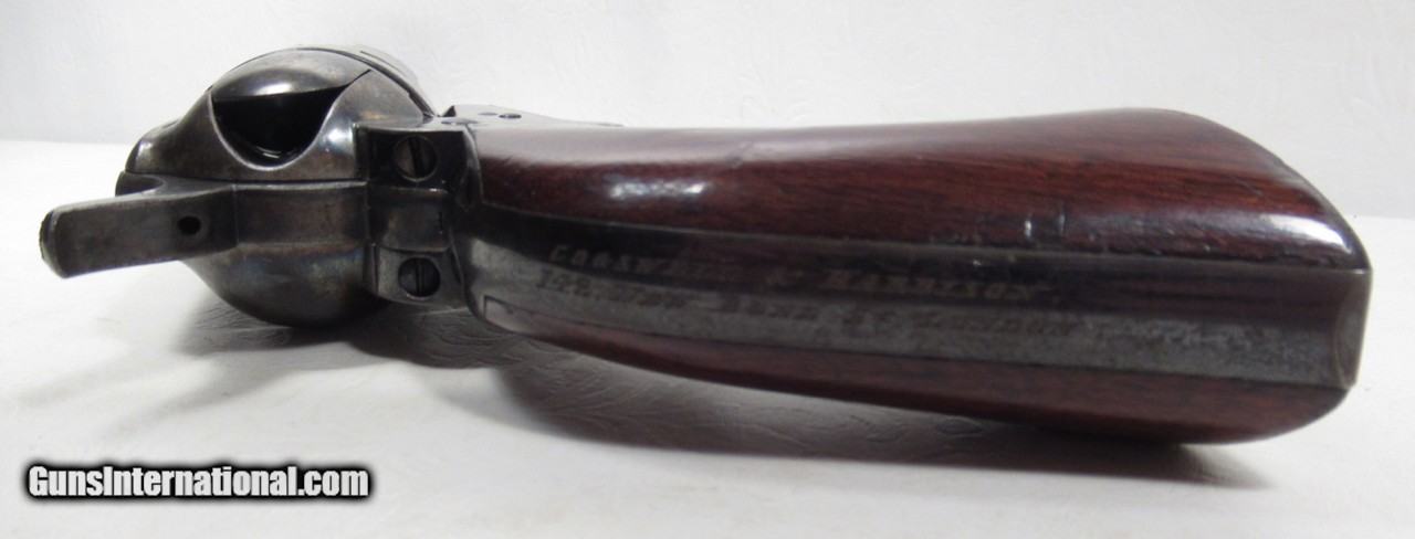 Description: Colt Single Action Army; Serial No. 44531; Per Factory Letter Included: .45 Eley Caliber with Blue Finish and Special Letter Notation “Short Barrel”; Shipped to Colt’s London, England Agency on April 4, 1878; Engraved on Backstrap “Cogswell & Harrison 142 New Bond St. London”; Note on Cogswell & Harrison Records Indicates Possession of CSA44531 in Their Inventory on April 22, 1879; 100% Correct and Matching; Lots of Original Metal Finish Remains; All Original Varnish on Grips; Perfect Action and Bore; Very Rare 144 Year-Old London, England Shipped Colt S.A.A. Revolver; See All Photos for Condition; No Texts; Call (254)541-5765 or Email Only; PERSONAL PROPERTY of Harold Wieser; Price: $17,775 + $45 S&H Via USPS PRIORITY MAIL; Payment Address: Harold Wieser - 1466 U.S. Hwy 77 - Rosebud, TX 76570; SEND PAYMENTS VIA USPS PRIORITY MAIL; BEWARE of SCAMS!!! – DO NOT SEND MONEY or CORRESPONDENTS ELECTRONICALLY UNLESS YOU HAVE SPOKEN to HAROLD WIESER FIRST! 254-541-5765 SOLD Antique: Yes Manufacturer: Colt Model: 1873 Serial Number: 44531 |