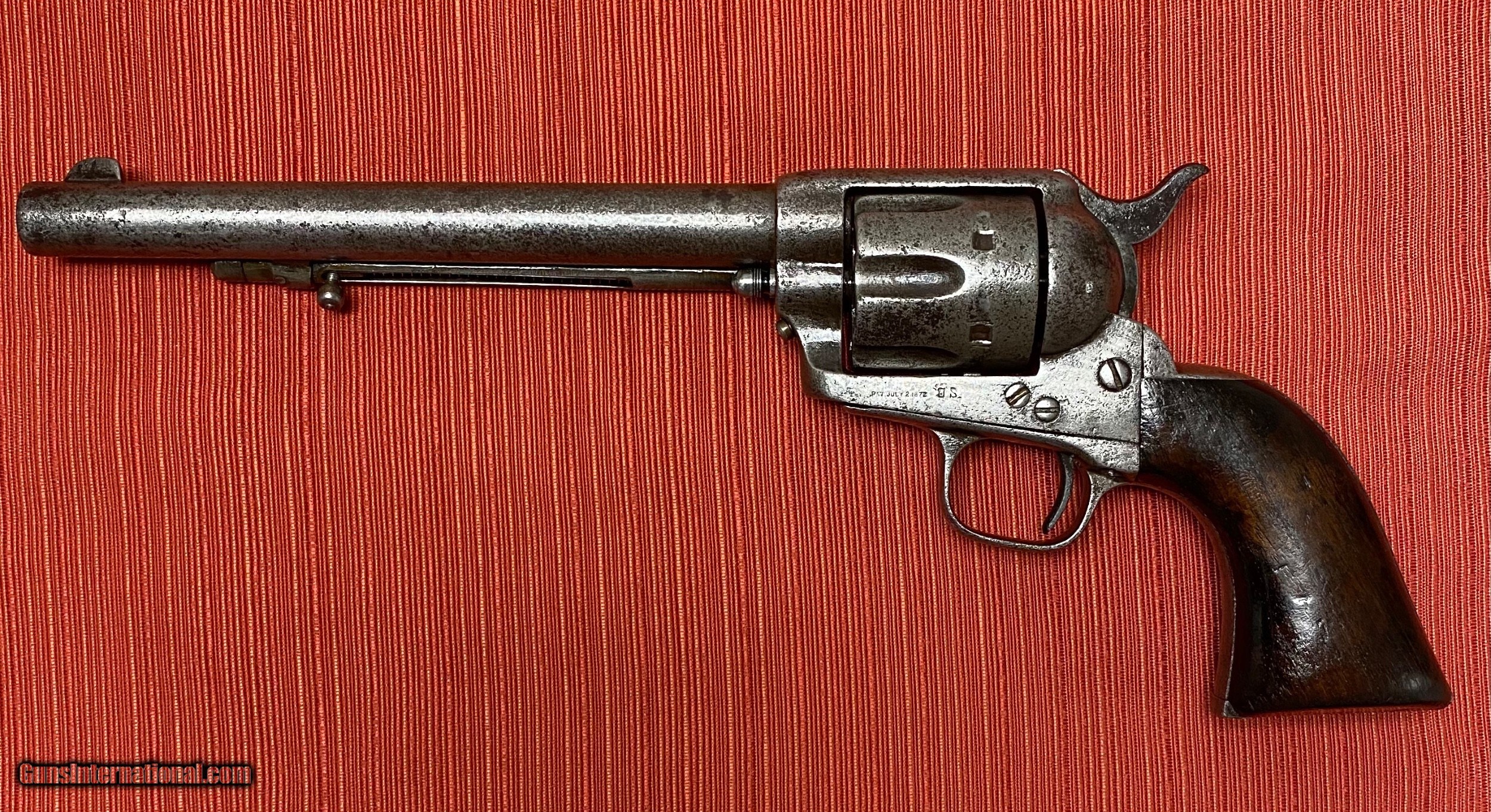 Description: Rare Colt Ainsworth SAA U.S. Cavalry .45 revolver with letter of authenticity from John Kopec. Manufactured in 1874 during the 2nd year of production. All matching number gun with a four digit serial number along with multiple Ainsworth markings. Extremely rare revolver in any condition. This one does function with a fairly tight lock up and has all four Colt clicks. Overall antique condition has a rating of fair to good from Flayderman's guide to Antique American Firearms. This is an original Colt Cavalry revolver and not a Colt artillery model and is a very collectible early U.S. Cavalry revolver. Blue Book Values Guide has listed the Ainsworth SAA Colt in the five figure range even when in 10% antique condition. We have listed this early four digit Colt SAA at a much lower price since an early replacement was made on the ejector. (see Kopec LOA). Great entry level U.S. Cavalry collectible. Price includes insured shipping within the USA. SOLD Curio/Relic: Yes Antique: Yes Handgun Caliber: .45 Colt Manufacturer: Colt Model: SAA Serial Number: 9707 Barrel Length: 7 1/2” Chambers: Six Condition: Fair/Good Metal Condition: Fair/Good Wood Condition: Fair/Good Bore Condition: Fair/Good Action: SA Manufacture Date: 1874 Item Location: WV |