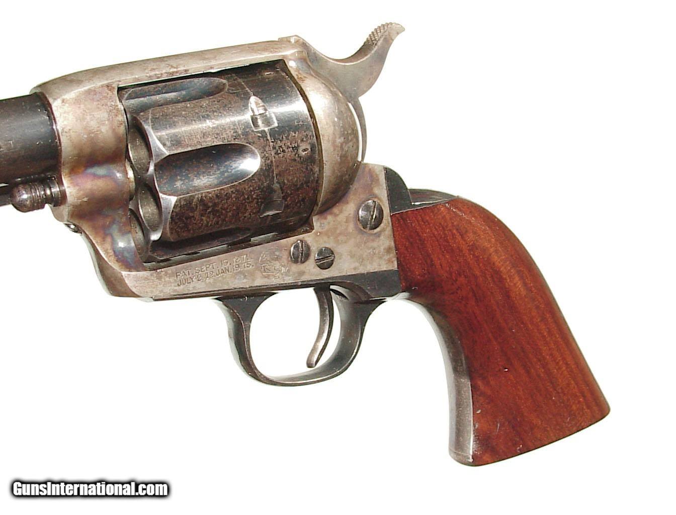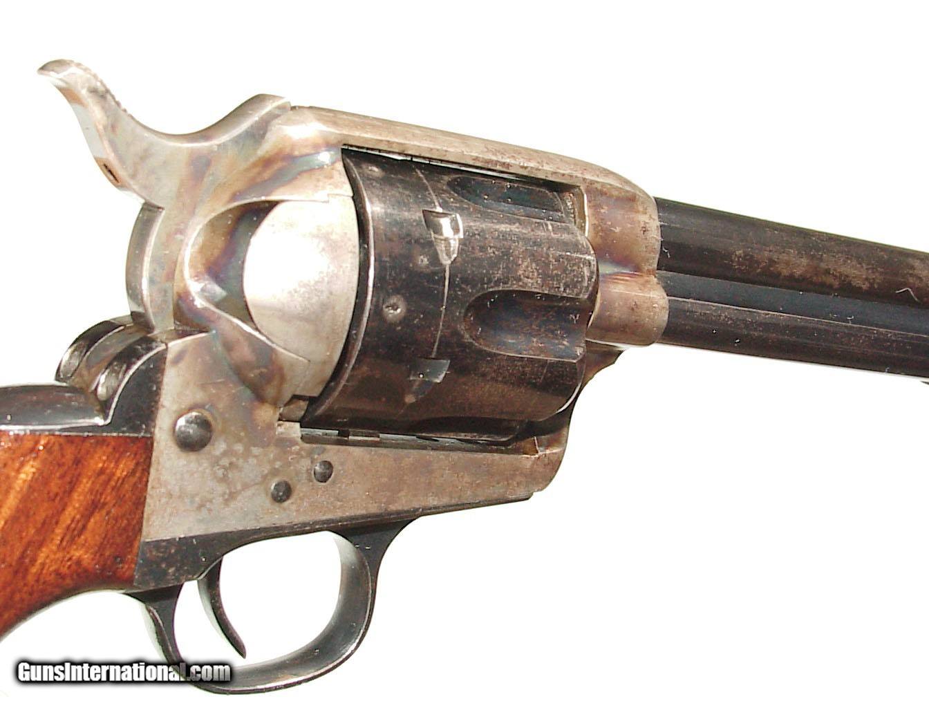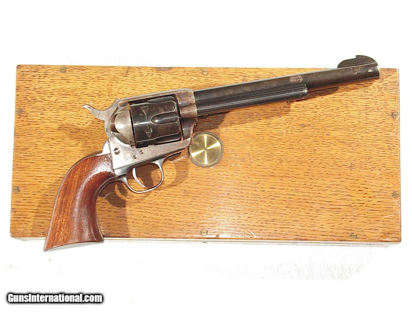 Description: .455 Eley ctg., 7 1/2" barrel with rare Winans front sight. Factory Medford rifling with right hand twist. Blue and casehardened finish and wooden grips. The barrel retains 80-85% plus blue, the cylinder more. The straps have 95% plus blue and frame with excellent case colors remaining. Mint bore. In it's original London Agency box and label with accessories, all excellent. A similar Walter Winans revolver was offered in 2009 at Morphy's and is 15 numbers apart from this one. Walter Winans was born April 5, 1852 in St. Petersburg, Russia to American parents while his father was working on the Russian railroad system. He was immensely talented in a number of fields including art, sculpting, equestrian and pistol & rifle shooting. In the 1908 Summer Olympics he won an Olympic Gold Medal for rifle shooting and in the 1912 Olympics he won a silver medal in a similar event. Over his career Mr. Winans won numerous shooting matches in both rifle & pistol and inventing several different styles of sights for handguns like the one on this revolver. He was also a noted author writing several works relating to firearms and shooting. He died in 1920 while participating in a trotting race in London. SOLD Antique: Yes |