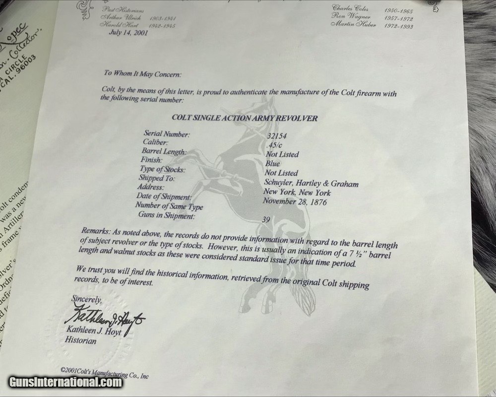 Description: RARE Colt Single Action Army, CAL: 45 COLT, MFG: 1876, SN: 32154, Single Action Revolver, 7 1/2'' barrel. The walnut grips are good, displaying good traces of commercially applied varnish finish with minor nicks, edge chipping & dings. There are two deeper scratches at the bottom of the right grip panel. The metal finish has mostly worn to a gun metal gray, with some blue-brown patina in protected areas. The metal surfaces have areas of old rust pitting & speckling. Bore is good, with solid rifling that have darkened amongst some pitting. Matching SN stamped or partial on frame, trigger guard, cylinder & backstrap. Revolver comes with Colt authentication letter dated July 14, 2001 from Kathleen J. Hoyt, Colt Historian. It indicates this revolver was shipped to the famed Schuyler, Hartley & Graham New York, New York on November 28, 1876, in a shipment of 39 guns. It also has a detailed letter from John A Kopec, giving history & condition of this specific revolver. He discusses production issues during the period this pistol was produced & explains the ''C'' stamping above the inspectors mark and what that meant. He discusses the ''Nice original condition'' & what he has observed. This is a very nice example of a colt single action in original condition & with two nice letters.* Antique NO FFL Req Add 3% if paying with credit card. God Bless America from a proud American, and a Viet Nam Vet , thankful for our freedoms.. paid for by the Blood ,Sweat and Tears of our brave men and women in uniform. Ten Below Firearms is a Veteran owned and operated business. We specialize in out of production models of high quality firearms. We love to ship! If you are out of state or can't make it to our store, just give us a call! Handguns normally ship for $30 and Long guns for $40 to $65 for extra length long guns. That's 2-3 day USPS Priority shipping, Delivery conformation and with tracking number. Optional Postal insurance is additional $1.70 per $100 and highly recommended. We are OPEN BY APPOINTMENT ONLY FOR IN PERSON VISITS SOLD Antique: Yes Handgun Caliber: .45 Colt Manufacturer: Colt Model: 1873 SAA Serial Number: 32154 Barrel Length: 7.5 inch Condition: Very good plus Metal Condition: Very good Wood Condition: Very good Bore Condition: Very good Finish: Blued Sights: Fixed Manufacture Date: 1876 Item Location: Mn |