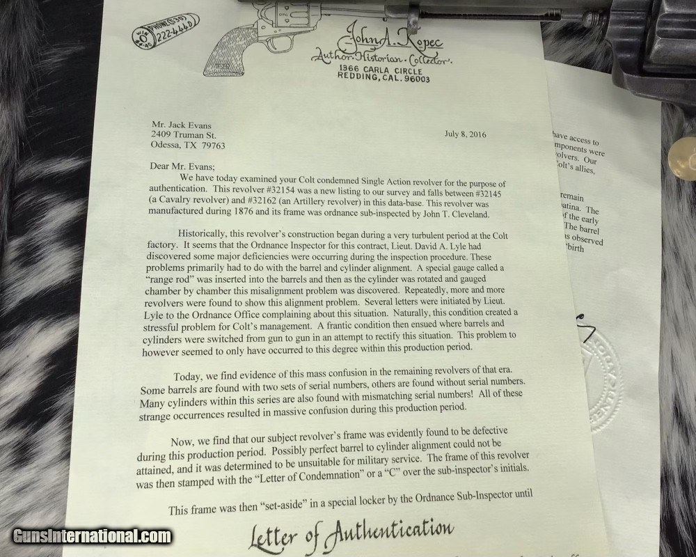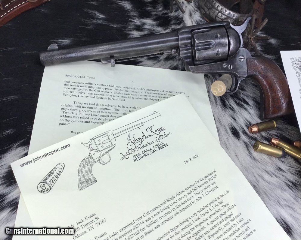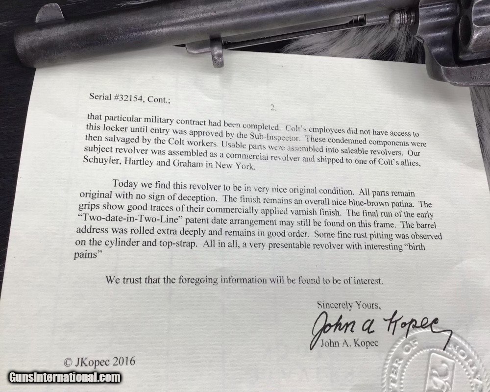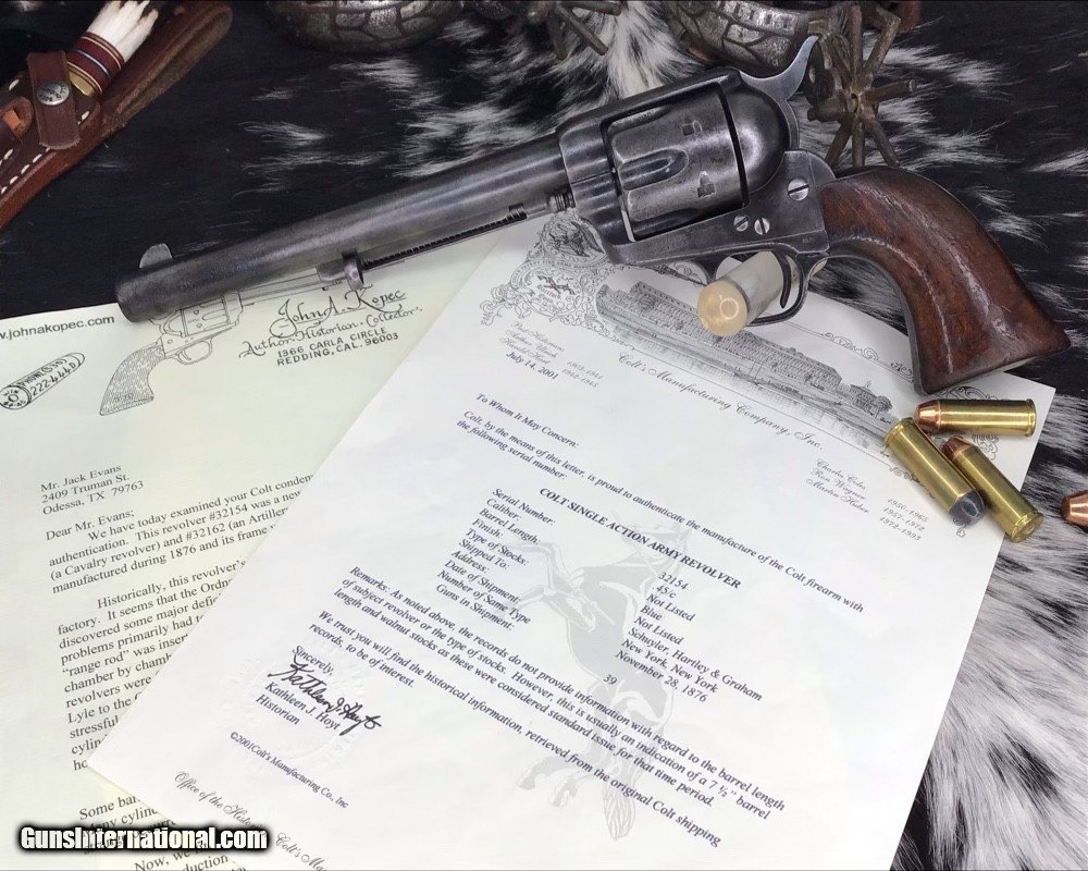 RARE Colt Single Action Army, CAL: 45 COLT, MFG: 1876, SN: 32154.W/ Kopeck and Colt Letters