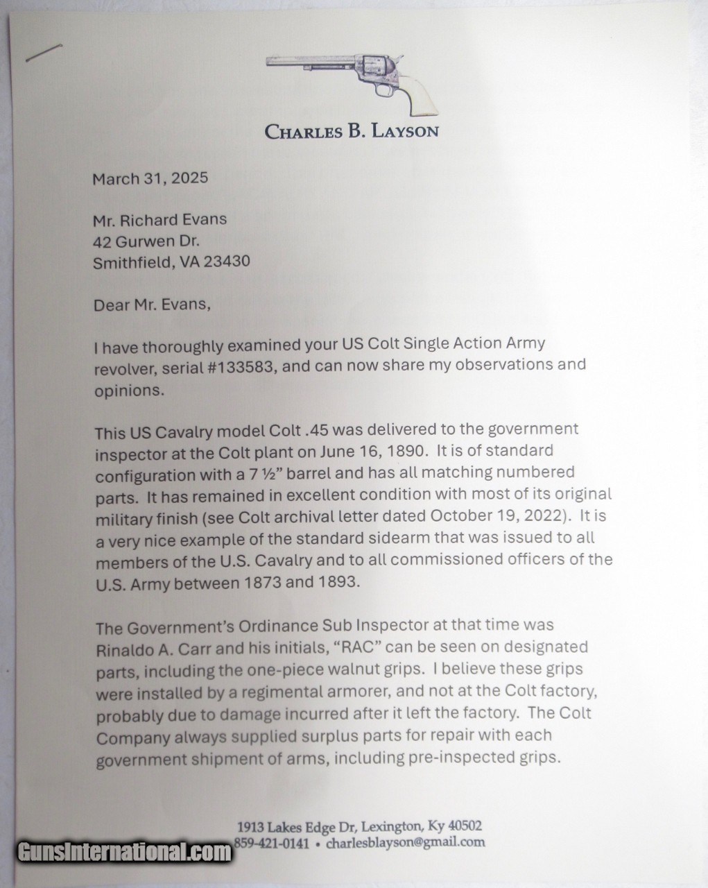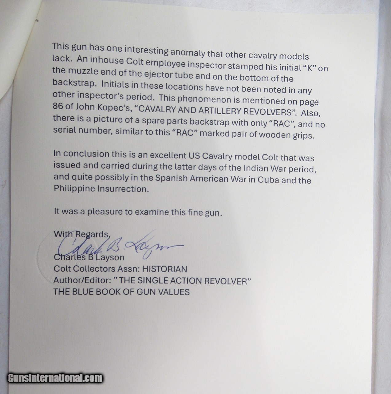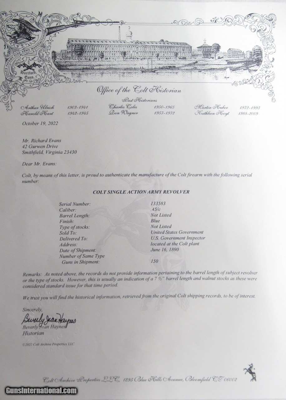 Colt Single Action Army Revolver; Serial No. 133583; Factory Letter Plus Signed and Stamped Letter From Noted Colt Authority Charles B. Layson Included; Shipped June 16, 1890; 100% Correct and Original; Nearly All Original Colt Military Finish Remains; Case Colors Faded Except in Protected Areas; Perfect Action and Bore; See All Photos for Condition; No Texts; Call (254)541-5765 or Email Only; PERSONAL PROPERTY of Harold Wieser; NOTICE: We Do Not Do Any Consignments - All Items Listed are Owned by Us - NO SALES to New Jersey or New York City - Antiques Only to Massachusetts and California; NOTE: All Modern Firearms Must Go to FFL Dealer who will Accept From Individual with Texas Driver License; Price: $19,975 + $50 S&H Via USPS Priority Mail; Payment Address: Harold Wieser - 1466 U.S. Hwy 77 - Rosebud, TX 76570; SEND PAYMENTS VIA USPS PRIORITY MAIL; BEWARE of SCAMS!!! - DO NOT SEND MONEY or CORRESPONDENTS ELECTRONICALLY UNLESS YOU HAVE SPOKEN to HAROLD WIESER FIRST! (254)541-5765