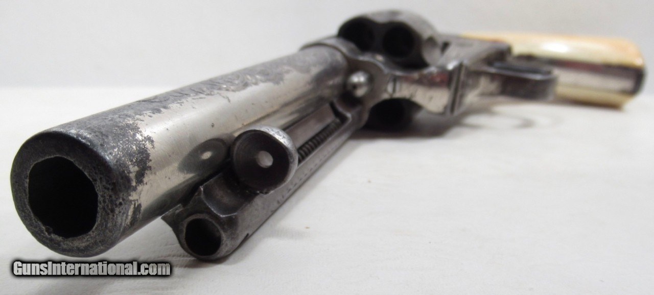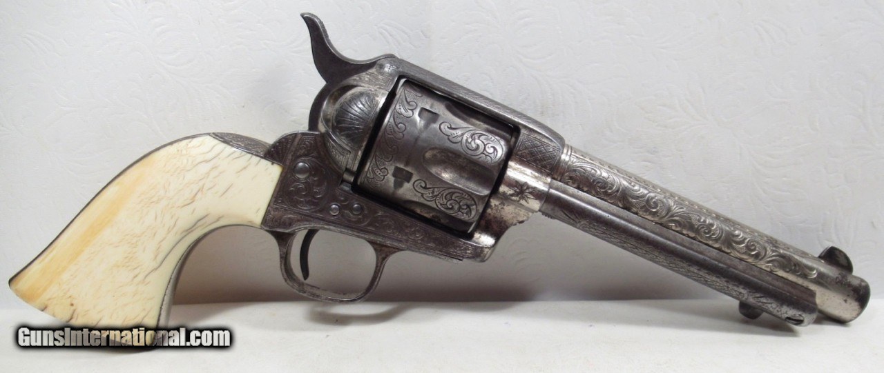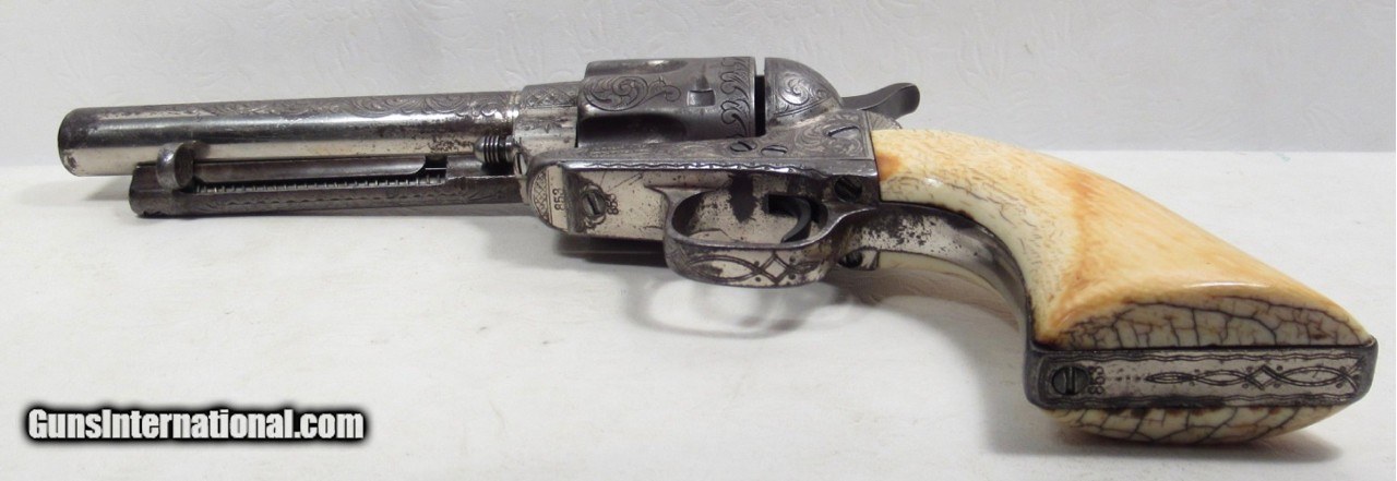 Description: Colt Single Action Army Revolver; Serial No. 853; Per Included Factory Letter: .44 Rimfire Caliber with 7 ½” Barrel and Blue Finish with Wood Stocks; Shipped to Schuyler, Hartley & Graham of New York, NY on November 30, 1877 as Part of a 50 Gun Shipment; This Fine Colt has had the Barrel Shortened to 5 ½”, Replaced Front Sight, Converted to 44 Center Fire and Engraved by L.D. Nimschke; Nickle Plated; Fine Old Ivory Grips; Perfect Action; Strong Bore with some Black Powder roughness; Super Rare 145 Year-Old Colt; Very Colorful; See All Photos for Condition; No Texts; Call (254)541-5765 or Email Only; PERSONAL PROPERTY of Harold Wieser; NOTICE: We Do Not Do Any Consignments - All Items Listed are Owned by Us - NO SALES to New Jersey or New York City - Antiques Only to Massachusetts and California; Price: $16,975 + $45 S&H Via USPS PRIORITY MAIL; Payment Address: Harold Wieser - 1466 U.S. Hwy 77 - Rosebud, TX 76570; SEND PAYMENTS VIA USPS PRIORITY MAIL; BEWARE of SCAMS!!! – DO NOT SEND MONEY or CORRESPONDENTS ELECTRONICALLY UNLESS YOU HAVE SPOKEN to HAROLD WIESER FIRST! 254-541-5765 SOLD Antique: Yes Manufacturer: Colt Model: 1873 Serial Number: 853 |