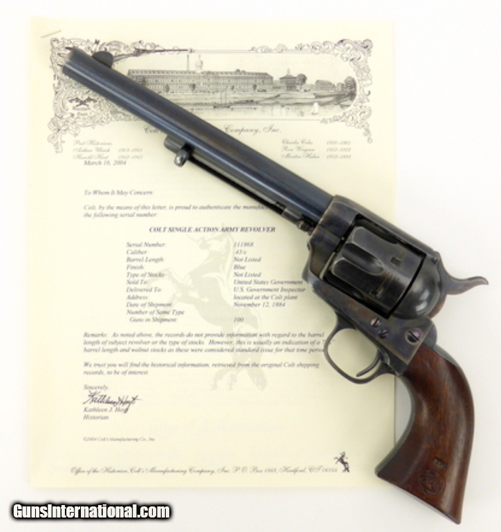 Superb Colt 1873 Single Action Army Cavalry Model revolver. Made in 1886. About as good as you could ask for! Bright brilliant case colors, excellent original blue; very fantastic condition. Only hints of light thinning on the back strap. All in all this gun rates in the high 90%s. This gun comes with a factory letter as well as a Kopec letter confirming the authenticity of the gun. A truly fantastic weapon!