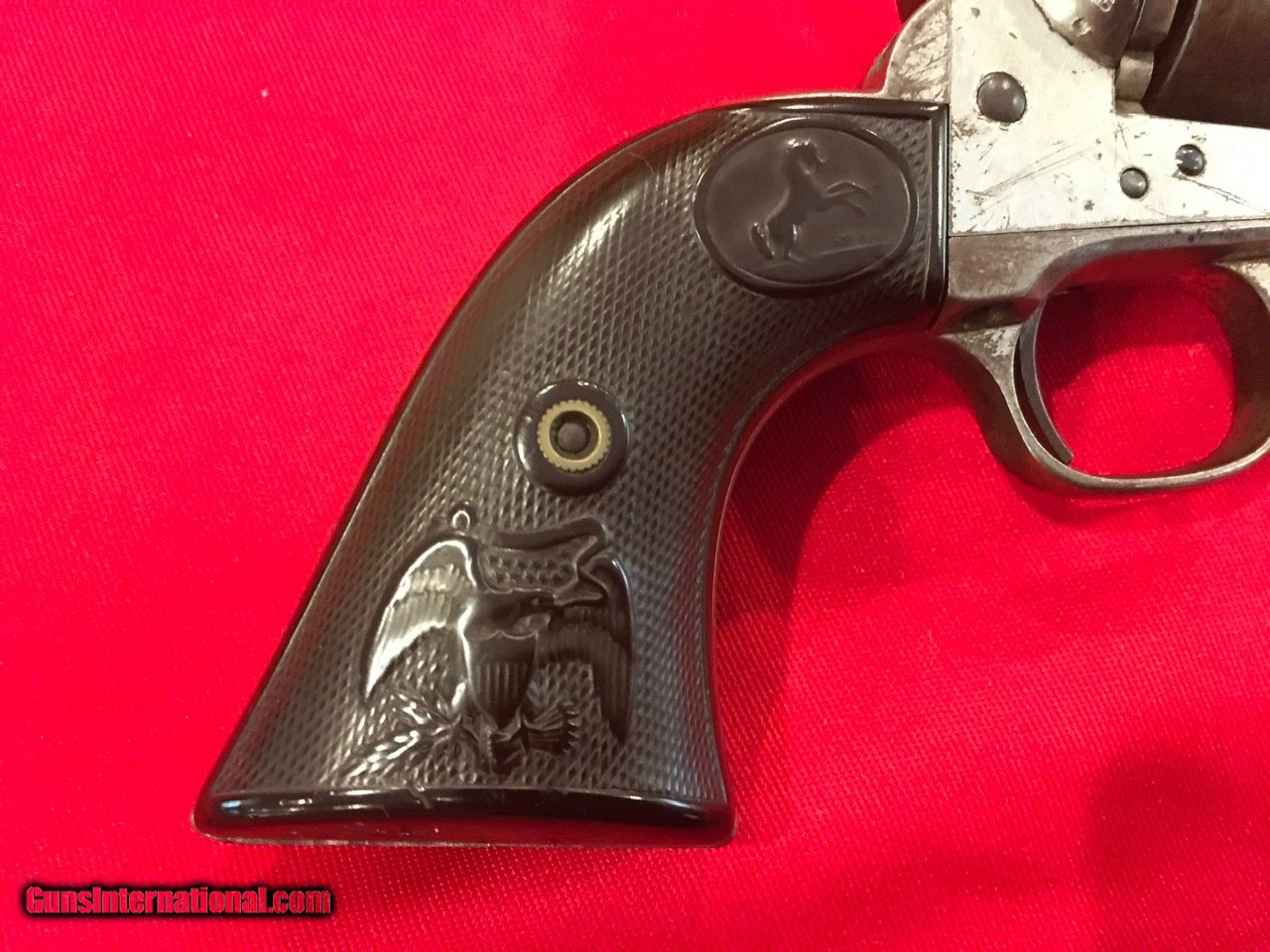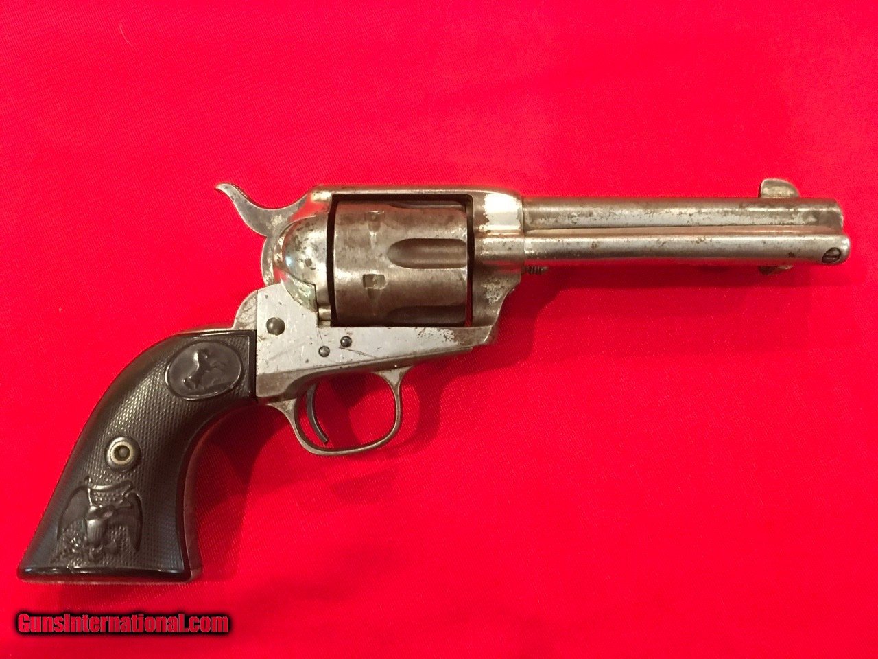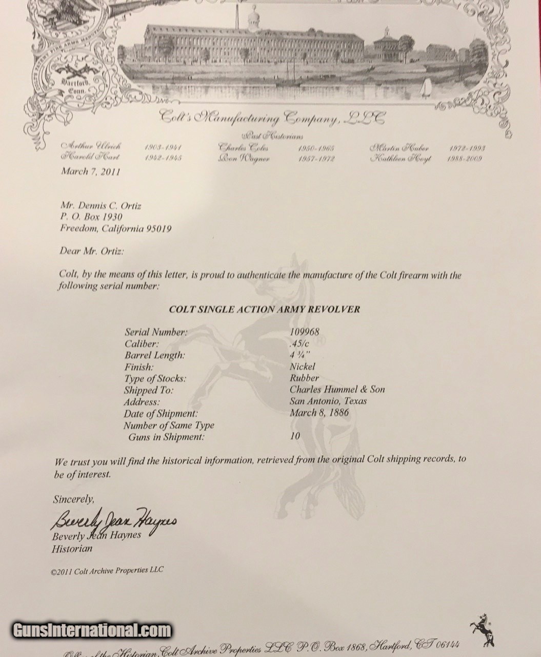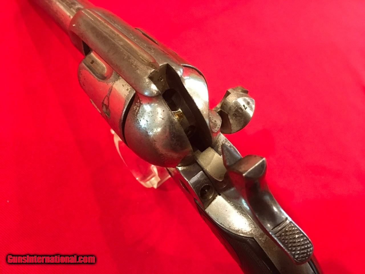 Description: Antique, Colt Single Action Army, serial number 109968 that matches on the frame, triggerguard and backstrap. Comes with a Colt Archive letter that confirms the features as .45/c caliber, 4 3/4" barrel, nickel finish with rubber stocks that shipped to Charles Hummel & Son in San Antonio, TX on March 8, 1886 in a shipment of 10 guns. The rubber stocks are slightly undersized on the bottom. The factory applied markings are all clear and readable. The action functions properly with a very small amount of play in the cylinder. The bore is good with only very minor oxidation. There is a very good amount of original nickel remaining. Price includes insurance and shipping to the continental United States where legal. A three day inspection is offered with full refund if returned unfired in the same condition. Buyer to pay return shipping. Please let me know if you have any questions or need additional photos. SOLD Antique: Yes |