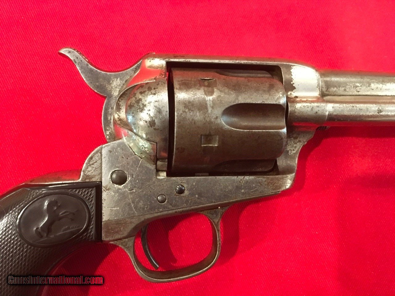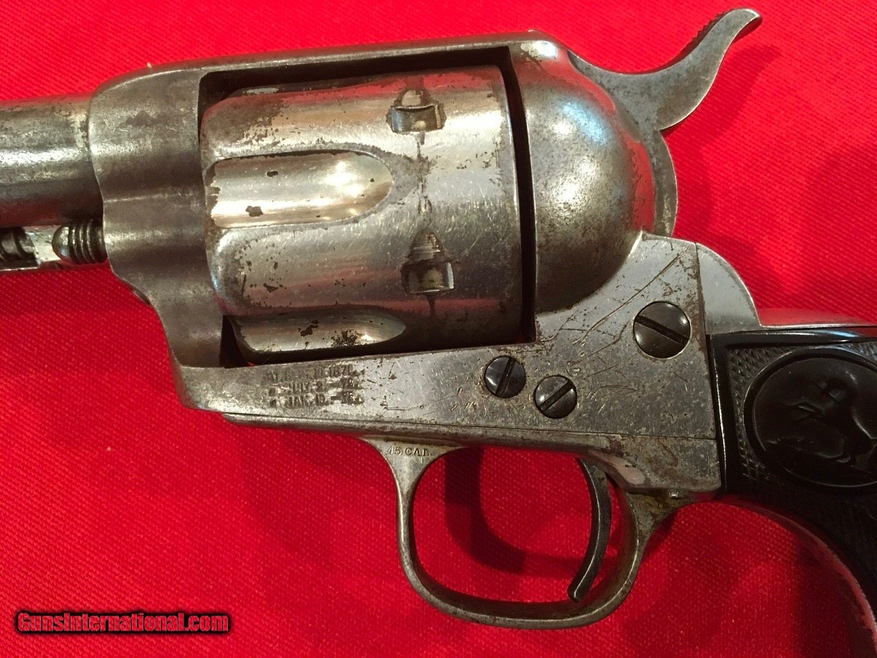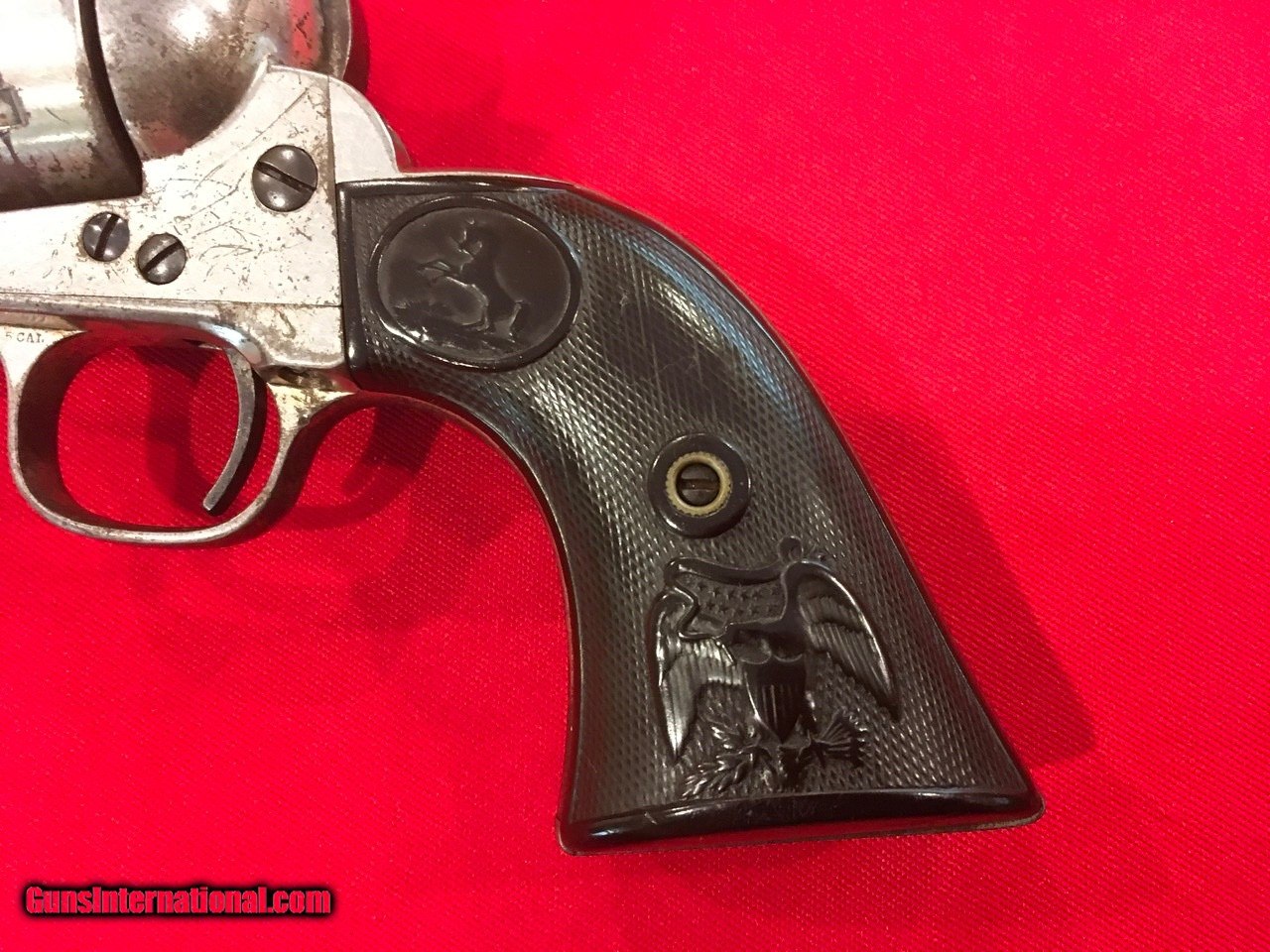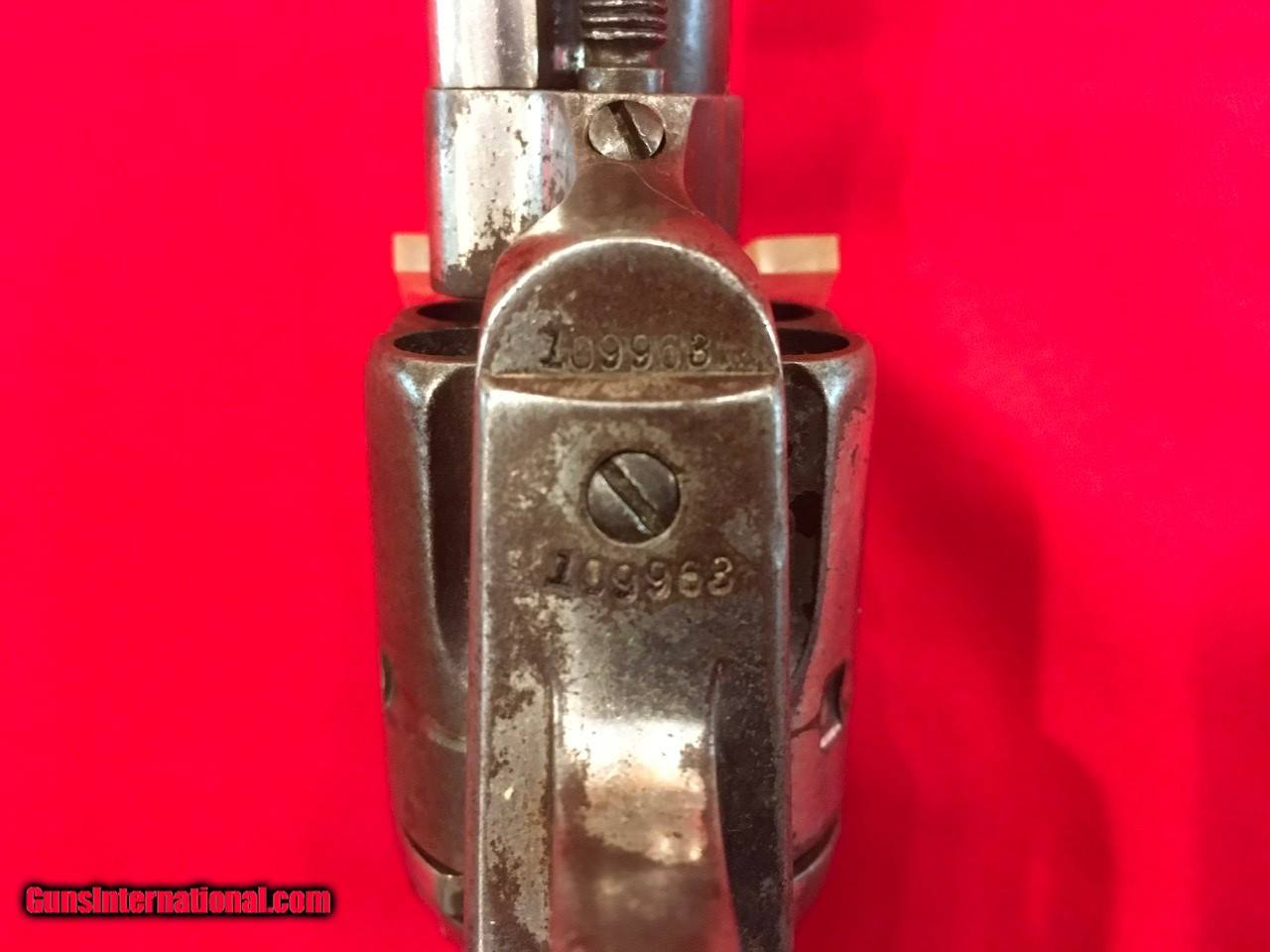 Description: Antique, Colt Single Action Army, serial number 109968 that matches on the frame, triggerguard and backstrap. Comes with a Colt Archive letter that confirms the features as .45/c caliber, 4 3/4" barrel, nickel finish with rubber stocks that shipped to Charles Hummel & Son in San Antonio, TX on March 8, 1886 in a shipment of 10 guns. The rubber stocks are slightly undersized on the bottom. The factory applied markings are all clear and readable. The action functions properly with a very small amount of play in the cylinder. The bore is good with only very minor oxidation. There is a very good amount of original nickel remaining. Price includes insurance and shipping to the continental United States where legal. A three day inspection is offered with full refund if returned unfired in the same condition. Buyer to pay return shipping. Please let me know if you have any questions or need additional photos. SOLD Antique: Yes |