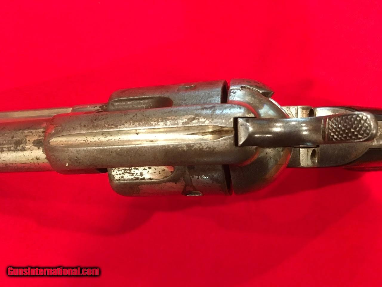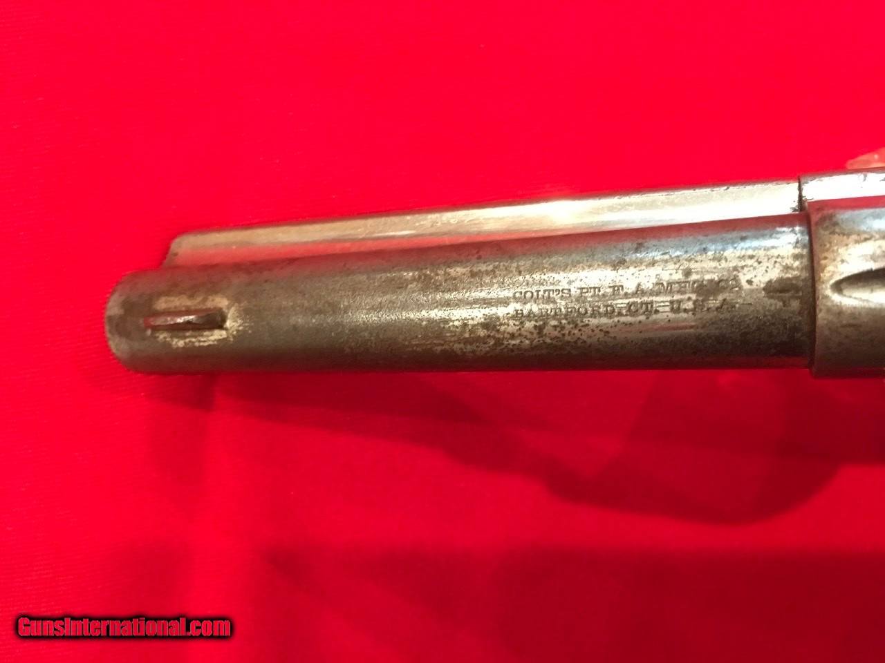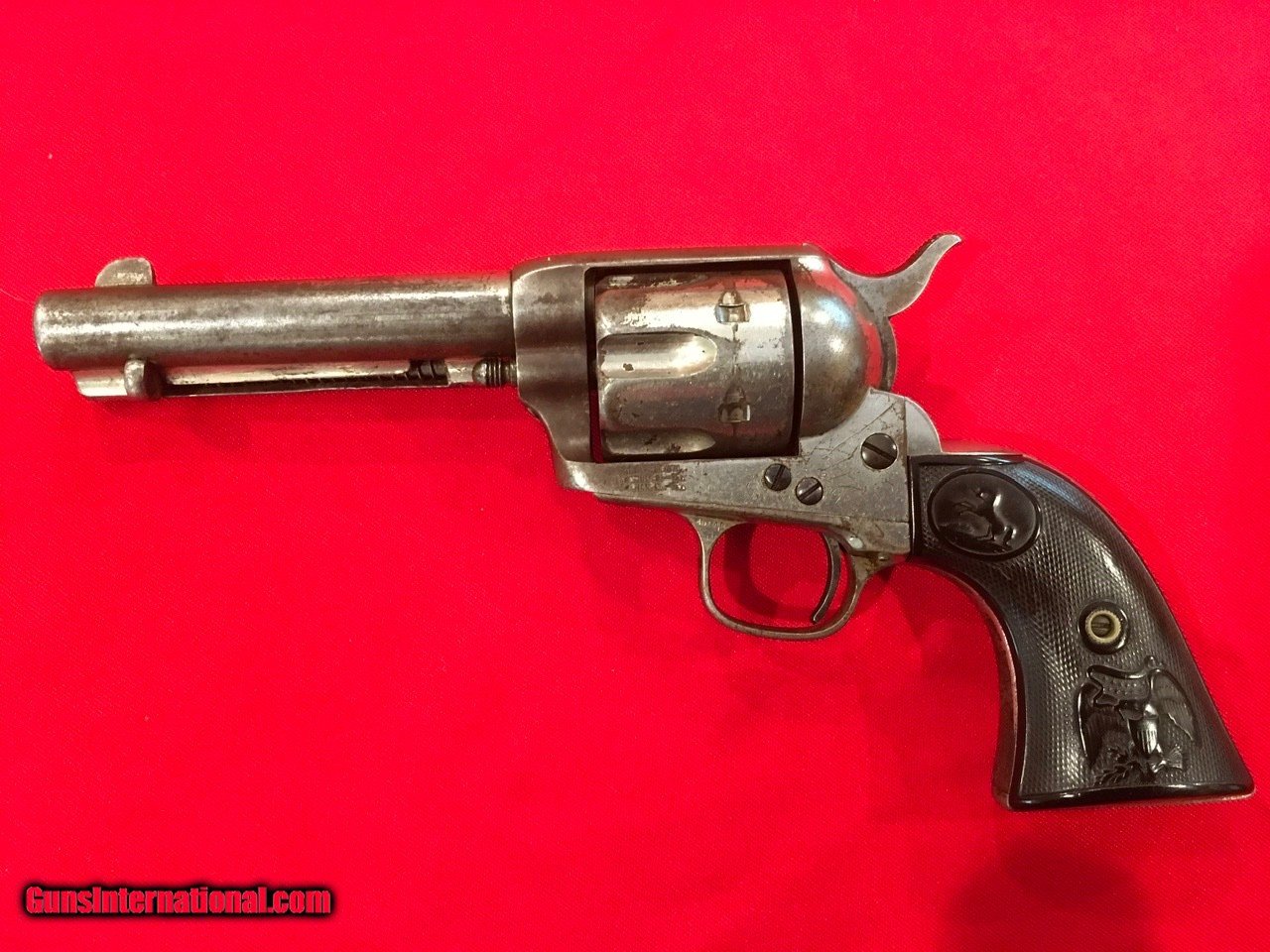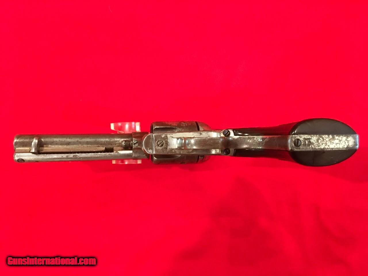 Description: Antique, Colt Single Action Army, serial number 109968 that matches on the frame, triggerguard and backstrap. Comes with a Colt Archive letter that confirms the features as .45/c caliber, 4 3/4" barrel, nickel finish with rubber stocks that shipped to Charles Hummel & Son in San Antonio, TX on March 8, 1886 in a shipment of 10 guns. The rubber stocks are slightly undersized on the bottom. The factory applied markings are all clear and readable. The action functions properly with a very small amount of play in the cylinder. The bore is good with only very minor oxidation. There is a very good amount of original nickel remaining. Price includes insurance and shipping to the continental United States where legal. A three day inspection is offered with full refund if returned unfired in the same condition. Buyer to pay return shipping. Please let me know if you have any questions or need additional photos. SOLD Antique: Yes |