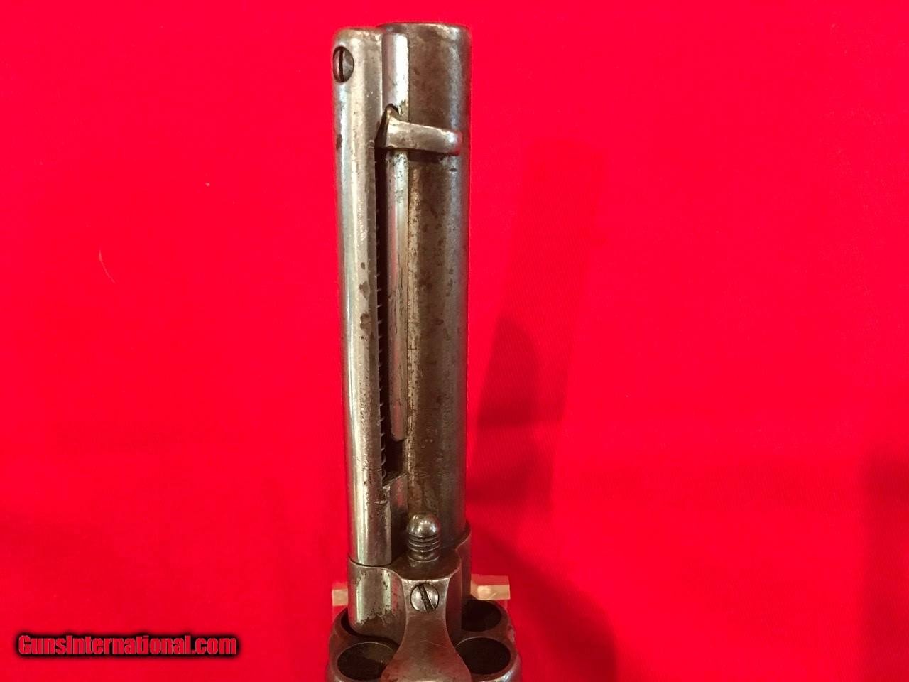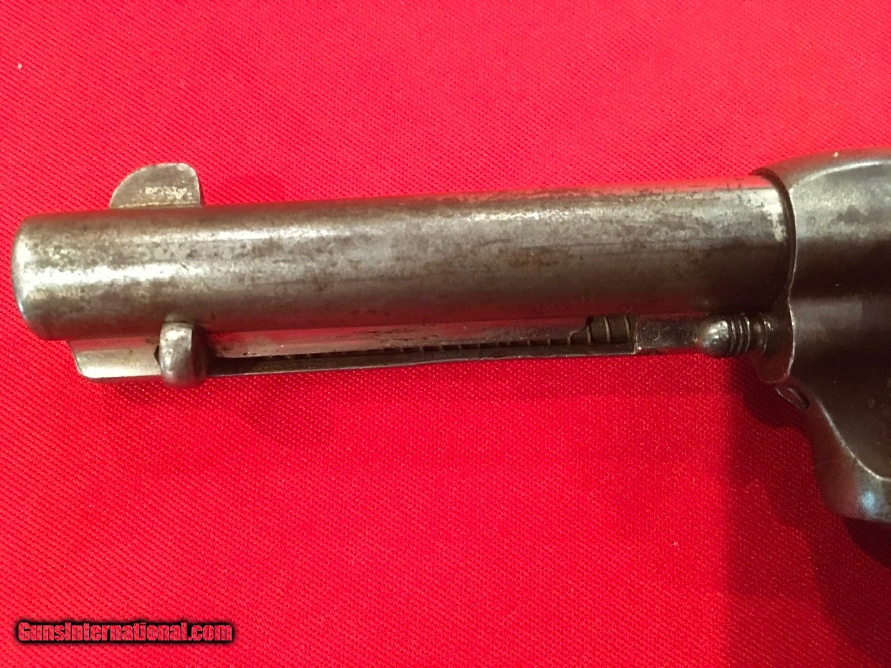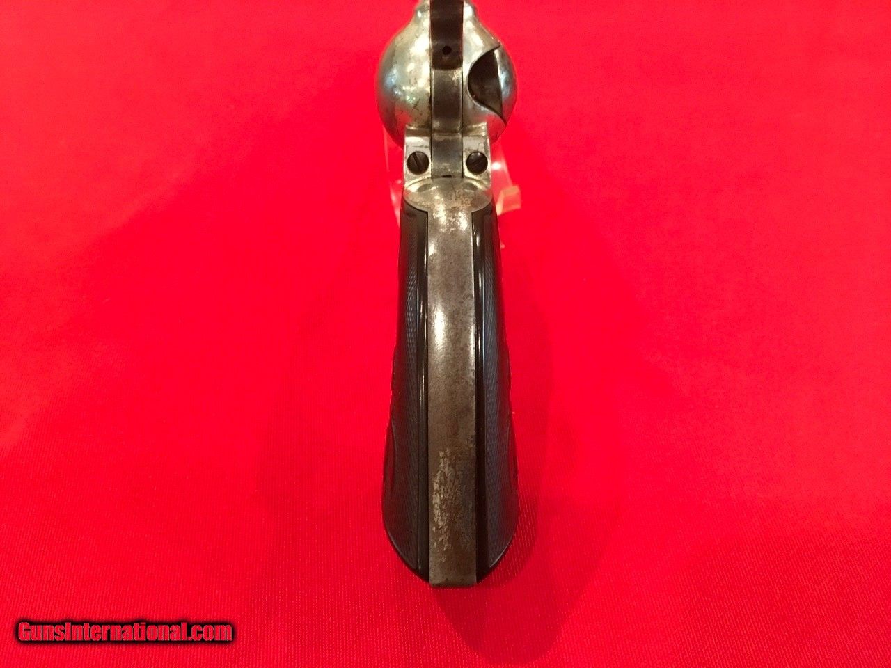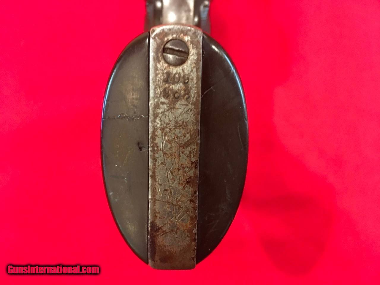Description: Antique, Colt Single Action Army, serial number 109968 that matches on the frame, triggerguard and backstrap. Comes with a Colt Archive letter that confirms the features as .45/c caliber, 4 3/4" barrel, nickel finish with rubber stocks that shipped to Charles Hummel & Son in San Antonio, TX on March 8, 1886 in a shipment of 10 guns. The rubber stocks are slightly undersized on the bottom. The factory applied markings are all clear and readable. The action functions properly with a very small amount of play in the cylinder. The bore is good with only very minor oxidation. There is a very good amount of original nickel remaining. Price includes insurance and shipping to the continental United States where legal. A three day inspection is offered with full refund if returned unfired in the same condition. Buyer to pay return shipping. Please let me know if you have any questions or need additional photos. SOLD Antique: Yes |