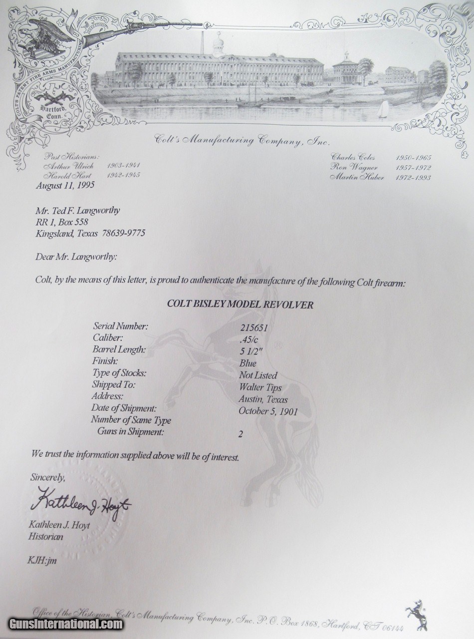 TEXAS SHIPPED COLT .45 BISLEY MODEL REVOLVER from COLLECTING TEXAS – SHIPPED 1901 to WALTER TIPS of AUSTIN, TEXAS