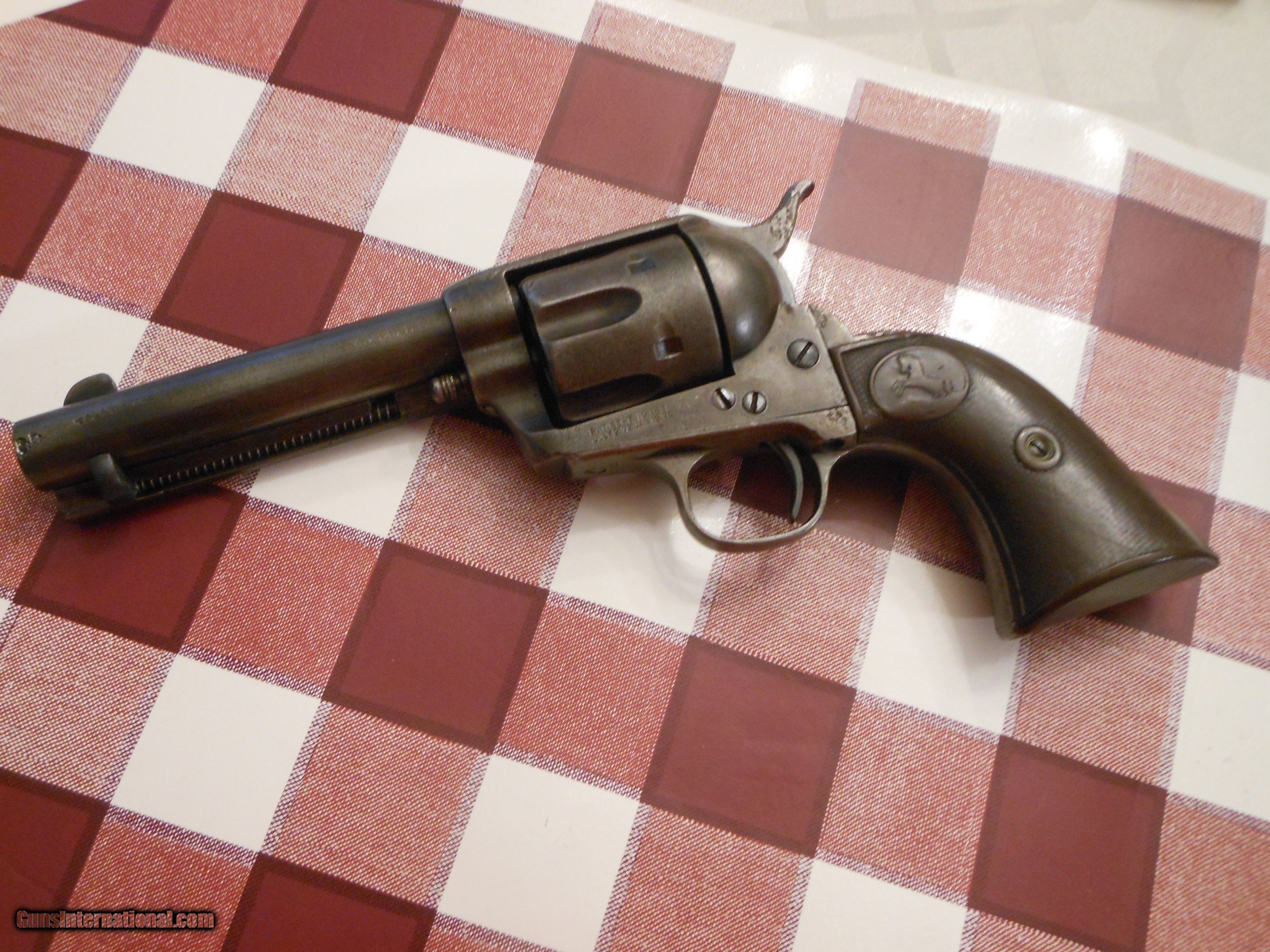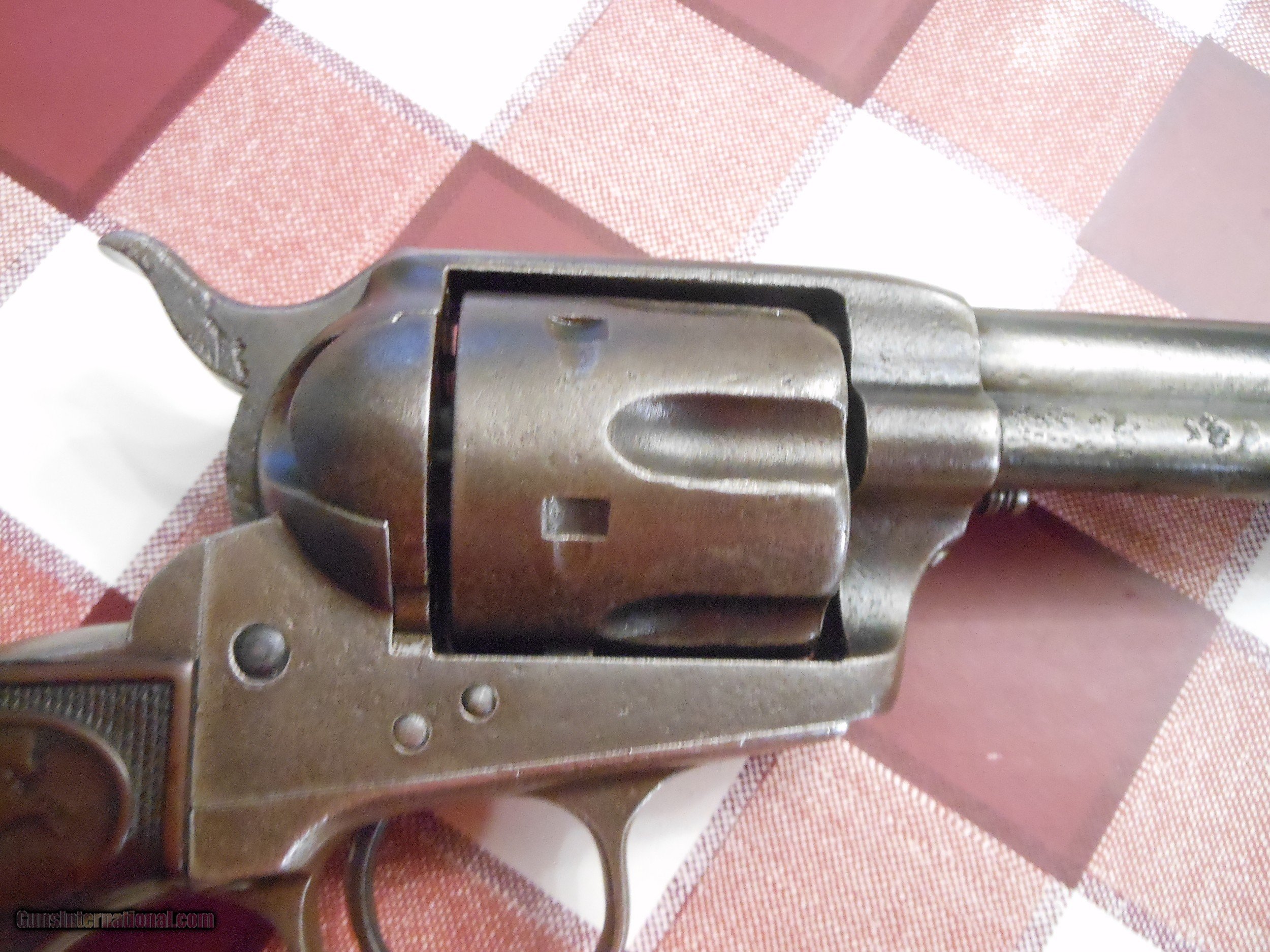 Description: This is a really cool Single Action Army(SAA) in 45 cal. It is lettered to Donlay and Geisler in Houston TX. Sent October 1891 just the way it sits, 4.75 inch with rubber grips. This one has some Blood pitting, meaning some one dirpped blood on the gum and it dried. I've had civil war peices like this...very interesting. You can tell becausethe pitting s so defined and not scattered...most of the gun is not pitted. buyer pays $20 shipping and extra if you want the Ins One more thing, I love colt SAAs(black powder only) and will take a trade of any western shipped guns. SOLD |