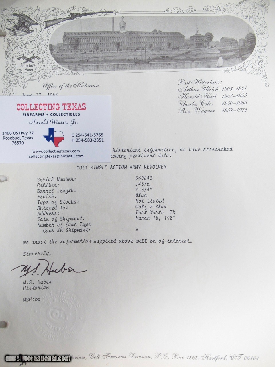 TEXAS SHIPPED COLT SINGLE ACTION ARMY REVOLVER from COLLECTING TEXAS – WOLF & KLAR – FT. WORTH, TEXAS SHIPPED in 1921