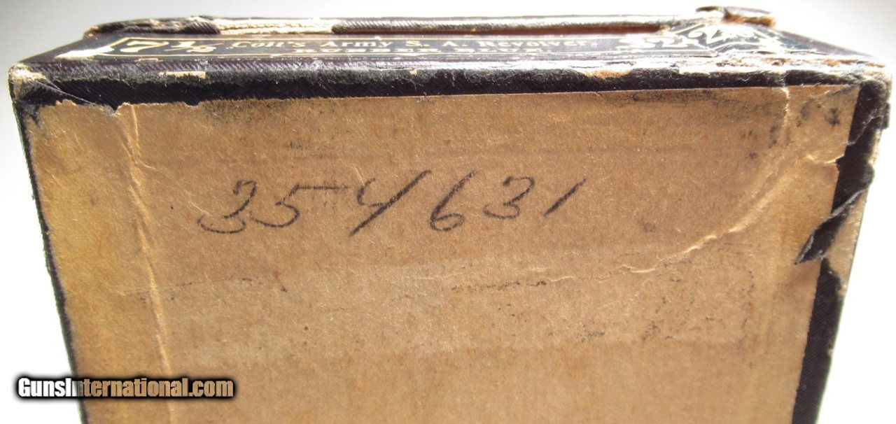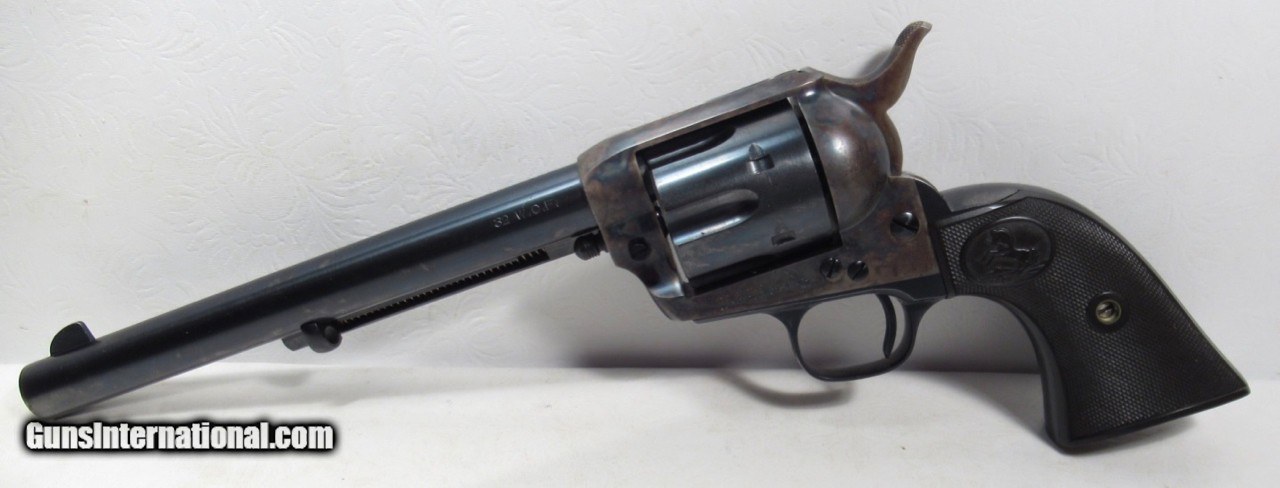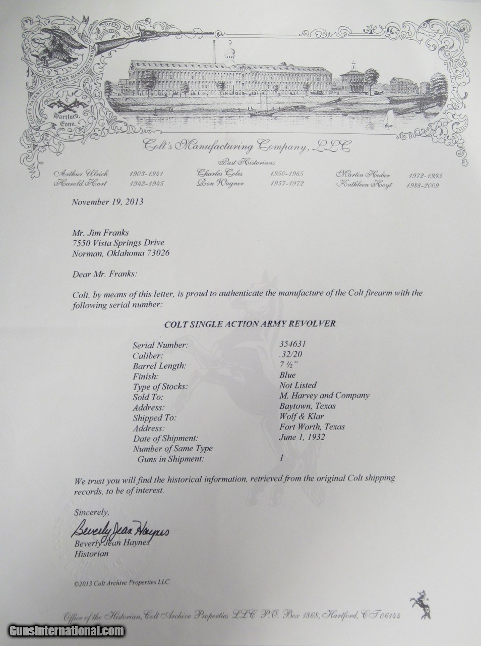 Description: Colt Single Action Army Revolver; Serial No. 354631; Made 1932; Per Included Factory Letter: .32 W.C.F. (.32/20) Caliber with 7 ½” Barrel and Blue Finish; Shipped to Wolf & Klar of Ft. Worth, Texas and Sold to M. Harvey and Company of Baytown, Texas on June 1, 1932 as Part of a 1 Gun Shipment; Blue and Case Colors; Original Box with Papers; All Numbers Match Including Numbered Grips and “31” on Rear Face of Cylinder; Gun is at least 99% Original Metal Finish and Perfect Grips, Bore, and Action; Letter from Family Included (See Photo); Rare 90 Year-Old Texas Colt Revolver in Original Box; See All Photos for Condition; No Texts; Call (254)541-5765 or Email Only; PERSONAL PROPERTY of Harold Wieser; Price: $8,975 + $45 S&H Via USPS PRIORITY MAIL; Payment Address: Harold Wieser - 1466 U.S. Hwy 77 - Rosebud, TX 76570; SEND PAYMENTS VIA USPS PRIORITY MAIL; BEWARE of SCAMS!!! – DO NOT SEND MONEY or CORRESPONDENTS ELECTRONICALLY UNLESS YOU HAVE SPOKEN to HAROLD WIESER FIRST! 254-541-5765 SOLD Manufacturer: Colt Model: 1873 Serial Number: 354631 |