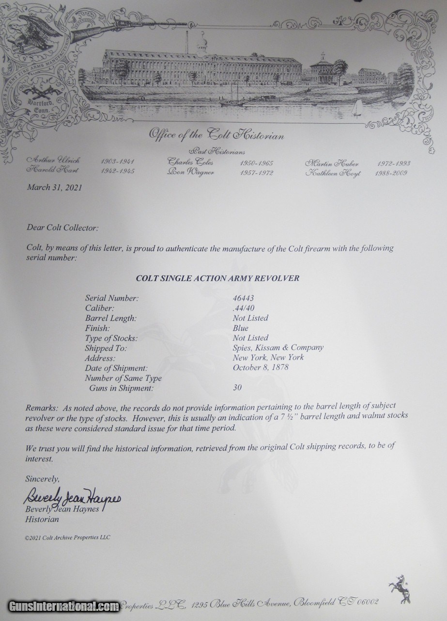 Description: SALE PENDING!!! Colt Single Action Army; Serial No. 46443; As Per Included Factory Letter – Shipped to Spies, Kissam & Company of New York, NY on October 8, 1878 as part of a 30 Gun Shipment; This Revolver Surfaced in the Dallas, Texas Area in 2021; All Matching Numbers Including Numbered Grips; Finish Dark Patina; Etch Panel is dark but 100% Legible; 7 ½” Barrel with Great Original Walnut Grips with Lots of Original Varnish; Perfect Action; Sharp Bore with light frosting; 143 Year-Old Texas Colt; See All Photos for Condition; No Texts; Call (254)541-5765 or Email Only; PERSONAL PROPERTY of Harold Wieser; Price: $4,975 + $45 S&H Via USPS PRIORITY MAIL; Payment Address: Harold Wieser - 1466 U.S. Hwy 77 - Rosebud, TX 76570; SEND PAYMENTS VIA USPS PRIORITY MAIL; BEWARE of SCAMS!!! – DO NOT SEND MONEY or CORRESPONDENTS ELECTRONICALLY UNLESS YOU HAVE SPOKEN to HAROLD WIESER FIRST! 254-541-5765 SOLD Antique: Yes Manufacturer: Colt Model: 1873 Serial Number: 46443 |