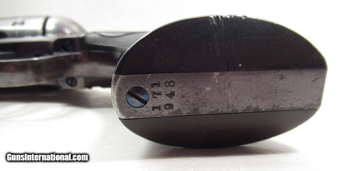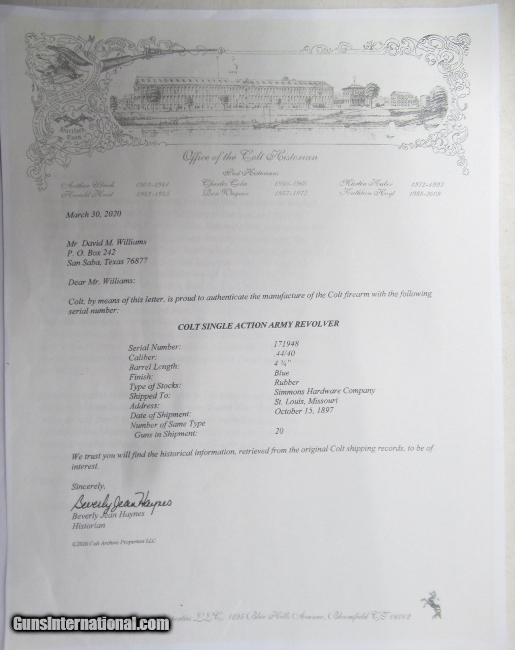 Description: Colt Single Action Army Revolver; Serial No. 171948; 44-40 Caliber; “Colt Frontier Six Shooter”; Per Factory Letter Addressed to Mr. David Williams (Attorney for Harkey Family and Chairman of San Saba, Texas County Historical Commission “Died Feb. 2020”): 4 ¾” Barrel, Blue Finish with Rubber Grips and Shipped October 15, 1897 to Simmons Hardware in St. Louis, Missouri; Gun Retains Nearly All Original Metal Finish; Perfect Grips; Perfect Action and Bore; Much Info on Harkey Family Included; Sheriff and Texas Ranger, Etc. History; NOTE: Harkey Family Connection; Very Fine and Interesting, Original Antique Colt 44-40 Single Action Revolver; See All Photos for Condition; No Texts; Call (254)541-5765 or Email Only; PERSONAL PROPERTY of Harold Wieser; NOTICE: We Do Not Do Any Consignments - All Items Listed are Owned by Us - NO SALES to New Jersey or New York City - Antiques Only to Massachusetts and California; NOTE: All Modern Firearms Must Go to FFL Dealer who will Accept From Individual with Texas Driver License; Price: $10,000 Shipped; Payment Address: Harold Wieser - 1466 U.S. Hwy 77 - Rosebud, TX 76570; SEND PAYMENTS VIA USPS PRIORITY MAIL; BEWARE of SCAMS!!! - DO NOT SEND MONEY or CORRESPONDENTS ELECTRONICALLY UNLESS YOU HAVE SPOKEN to HAROLD WIESER FIRST! (254)541-5765 SOLD Manufacturer: Colt Model: 1873 S.A.A. Serial Number: 171948 |