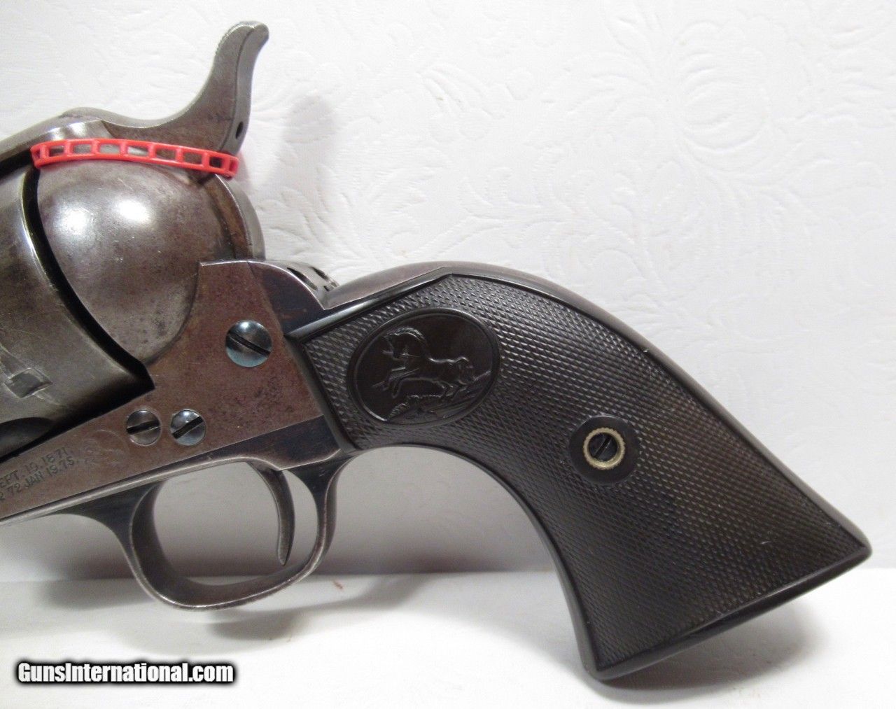 Description: Colt Single Action Army; Serial No. 167681; 45 Caliber with 4 ¾” Barrel and Blue Finish; Per Factory Letter Included: Shipped to Major Colt Distributor Simmons Hardware on October 12, 1896 as Part of a 50 Gun Shipment; This Colt Ended up in Abilene, Texas and was from the Dr. H.H. Miller Collection; 100% Pure, Original, Un-Altered, and Matching; Most of the Original Metal Finish Remains; Fine Original Colt Hard Rubber Grips; Initials F.S.K. and #7681 Serrated on Inside of Left Grip; PERFECT ACTION and BORE and SCREWS and FULL FRONT SIGHT; Great 125 Year-Old Texas Colt Single Action 45; See All Photos for Condition; No Texts; Call (254)541-5765 or Email Only; PERSONAL PROPERTY of Harold Wieser; Price: $6,475 + $45 S&H Via USPS PRIORITY MAIL; Payment Address: Harold Wieser - 1466 U.S. Hwy 77 - Rosebud, TX 76570; SEND PAYMENTS VIA USPS PRIORITY MAIL; BEWARE of SCAMS!!! – DO NOT SEND MONEY or CORRESPONDENTS ELECTRONICALLY UNLESS YOU HAVE SPOKEN to HAROLD WIESER FIRST! 254-541-5765 SOLD Antique: Yes Manufacturer: Colt Model: 1873 Serial Number: 167681 |
