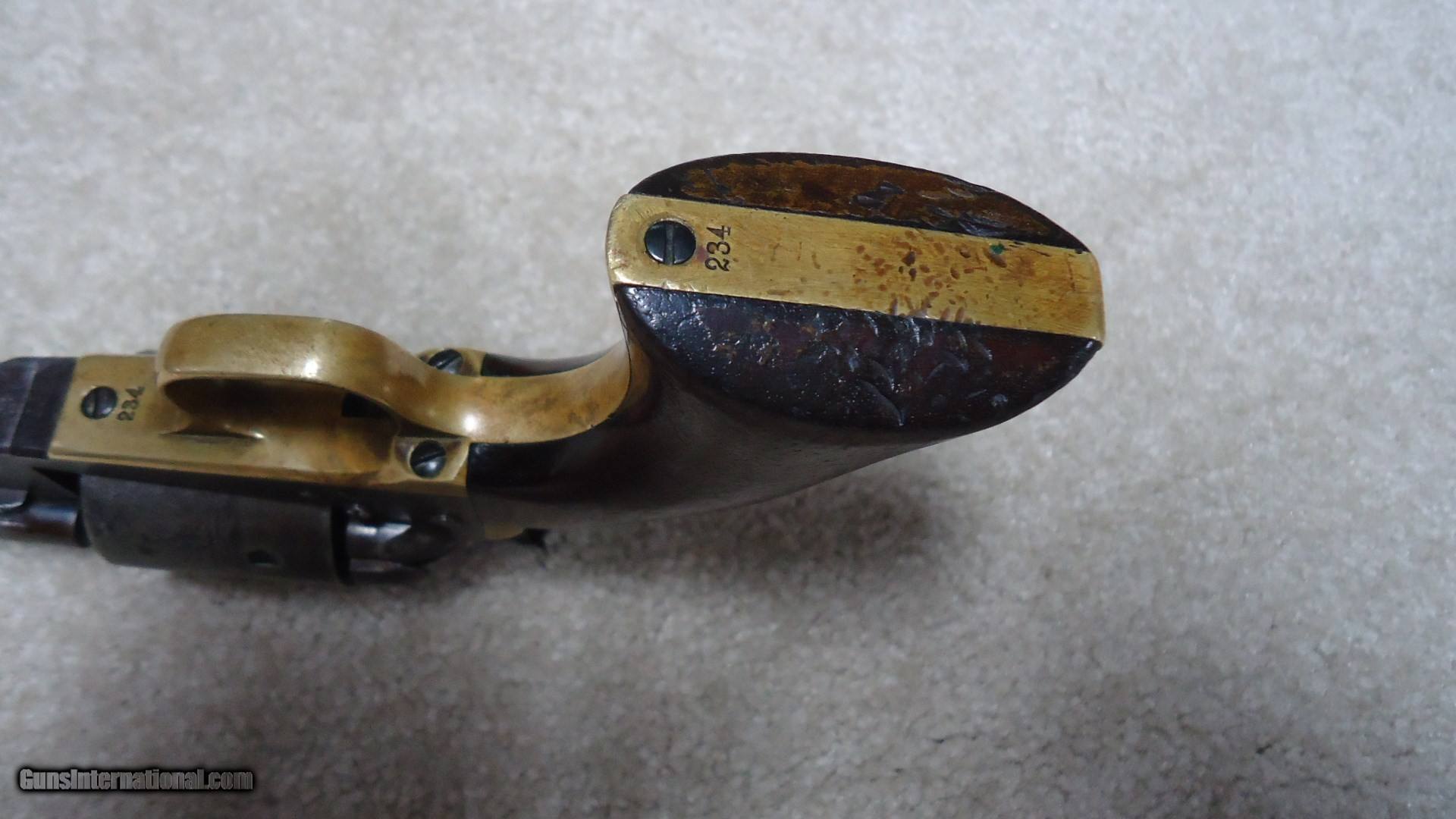Description: GREAT COLT OFFERING! 1871-1872 OPEN TOP EARLIEST STYLE .44 RIM FIRE SINGLE ACTION, #2XX. This is truly an exceptional Colt for a number of reasons. First, it is in “Attic Condition” that appears to have never been cleaned or steel-wooled etc. The steel parts retain an uncleaned gray/brown aged patina and all with sharp markings- correct barrel address, early style two line “COLTS PATENT” on the left side of the frame and a full naval roll marked cylinder scene. All matching numbers with correct 7 ½” barrel and ejector housing. It also has the rare navy size brass grip frame (two rarities)- most were steel and army size. The brass is an unpolished mustard color with small traces of silver plate in the most protected areas (tarnished dark) and intriguingly there are five or six very small “kill notches” on the right edge of the back strap! The one piece walnut grips fit perfectly and are excellent. Mechanically excellent with fine bore. Most of these have seen hard use and abuse and many/most have had their barrels cut at some time. This is a really great, early example! SOLD Antique: Yes Handgun Caliber: .44 Henry rimfire (11x23R) Manufacturer: COLT Model: 1871-72 OPEN TOP Serial Number: 2XX Barrel Length: 7 1/2 Condition: fine |