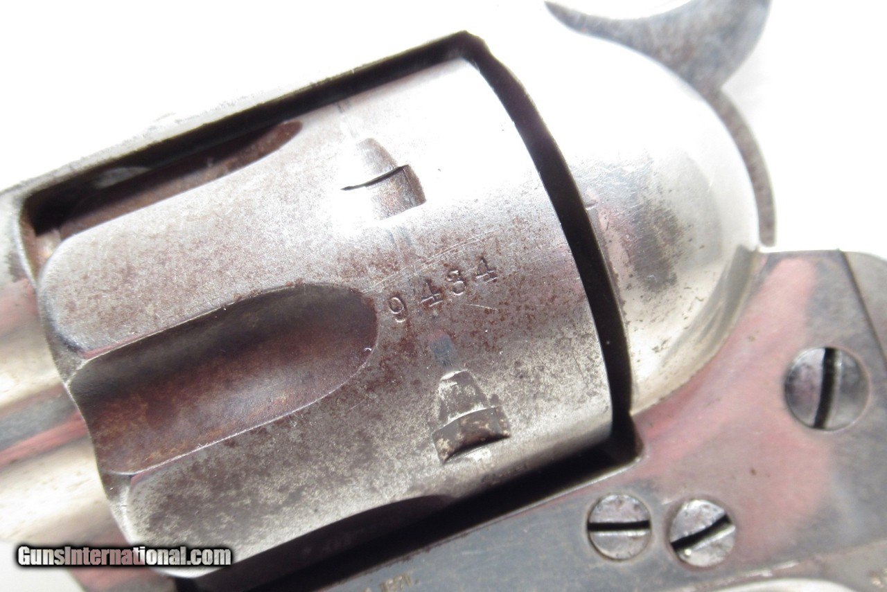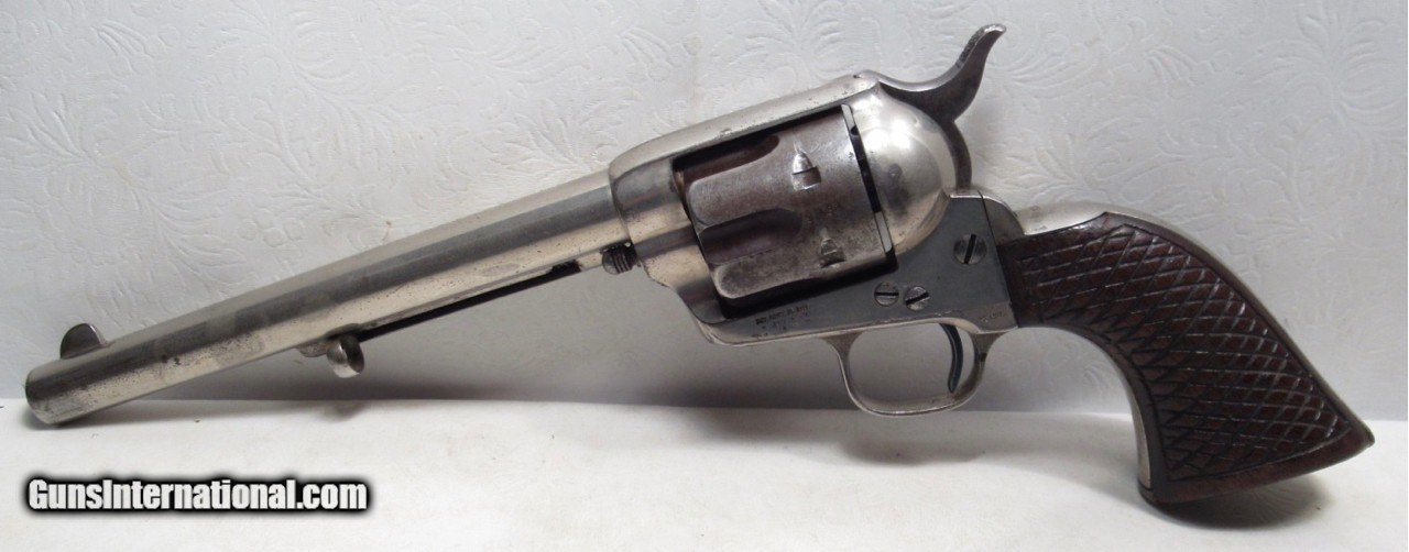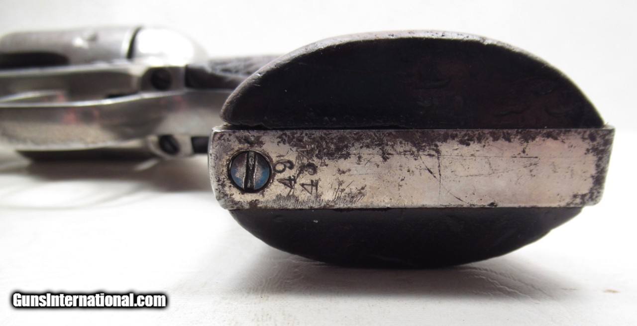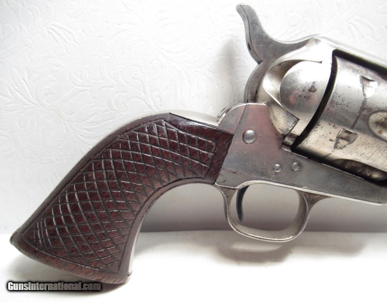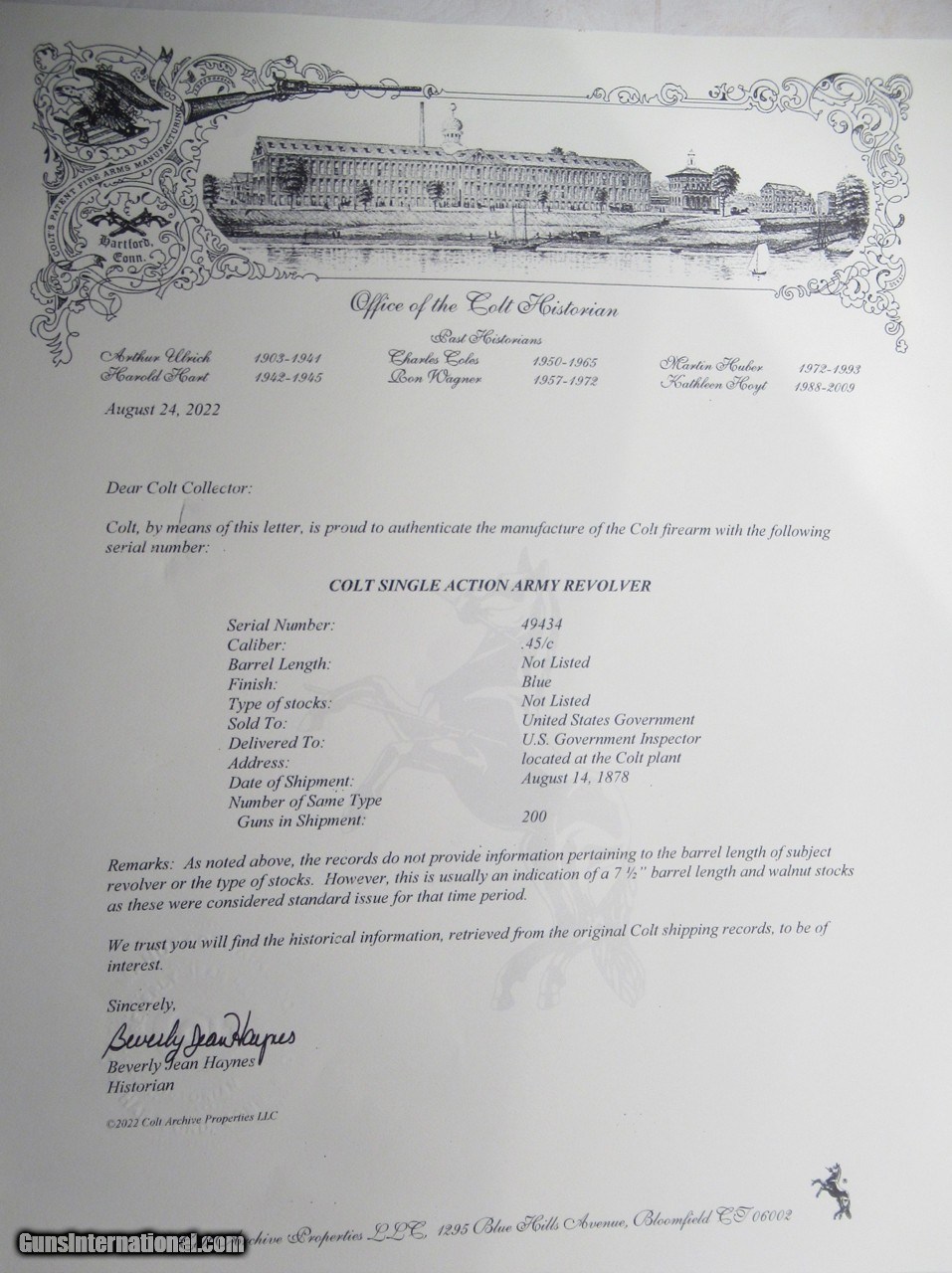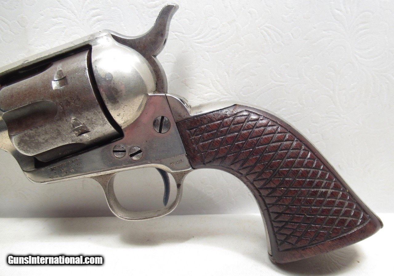 Description: Colt Single Action Army Revolver; Serial No. 49434; Per Included Factory Letter: Revolver was Part of a 200 Gun Shipment to U.S. Government on August 14, 1878; This 145 Year-Old Colt was Obviously a Buy Back as 45 Caliber on Rear Left Flat of Trigger Guard; All Correct and Matching but no US on Frame and has Never Been; Nickle Plated 7 ½” Barrel with Matching Numbers; Camp Fire Cowboy Checkered Wood Grips; Perfect Action and Very Strong Bore with minor flaws; Very Good 145 Year-Old Martial Colt Revolver; See All Photos for Condition; No Texts; Call (254)541-5765 or Email Only; PERSONAL PROPERTY of Harold Wieser; NOTICE: We Do Not Do Any Consignments - All Items Listed are Owned by Us - NO SALES to New Jersey or New York City - Antiques Only to Massachusetts and California; Price: $12,975 + $45 S&H Via USPS PRIORITY MAIL; Payment Address: Harold Wieser - 1466 U.S. Hwy 77 - Rosebud, TX 76570; SEND PAYMENTS VIA USPS PRIORITY MAIL; BEWARE of SCAMS!!! – DO NOT SEND MONEY or CORRESPONDENTS ELECTRONICALLY UNLESS YOU HAVE SPOKEN to HAROLD WIESER FIRST! 254-541-5765 SOLD Curio/Relic: Yes Antique: Yes Manufacturer: Colt Model: 1873 Serial Number: 49434 |