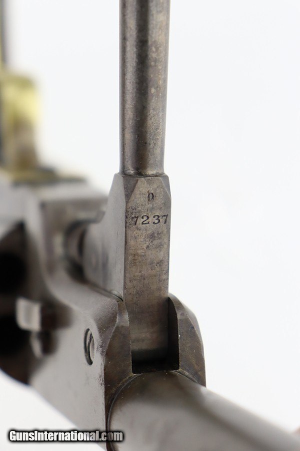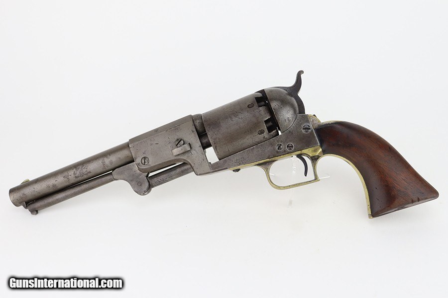 Description: This is a matching and original example of a very rare 1st Model Colt Dragoon revolver from ~1849. Matching numbers include the cylinder, strap, frame, trigger guard, barrel, and loading lever. Wedge is not numbered. The First Model Dragoon is an important descendant of the famous Colt Walker revolver which debuted just one year earlier and was meant for use by the U.S. Mounted Riflemen and U.S. Dragoons and saw use on the western frontier in the antebellum era and on the battlefields of the Civil War in both Union and Confederate hands. This specific revolver was manufactured in 1849, falls within the First Model serial number range (1341 through about 8000). The finish on the revolver is original but obviously worn throughout with little to none of the original blue remaining. Nearly 100% of the early Dragoons were issued, so they are very difficult to find with any bluing left. The grip panels are unmarked, so may be replacements. The trigger guard has small 'F' inspector stamp. The cylinder has the Texas Ranger and Indian battle scene on it but is fairly worn, with correct oval stop slots. Brass grip strap/frame shows patina and discoloration. The bore has strong rifling but there is some pitting and rust inside. SOLD Curio/Relic: Yes Antique: Yes Handgun Caliber: .44 |