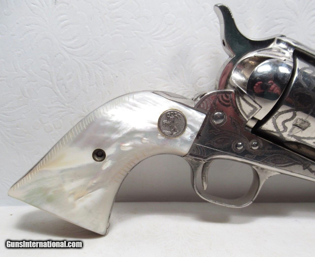 Description: Colt Single Action Army Revolver; Serial No. 350443; Per Included Factory Letter: .45 Caliber with 5 ½” Barrel, Nickel Finish, and Rubber Grips; Shipped to Wolf and Klar of Ft. Worth, Texas on April 23, 1928 as Part of a 3 Gun Shipment; Very Rare Wolf & Klar Shipping Records, Sold to Hampton Hardware Located in Chickasha, Oklahoma; Typical Wolf & Klar Engraving; Most of the Original Nickel Finish Remains; Flush Medallion Pearl Grips not original to gun; Perfect Action and Perfect Bore; Very Rare 94 Year-Old Colt 45 Revolver Sold to Chickasaw Nation Hardware Store; See All Photos for Condition; No Texts; Call (254)541-5765 or Email Only; PERSONAL PROPERTY of Harold Wieser; Price: $8,975 + $45 S&H Via USPS PRIORITY MAIL; Payment Address: Harold Wieser - 1466 U.S. Hwy 77 - Rosebud, TX 76570; SEND PAYMENTS VIA USPS PRIORITY MAIL; BEWARE of SCAMS!!! – DO NOT SEND MONEY or CORRESPONDENTS ELECTRONICALLY UNLESS YOU HAVE SPOKEN to HAROLD WIESER FIRST! 254-541-5765 SOLD Manufacturer: Colt Model: 1873 Serial Number: 350443 |