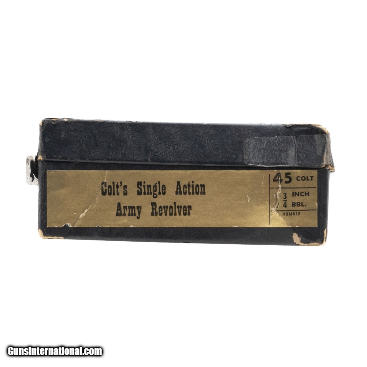 Description: " Very early 4 3/4"" 2nd Generation model made in 1958. Beautiful condition, appears unfired with original matching black box. The box is a bit tattered but still sound with papers and brush. A very desirable Colt Single Action, in the most popular barrel length, 4 3/4"". SOLD |