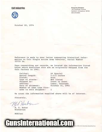 Description: " Colt Single Action Army .44 Special caliber revolver. Scarce 2nd Generation 7½” model in .44 Special caliber. Has a factory letter confirming caliber and barrel length. Only 763 2nd generation were made in this configuration. A very desirable Colt Single Action.