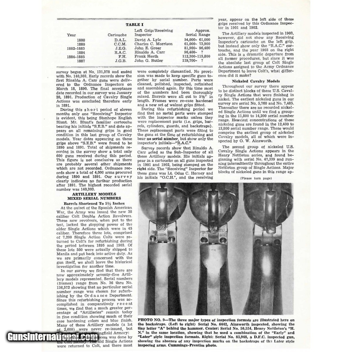 Description: "Serial Number 6442. 45 LC caliber with a 7 ½" barrel. This is a cavalry model inspected by O. W. Ainsworth. This gun has an even dark gray patina. The grips are very good and have traces of a cartouche. This gun was part of lot 6 issued to the US Cavalry and lot 5 and 6 were the guns shipped to the 7th cavalry. Several gun in the same serial range have provenance to the 7th cavalry and the battle of the little big horn. This gun comes with a letter from noted Colt expert John Kopec. Mr. Kopec says that he originally purchased this gun from an individual when he lived in La Puente, Ca in 1966 or 1967. He says that he had the barrel length restored because he did not know any better at the time. Otherwise this gun is original. This gun also comes with a copy of The Gun Report from May of 1971 where there is an article by John Kopec where this gun was pictures several times. Very Fine Custer range Colt Single Action Army! SOLD |