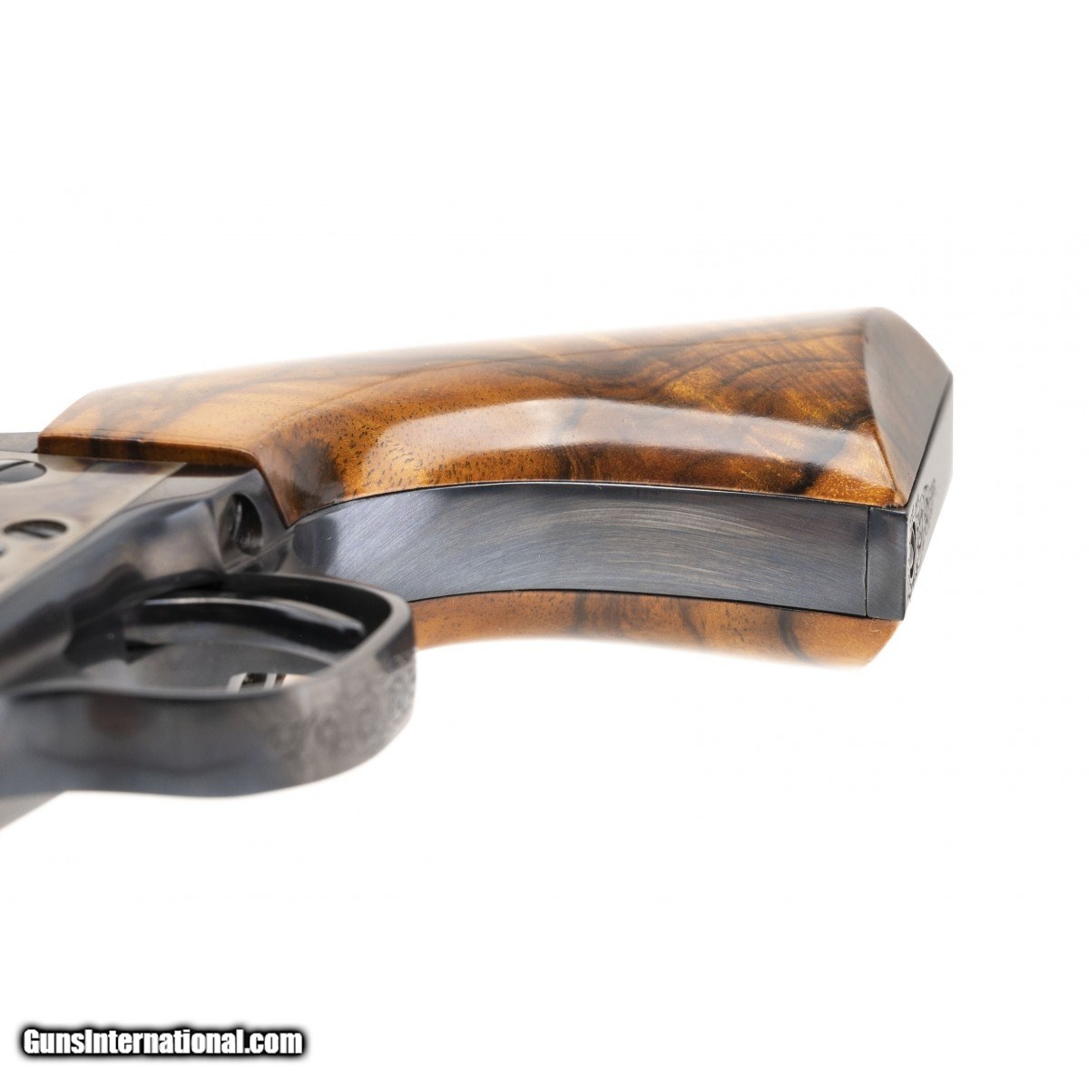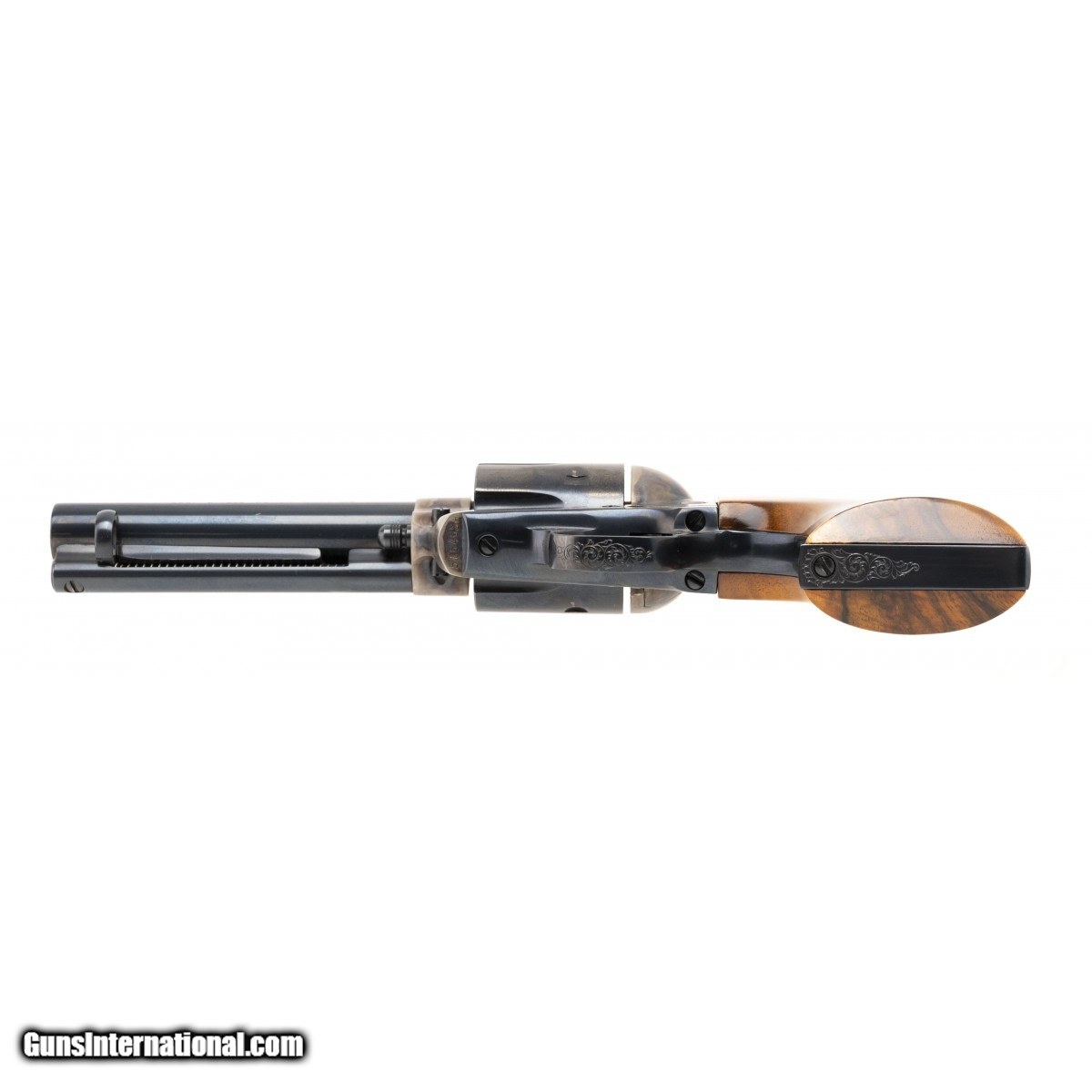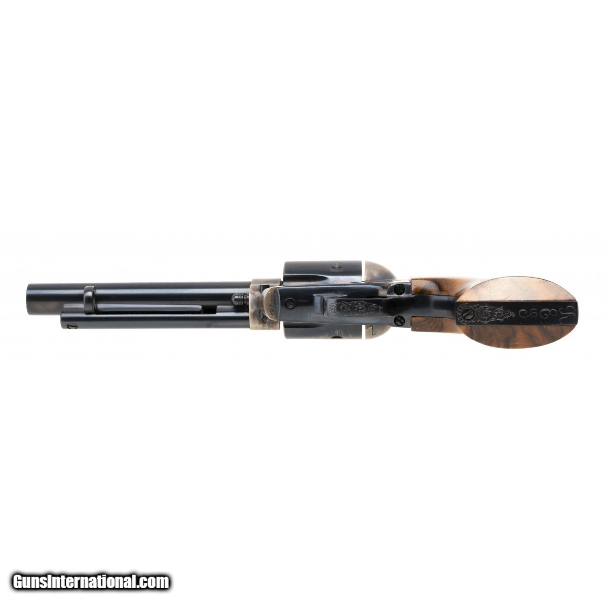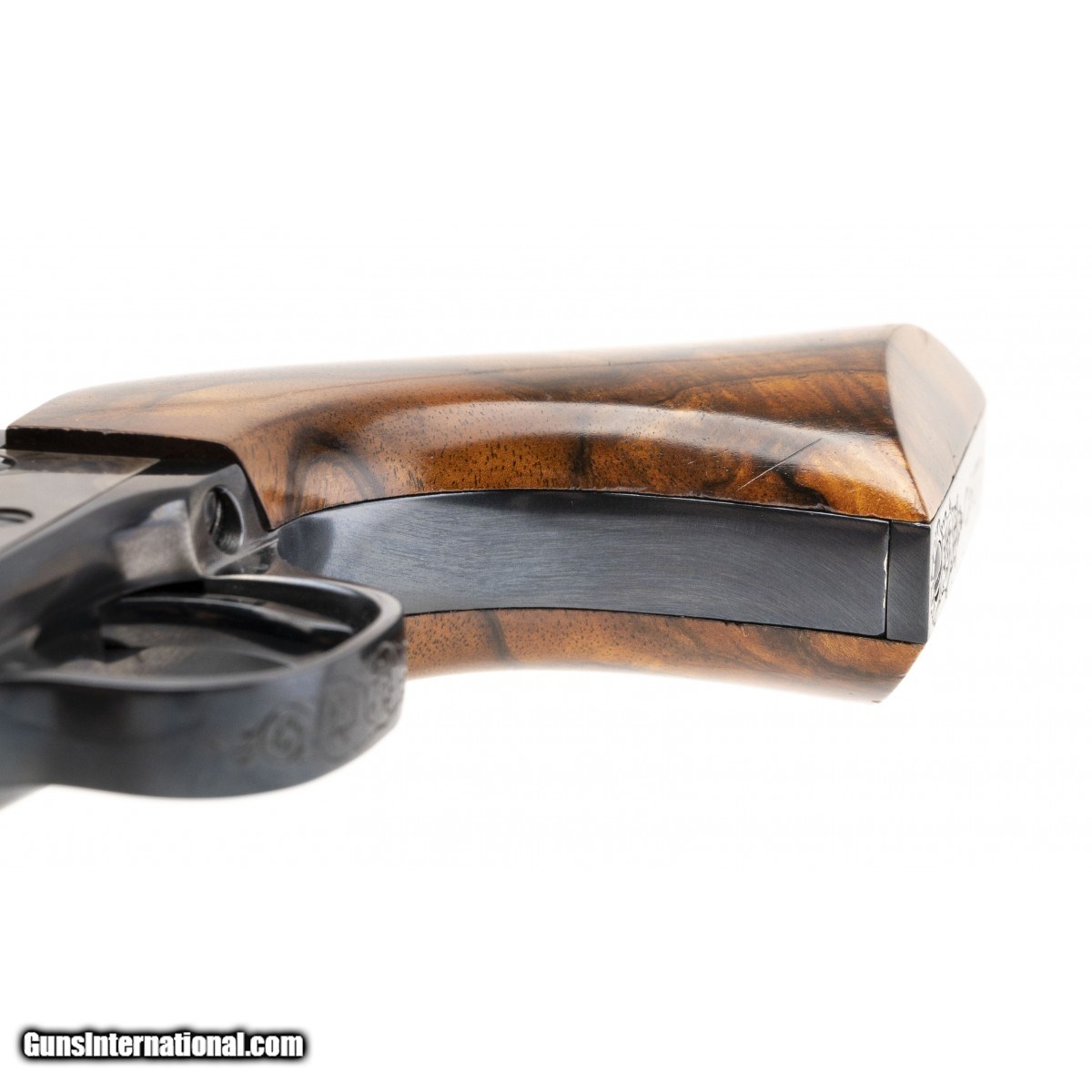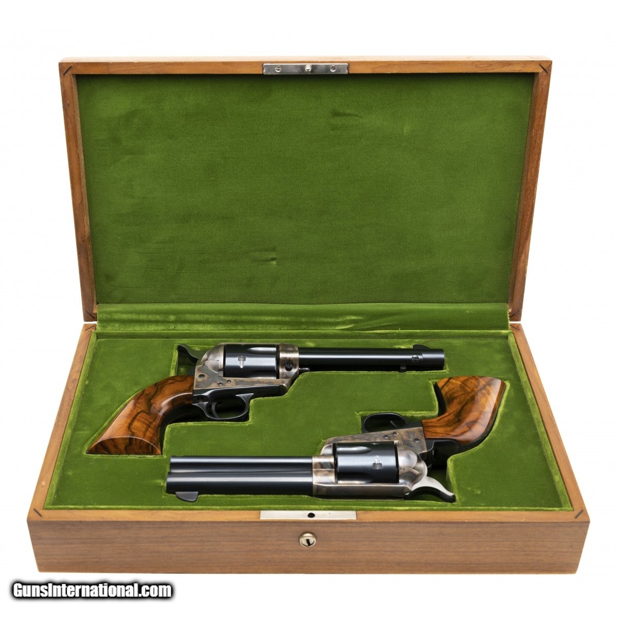Description: " Cased pair of customized 2nd Gen Colt Single Action revolvers, one with a 4.75"" barrel and one with a 5.5"" barrel. Both guns have had the grip frame and trigger guard custom engraved with a delicate scroll, and both have gorgeous French walnut one piece grips. The guns are in excellent condition and come in a custom presentation case. A great looking set. SOLD |