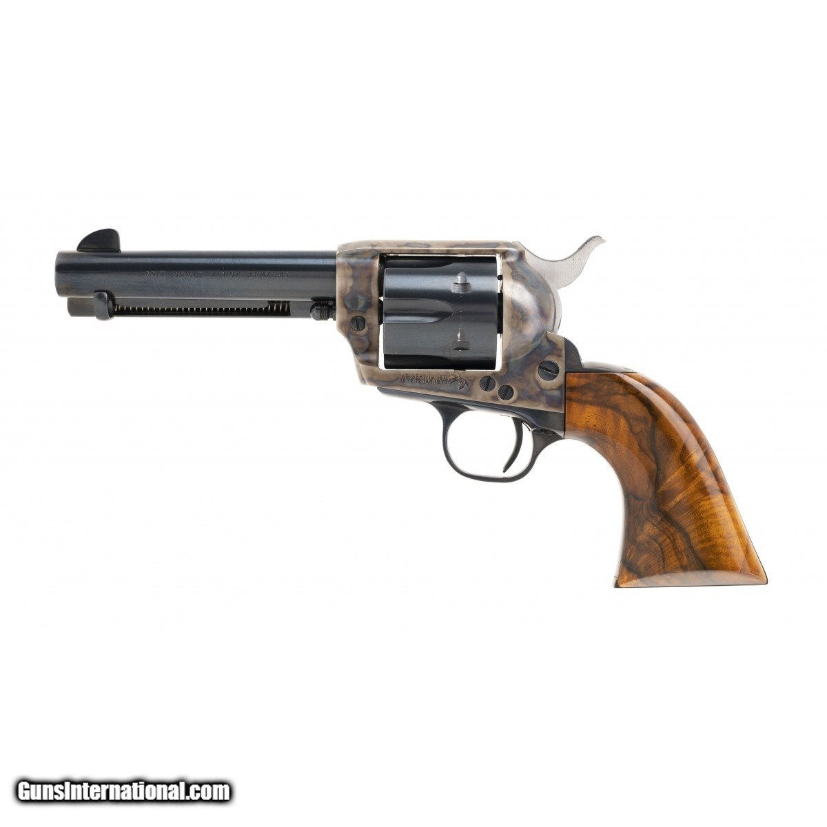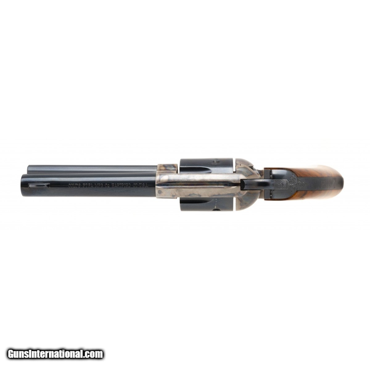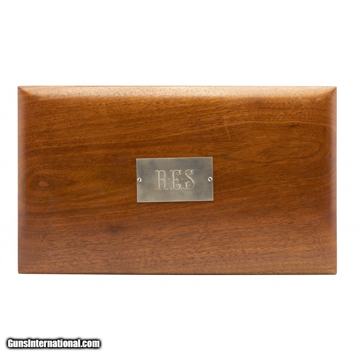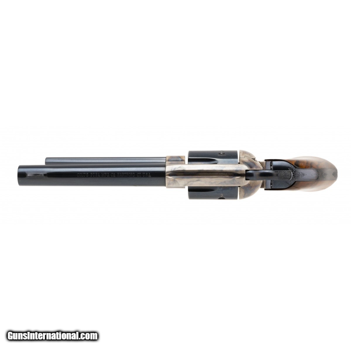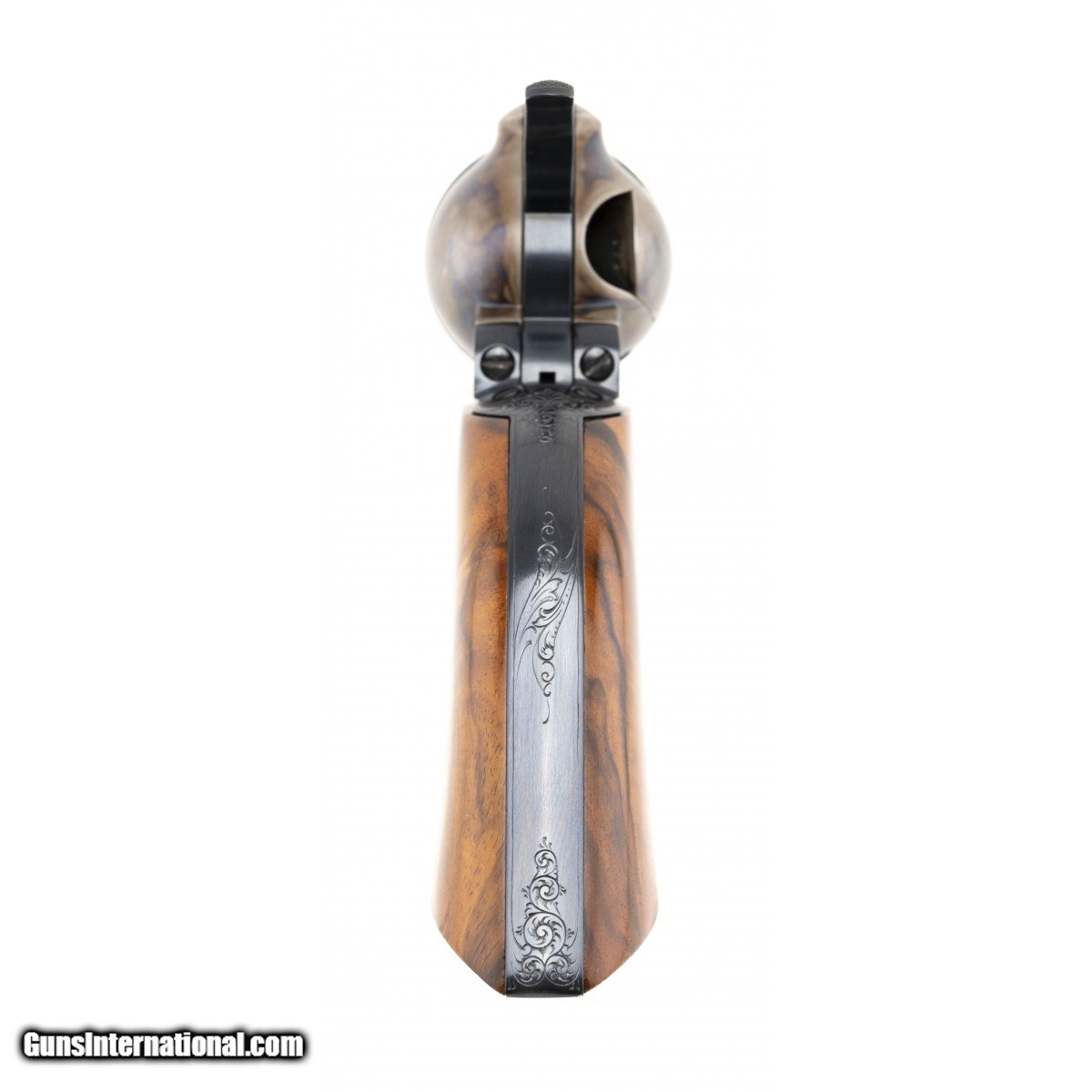 Description: " Cased pair of customized 2nd Gen Colt Single Action revolvers, one with a 4.75"" barrel and one with a 5.5"" barrel. Both guns have had the grip frame and trigger guard custom engraved with a delicate scroll, and both have gorgeous French walnut one piece grips. The guns are in excellent condition and come in a custom presentation case. A great looking set. SOLD |