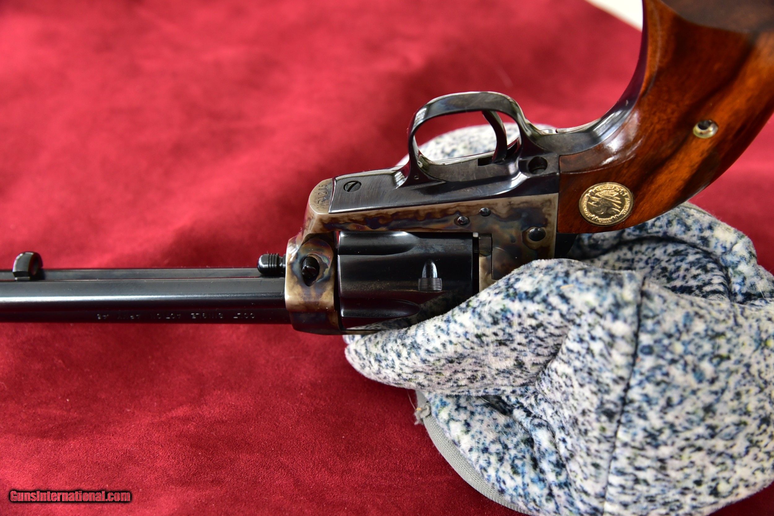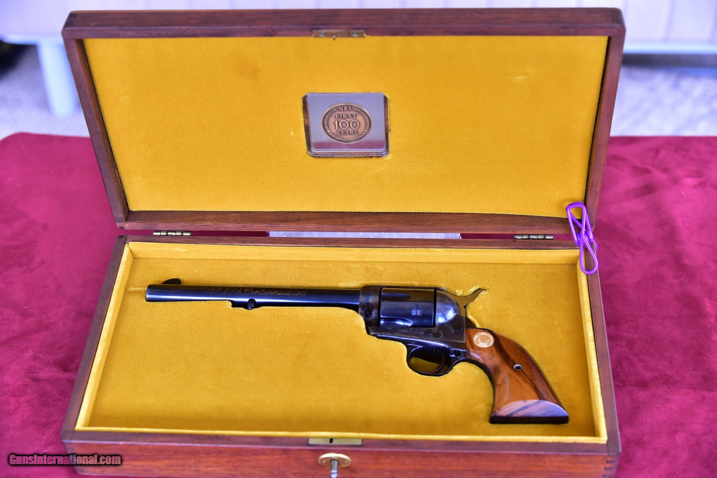 Description: Here is an unfired 2nd generattion Colt SAA with beautifuly figured hardwood grips with gold medallions and a 7.5" barrel. This gun is mint, the only thing keeping it from being a $3200.00 gun is an unobtrusive line on the barrel that makes it a commemorative gun. Everyone who owns and uses this model raves how well it shoots and how accurate a gun it is. It is extremely well made and comes with an attractive presentation box. You cannot buy a mint 2nd generation Colt for this price other then by going the commemorative route. Shoot it or show it either way it will serve it's purpose and you will be pleased. SOLD Handgun Caliber: .45 Colt Manufacturer: COLT Model: NRA CENTENNIAL COMMEMORATIVE Serial Number: NRA205 Barrel Length: 7.5 Condition: MINT Metal Condition: EXCELLENT Wood Condition: EXCELLENT Bore Condition: EXCELLENT Action: SAA Finish: Blued and Case Colored Manufacture Date: 1971 Extras: Wood Presentation Box |