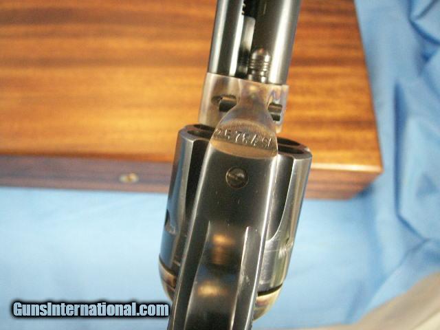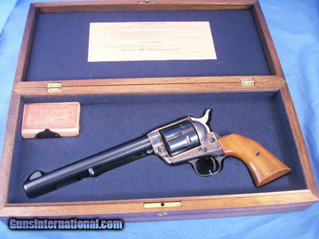 Description: SOLD PENDING FUNDS: For Sale is a 2nd Generation Colt SAA Black Box Revolver. It was manufactured in 1959 and is in .45 LC caliber with a 7 1/2" barrel. The condition is all original with the bluing rated at 98% and the Case Colors rated at 95% due to some surface spotting found on the right side of the receiver. The bore is mirror bright and the mechanics are functioning perfectly. There is a very slight cylinder line and light bluing loss at the muzzle. This SAA comes in a French fitted custom mahogany case with a reproduction box of ammo. This is an excellent display piece and priced to sell. SOLD Curio/Relic: Yes |