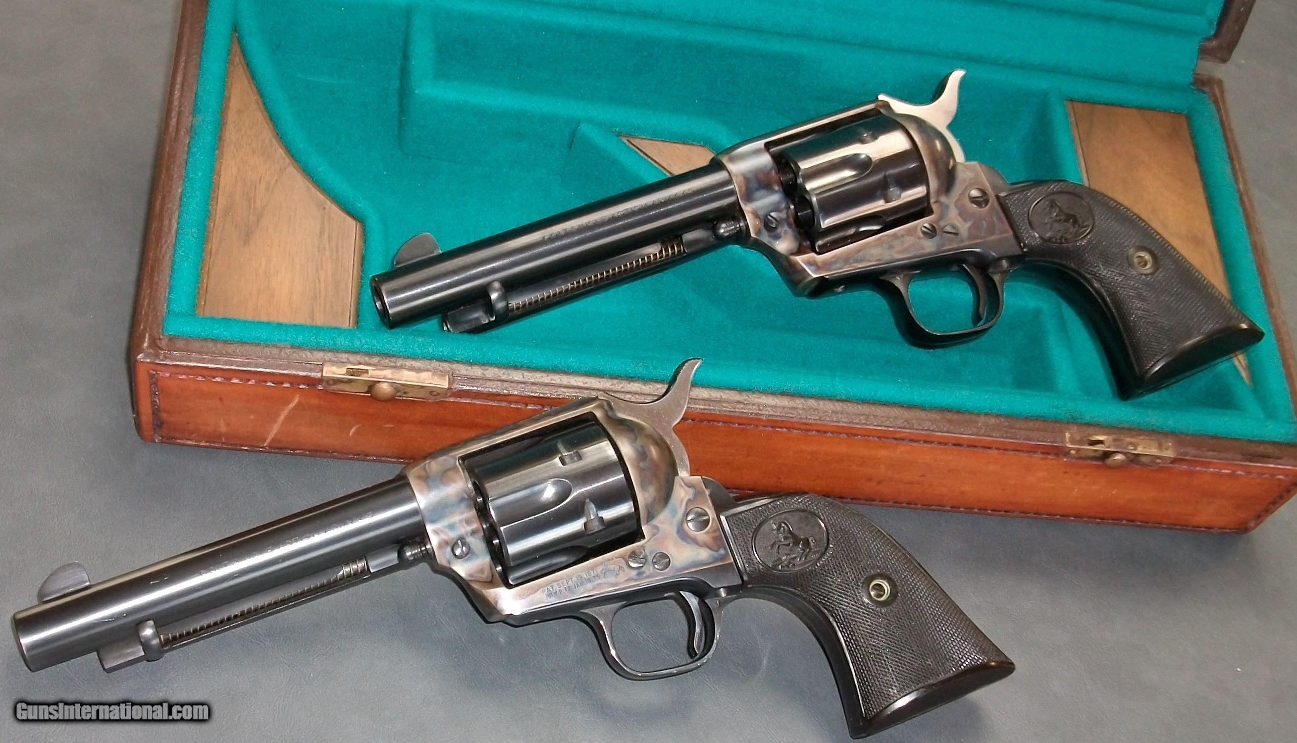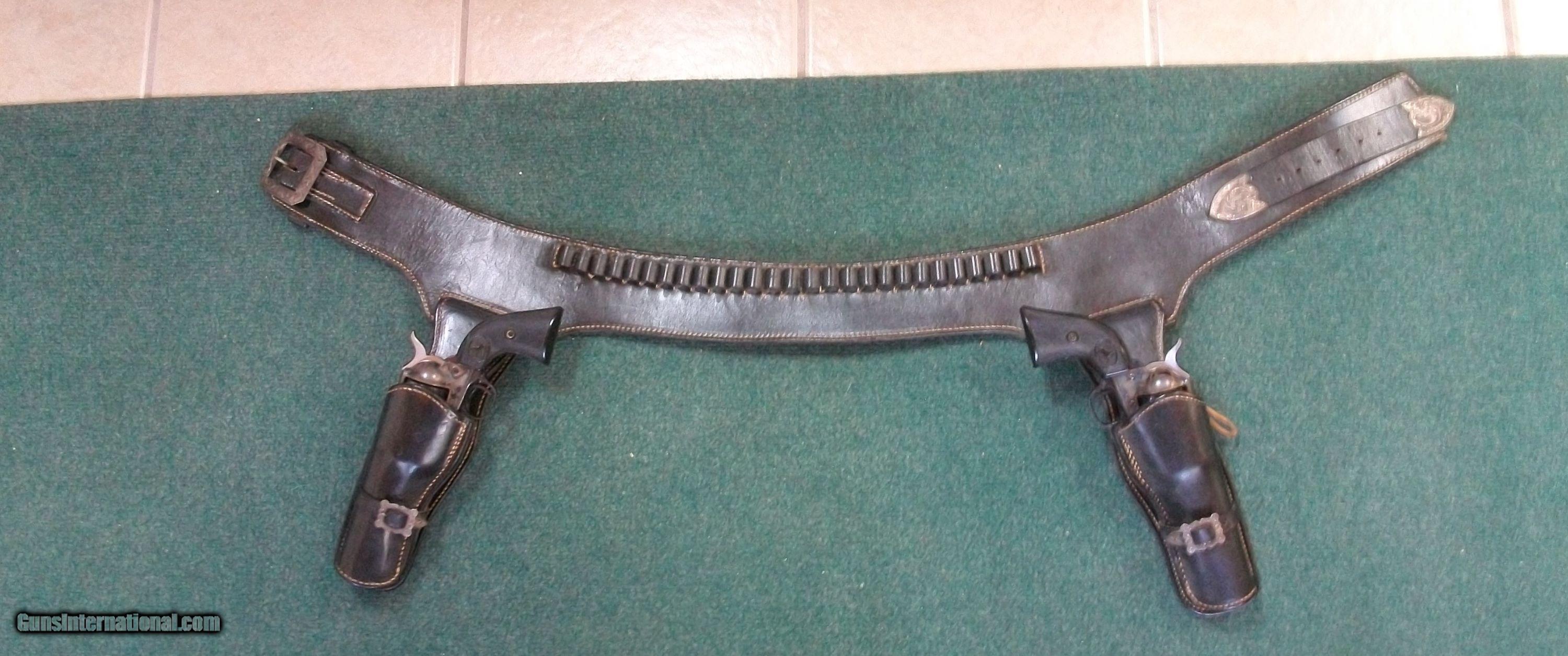 Description: Here's a pair of consecutive numbered 2nd Generation Colt SAA 5-1/2 inch .45 Colt, manufactured in 1957. S/N's XX040 & XX041. Excellent original case color and blue and are boxed in a custom leather case by Kenny Unger of Spencerport, NY. Colt Factory letter shows the original shipping destination ; Hollywood Fast Draw Holster, North Hollywood, California, April 4th, 1957. This was the shop of the famous Arvo Ojala, noted Hollywood fast draw shooter and gun leather designer. Mr Ojala recieved a U.S. Patent for his innovative fast draw holster design used by many Hollywood cowboys of the 1950's and '60. Super collector's item which includes a double gun rig in black with silver fittings built by Mr. Ojala. Also comes with a framed autographed poster. There were only 256 pairs of consecutive 5-1/2 inch, bl/cc, 45's guns shipped. SOLD Curio/Relic: Yes |