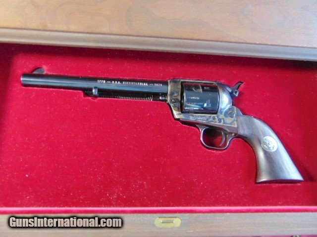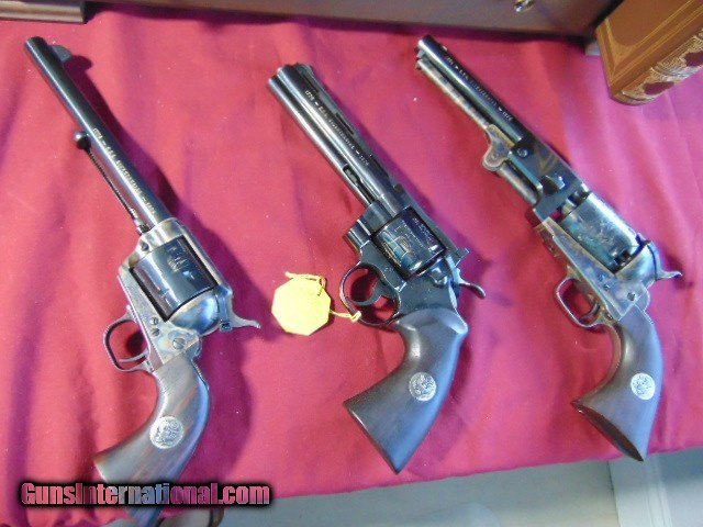 Description: COLT BICENTENNIAL COLLECTORS SET MADE IN 1976, Colt Bicentennial Commemorative 3-Gun Set. The set includes a Colt Python, Single Action Army, and a Dragoon revolver with accessories. All guns have matching serial numbers (1674), and have a beautiful Royal Blue finish. Only 1776 sets were made. The set is in a three-drawer walnut display case with Colt Armsmear book. ADD 100.00 SHIPPING CASE AND GUNS SHIPPED SEPARATE . EASTERN BRANCH FIREARMS gleneasternbranchfirearms Questions e-mail or call Glen at Eastern Branch Firearms 207-215-5021 TERMS – PLEASE READ BEFORE I DO NOT HAVE A LAYAWAY OPTION ( WE ACCEPT CREDIT CARDS ) -- I GET ALOT OF REQUEST FOR TRADES, I WOULD PERFER NOT TO DO TRADES ON MY INTERNET LISTINGS PAYMENT OPTIONS- We accept money orders, cashier’s checks , bank checks. sorry no personal checks. We accept all major credit cards please add 3% to the ’s cash discount price.(Maine Residents to pay 5% sales tax) .Handguns and long guns do need to be shipped separate. PLEASE do not send payment via FED EX . USPS & UPS are fine. Thank you. We include a signed copy of our FFL with each firearm shipped. SAFTY NOTICE- Buyer is solely responsible for determining that a used gun is safe to shoot. The firearms offered have not been test fired but have been given a visual inspection only for purposes. It is a requirement that every used firearm is inspected by a qualified gunsmith before firing. By , the buyer agrees to hold seller harmless against damages, injury, or death caused by defective merchandise. RETURN POLICY- All firearms come with a 3-day non firing , non messing with ( turning srews ,taking apart,removing parts, scoping. firing, cleaning or messing with in anyway) inspection/return privilege.Inspection is based on a visual review of the gun to confirm the gun is in the condition stated. In the case of a return, buyer pays all shipping charges & if paid for with a credit card buyer absorbs the 3% credit card charges . So please ask questions BEFORE you bid. Thanks for Looking and Good Luck!! U.S. sales only, no exports…this includes antiques. I will ship to third party for exporting SOLD Curio/Relic: Yes |