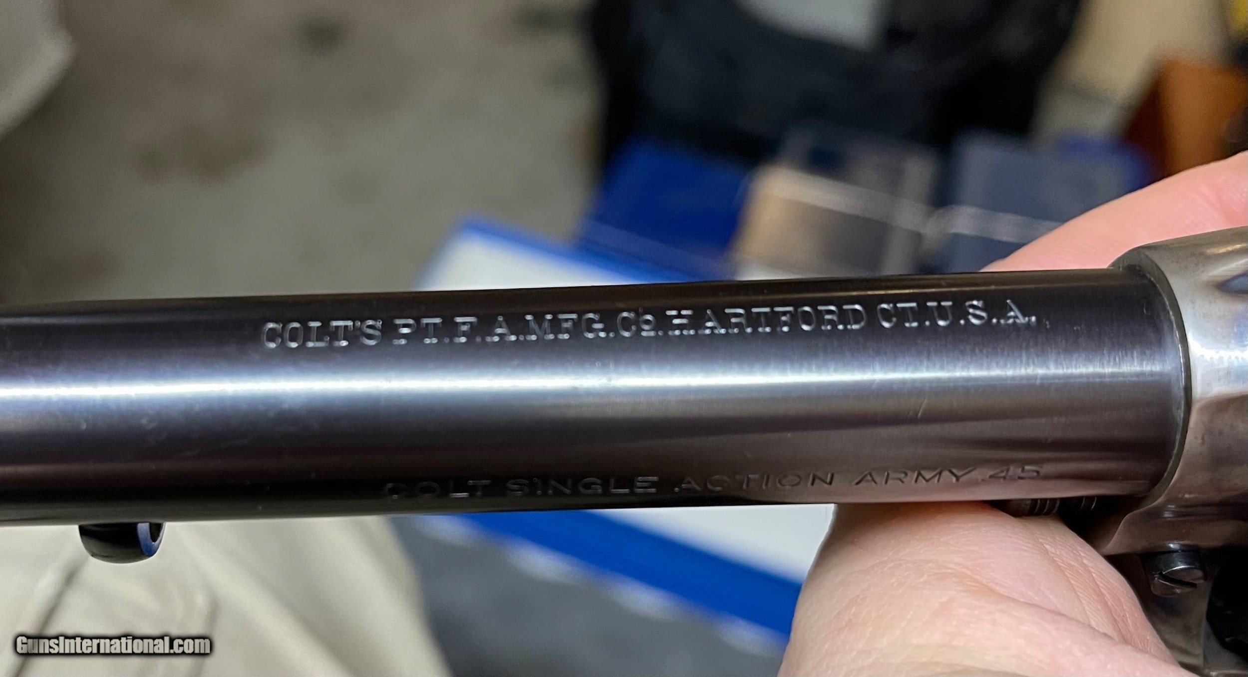 Description: Wow!!!! What a beautiful and gorgeous single action! This gun made in 1956 is the first year for the second generation single action colt. Beautiful bluing, 5 1/2 barrel, brilliant case coloring, and stag grips that fit perfectly! Slight west on the cylinder and barrel (see photos). An incredible opportunity to own a truly legendary gun! Please email with questions. Shipping and insurance included (west coast add $75). Venmo and cash app accepted. SOLD Manufacturer: Colt Model: SAA Barrel Length: 5 1/2 inch Condition: Used Metal Condition: Excellent Bore Condition: Excellent Action: Sa Finish: Blue Sights: Fixed Manufacture Date: 1956 Item Location: 37075 |