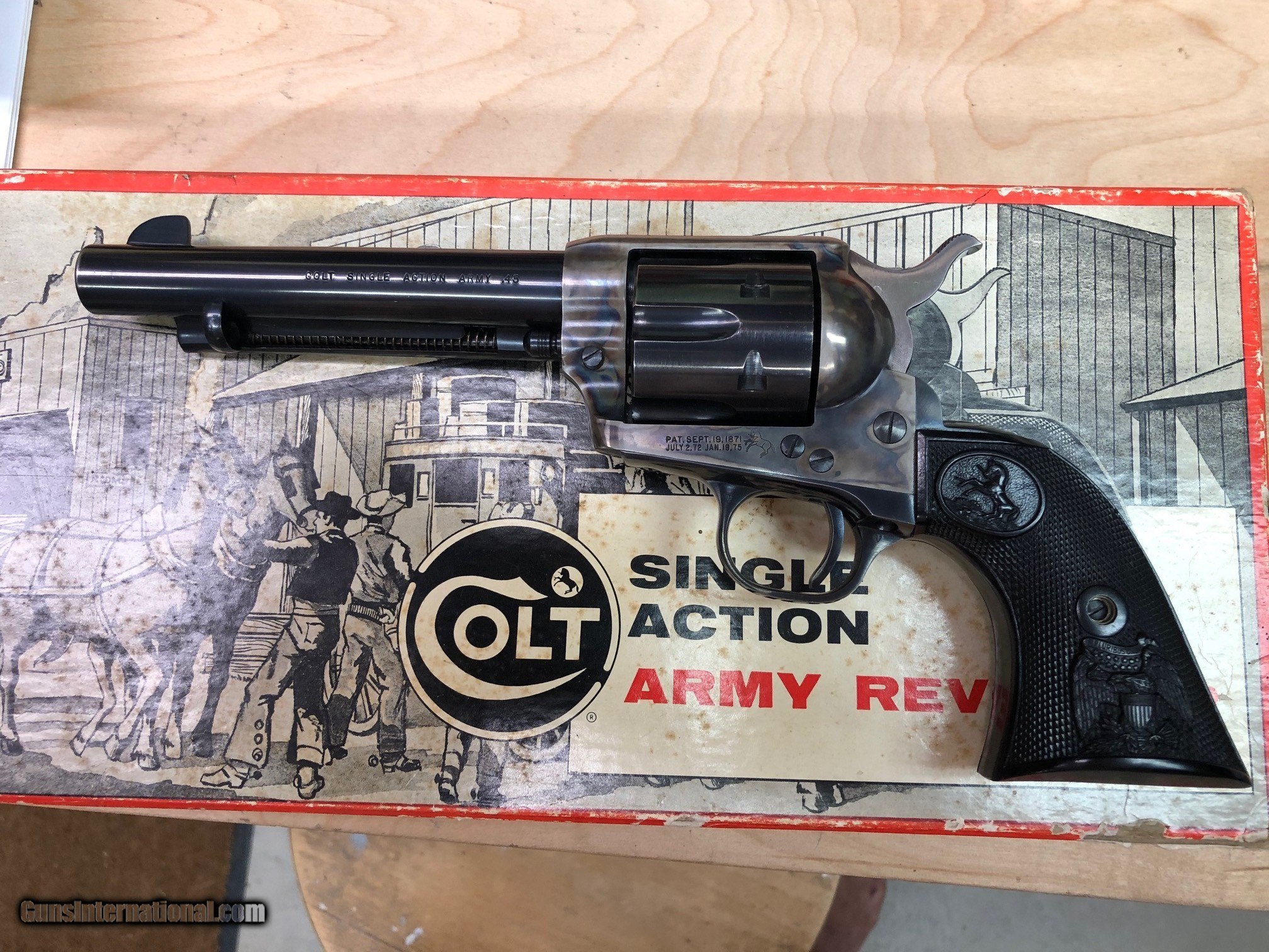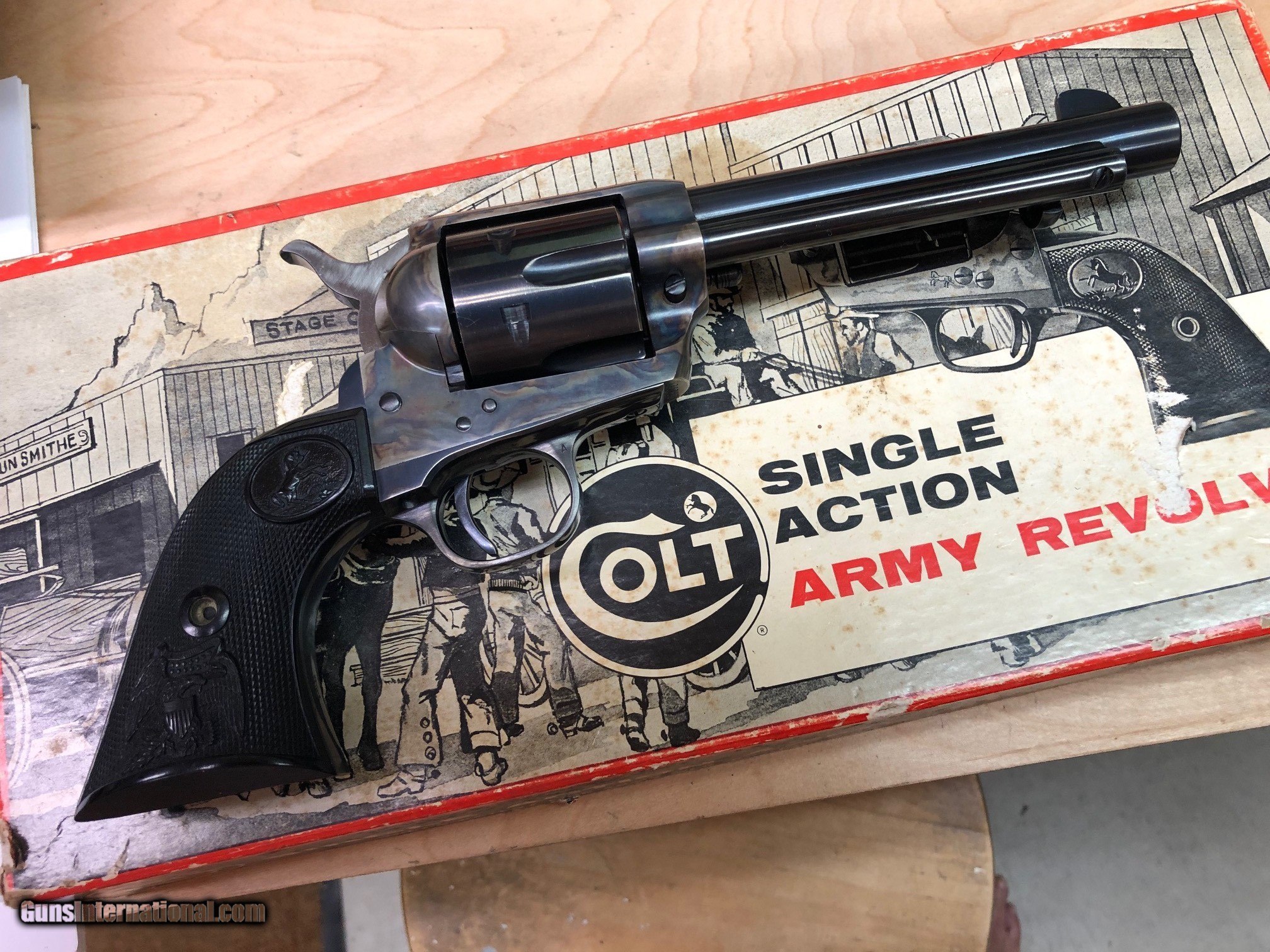Description: Beautiful Colt SAA 2nd gen 45 cal. manufactured in 1970. Excellent hardly fired condition. Original finish with very few handling marks. SN 57575SA. 5 1/2" barrel. Original Stage Coach Box. Bore is bright and shiny. Original Colt grips. SOLD Curio/Relic: Yes Handgun Caliber: .45 Colt Manufacturer: Colt Model: SAA 2nd Gen Serial Number: 57575SA Barrel Length: 5 1/2 Condition: Excellent Metal Condition: Excellent Bore Condition: Bright and shiny Manufacture Date: 1970 Case: Stage Coach box |