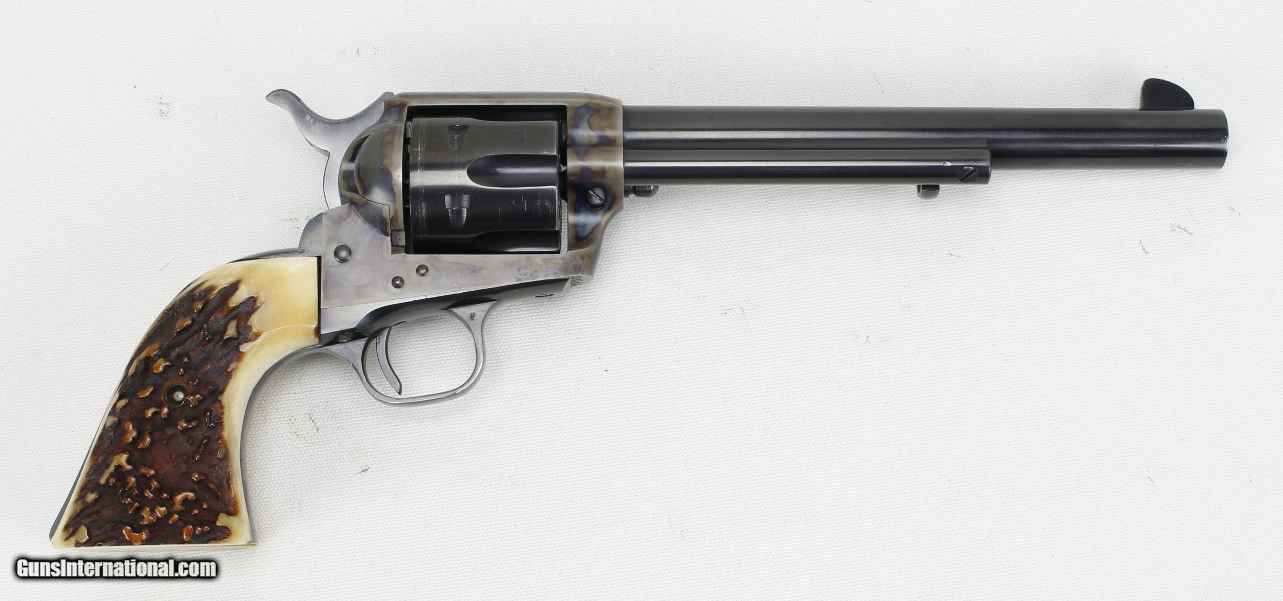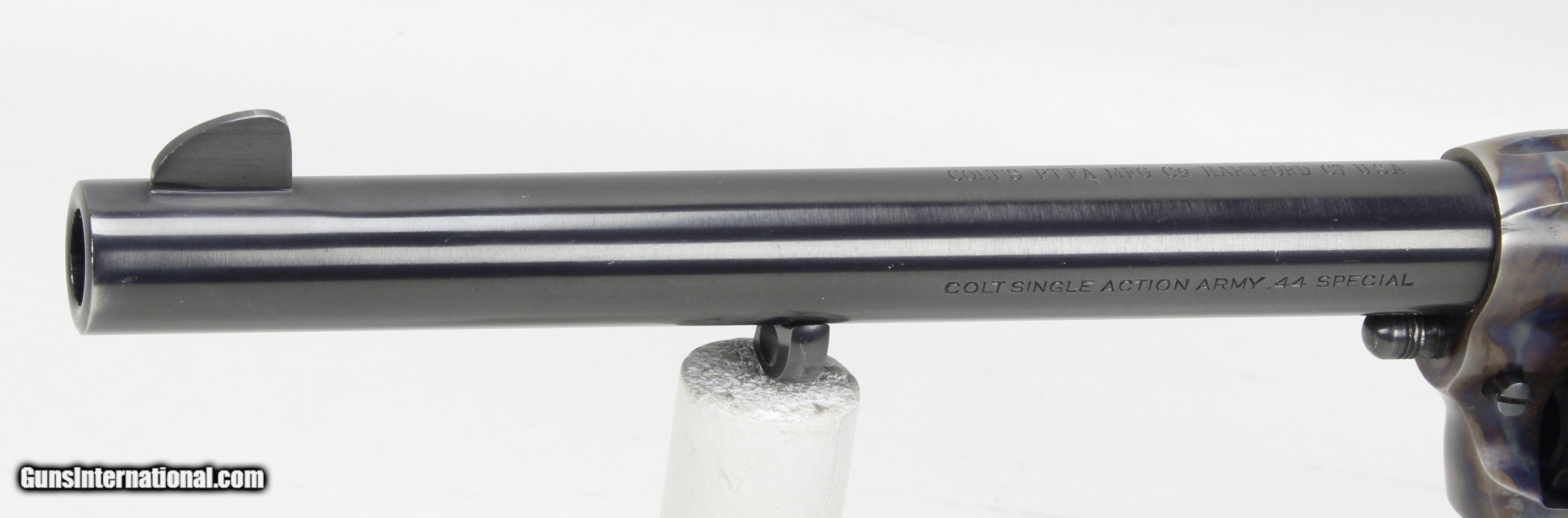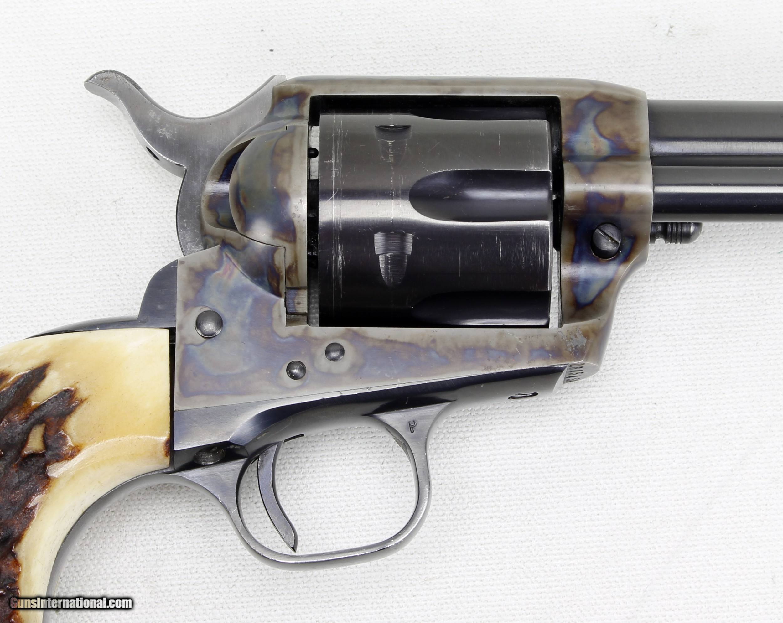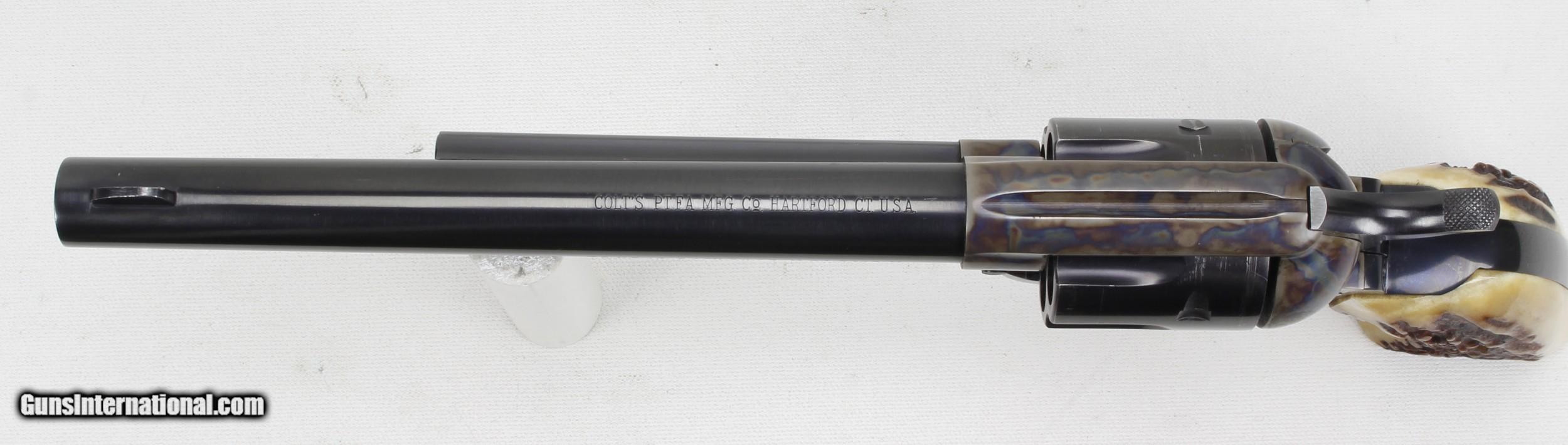 Description: Colt SAA 2nd Generation Revolver in .44 Spl. SN #26454SA. Mfg. in 1959. 7 1/2" barrel with an excellent bright bore with strong rifling. The blued barrel and cylinder are in very good condition with just some wear and drag lines on the cylinder. The case colored frame is in excellent condition. The Stag grips are also in excellent condition. The .44 Spl. caliber is the second most desirable after .45 Colt. Includes a Colt Letter of Documentation. This would make a fine addition to any Colt SAA Collection. Ships Lower 48, W/ Insurance $35.00. SOLD Curio/Relic: Yes Manufacturer: Colt Model: SAA 2nd Gen. Serial Number: 26454SA Barrel Length: 7 1/2 Caliber Info: .44 Spl. Condition: VG Metal Condition: VG Bore Condition: Excellent Finish: Blue / Case Colored |