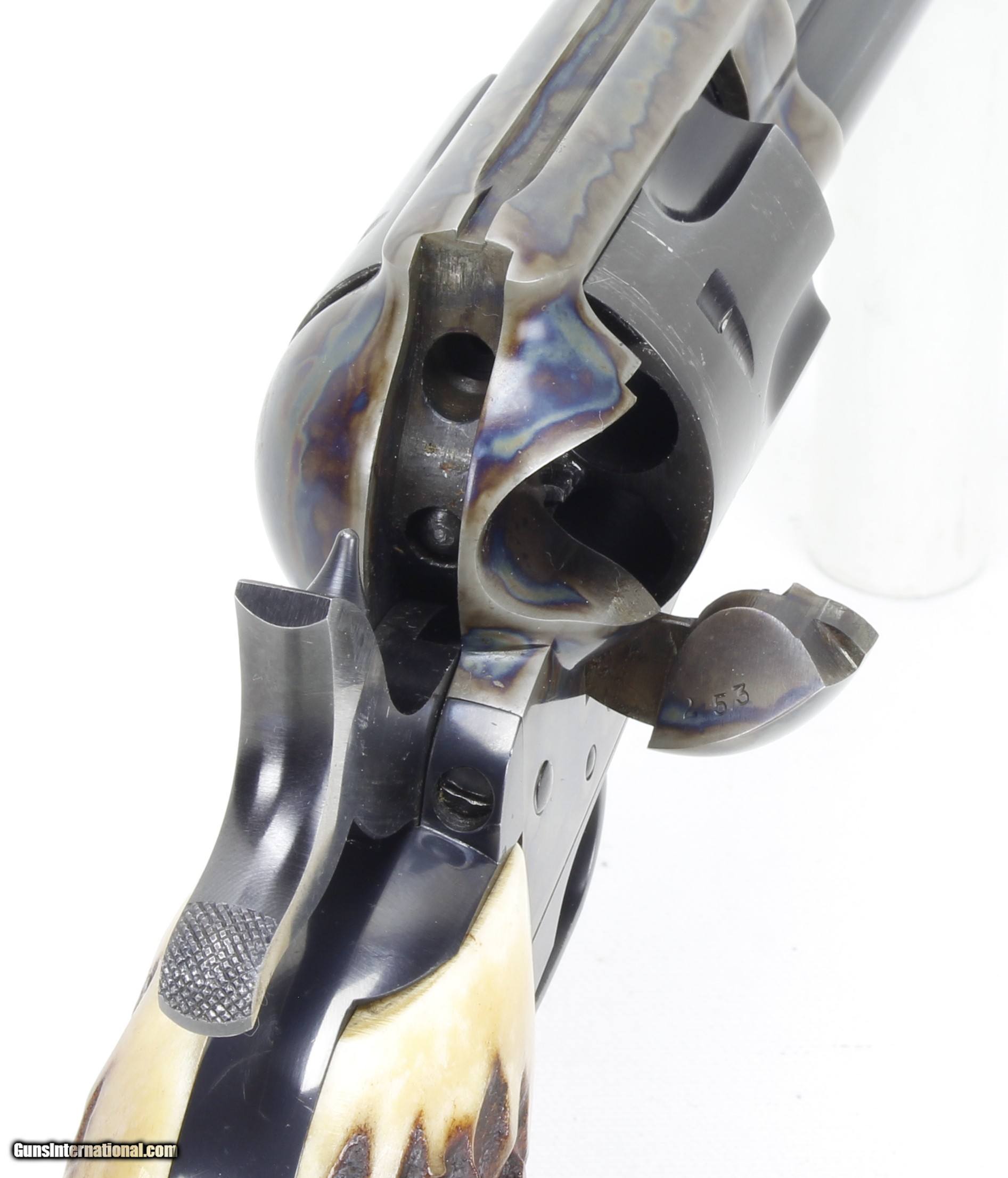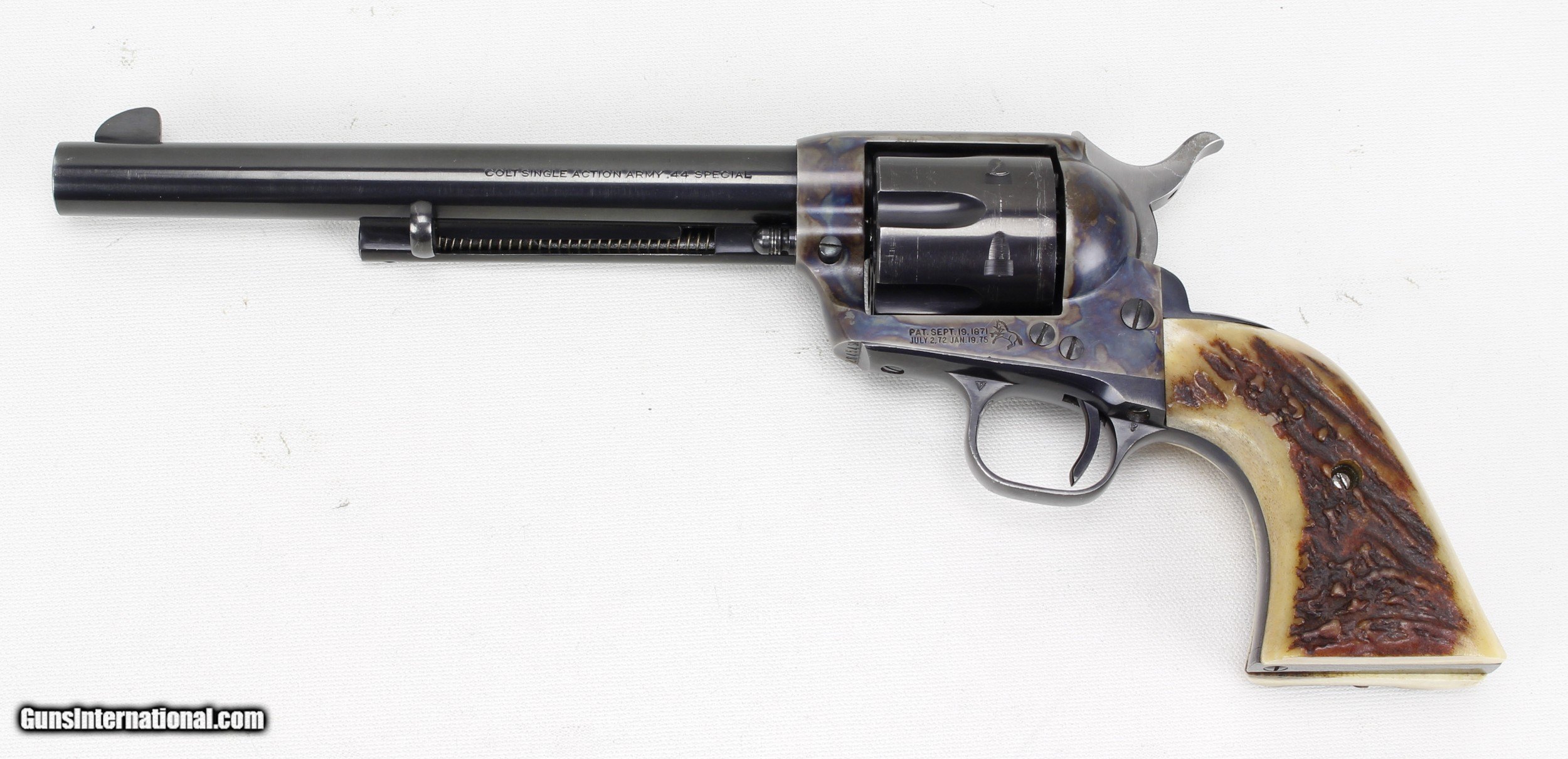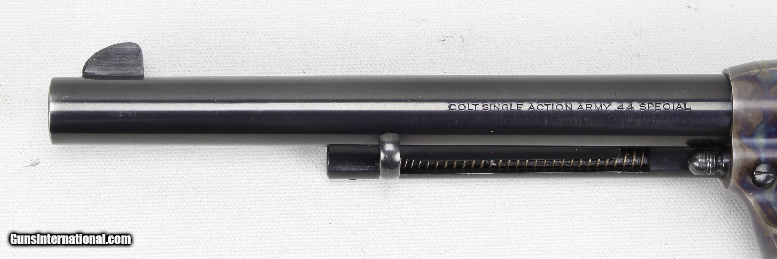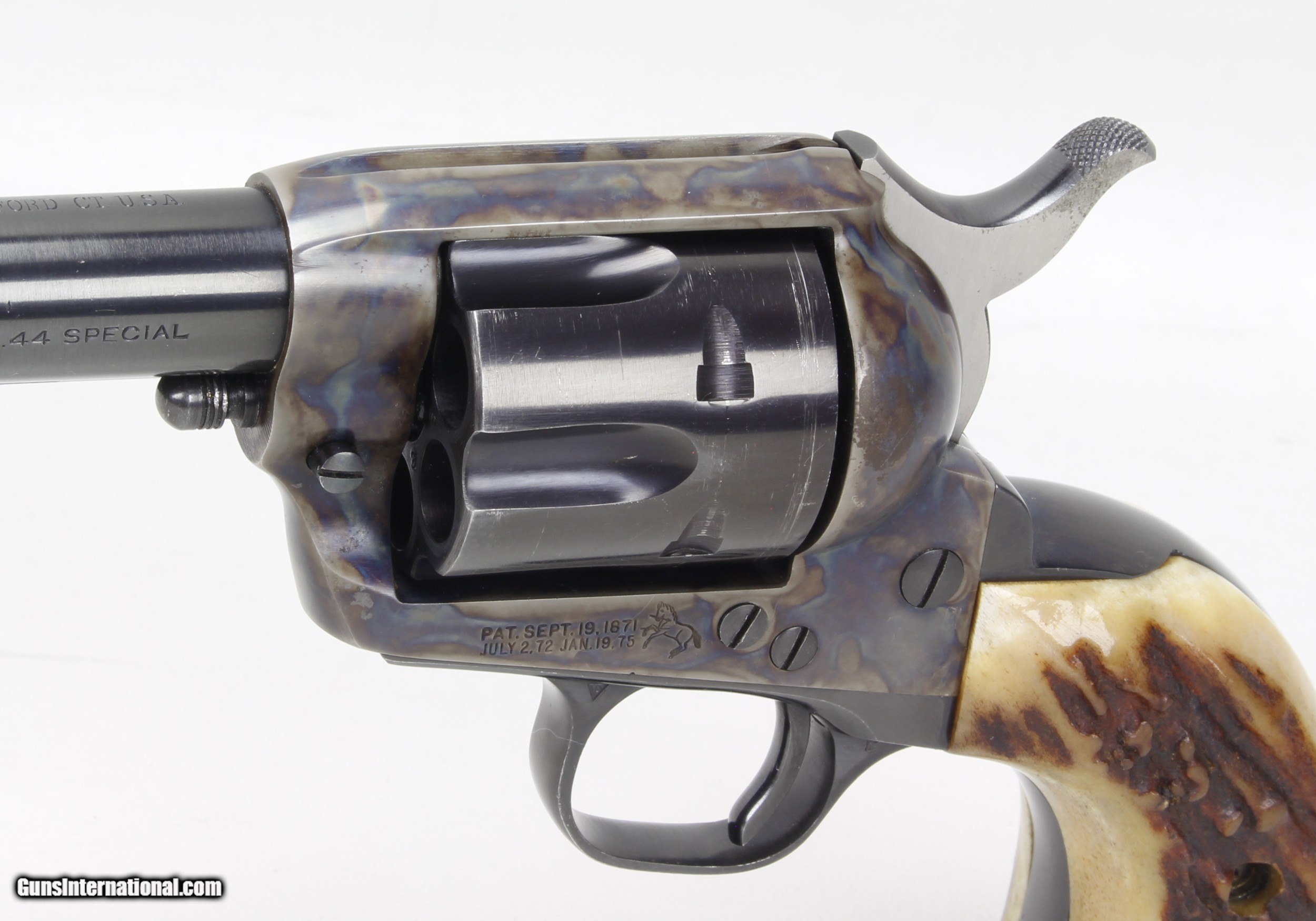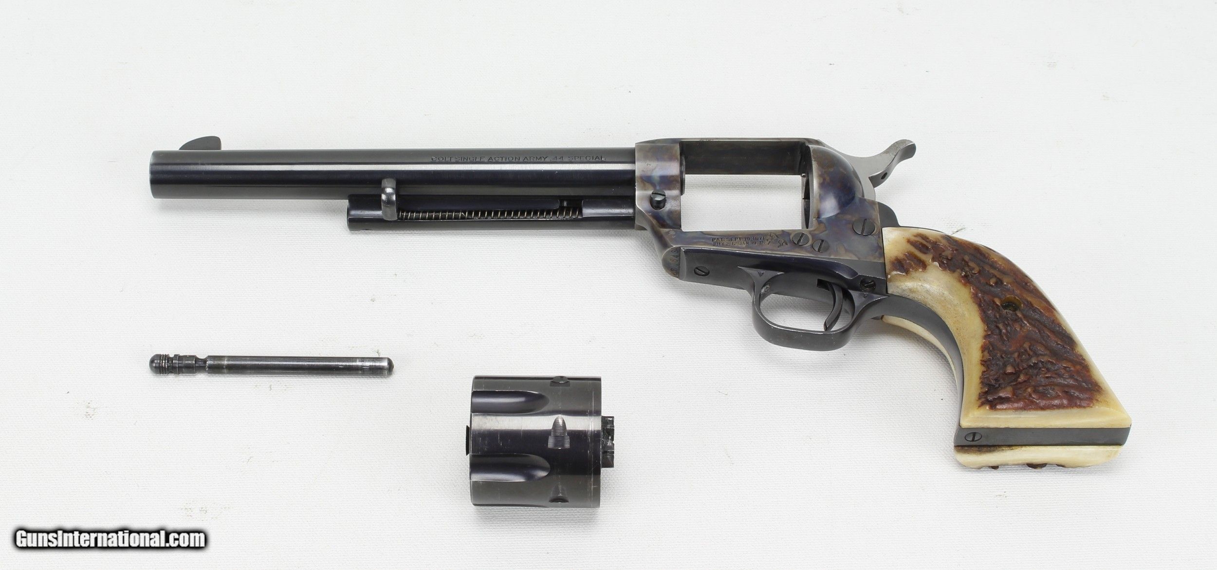 Description: Colt SAA 2nd Generation Revolver in .44 Spl. SN #26454SA. Mfg. in 1959. 7 1/2" barrel with an excellent bright bore with strong rifling. The blued barrel and cylinder are in very good condition with just some wear and drag lines on the cylinder. The case colored frame is in excellent condition. The Stag grips are also in excellent condition. The .44 Spl. caliber is the second most desirable after .45 Colt. Includes a Colt Letter of Documentation. This would make a fine addition to any Colt SAA Collection. Ships Lower 48, W/ Insurance $35.00. SOLD Curio/Relic: Yes Manufacturer: Colt Model: SAA 2nd Gen. Serial Number: 26454SA Barrel Length: 7 1/2 Caliber Info: .44 Spl. Condition: VG Metal Condition: VG Bore Condition: Excellent Finish: Blue / Case Colored |