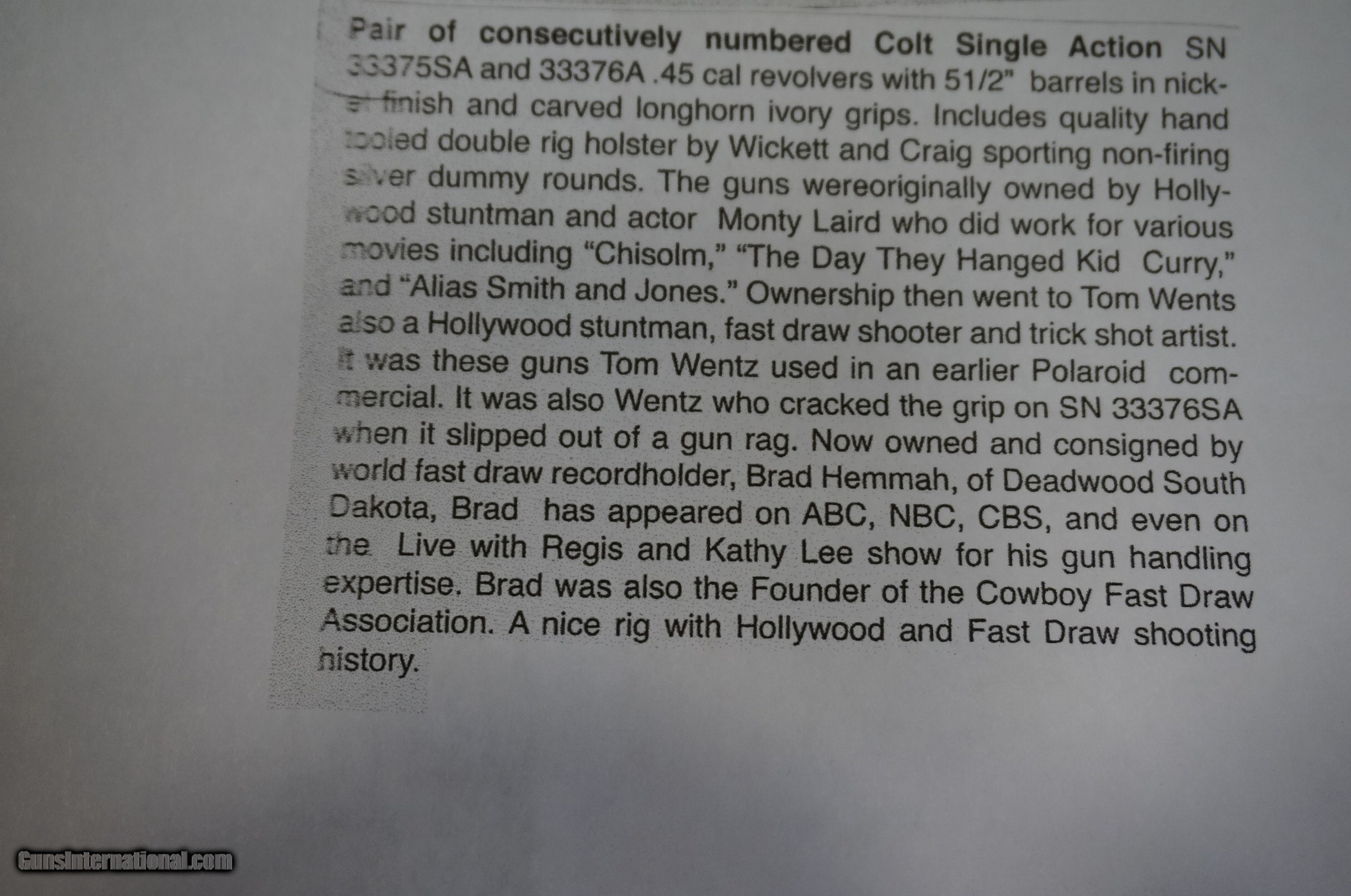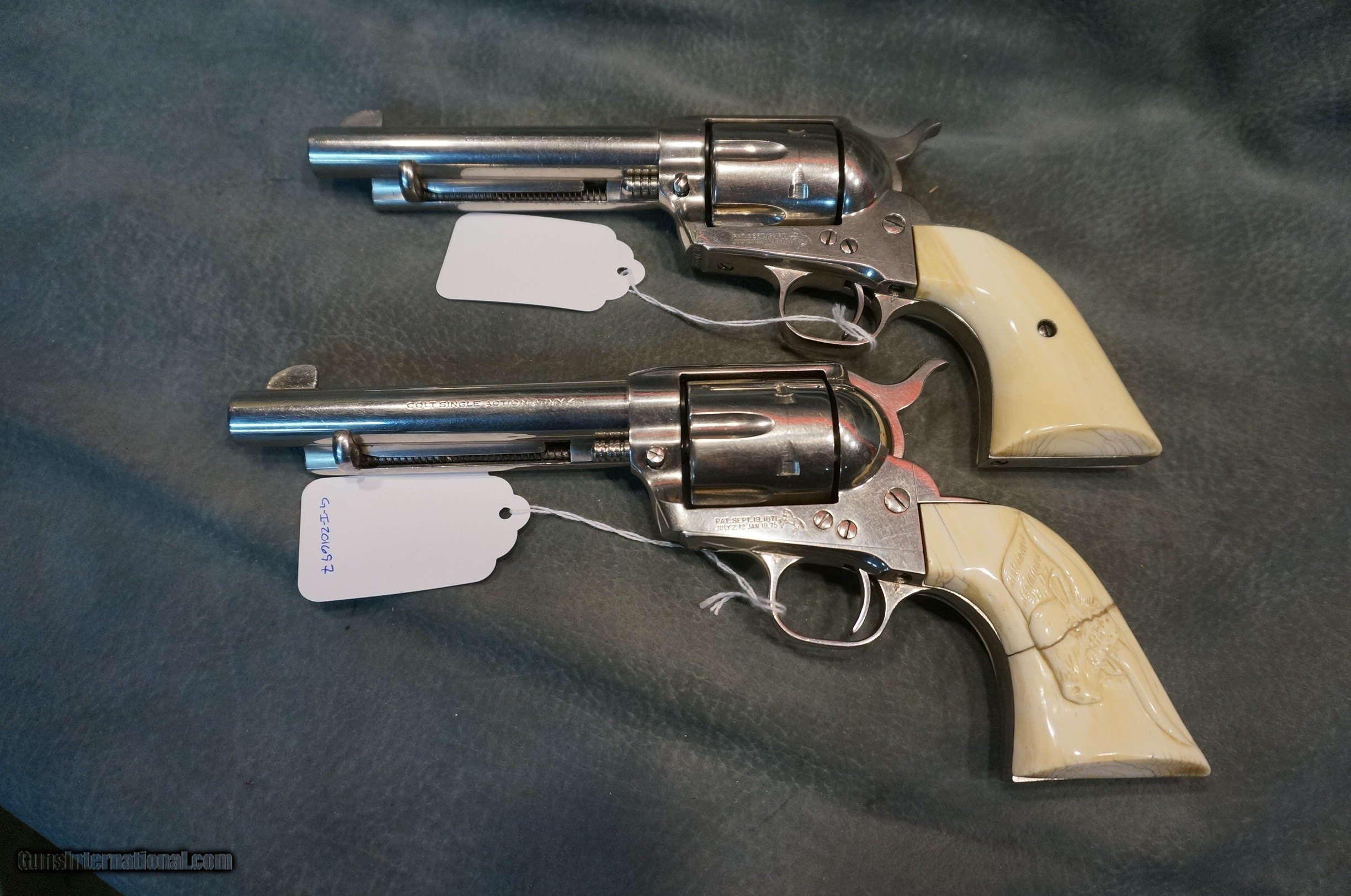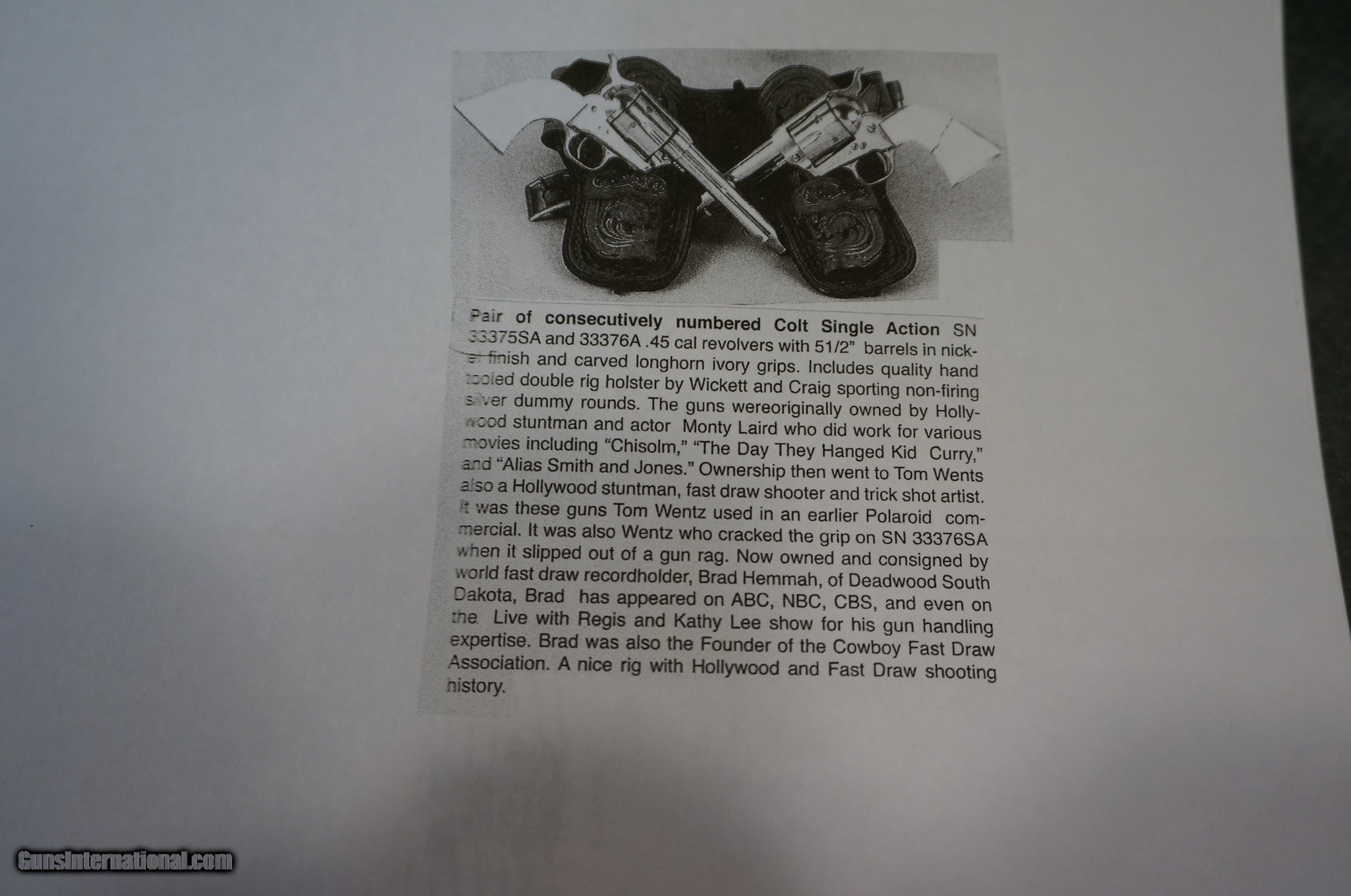 Description: Colt SAA Early 2nd Generation 45LC 5 1/2" bbl,nickel ,consecutiver pair,serial #s 33376SA and 33377SA,shipped November 11,1960,ivory carved steer horn grips,originally owned by Hollywood actor and stuntman Monty Laird who did work for various movies,including Chisolm,The Day they hanged Kid Curry and Alias Smith and Jones.Includes factory letter and historical information. GUN COLLECTIONS WANTED FOR CASH! We buy, sell, consign and trade new and used firearms.We will pay finders fees and travel for large collections. This is our 45th year in business. We offer 90 day layaways with 20% down. No return on layaways. Firearms will need to be transferred through a FFL dealer. Prices reflect a cash discount. There will be 3% added to credit card sales. We trade for gold and silver. THANK YOU! SOLD |