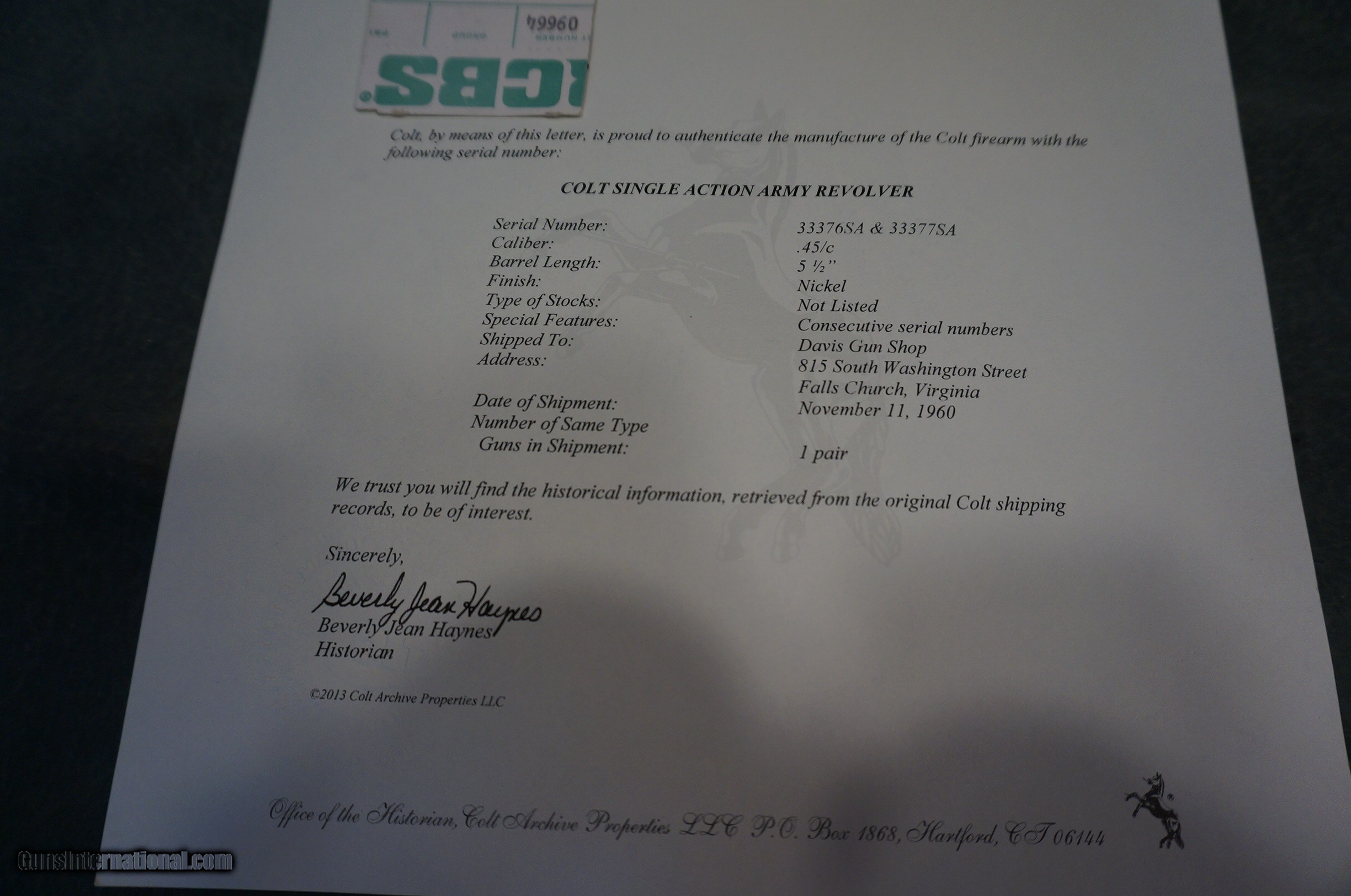 Colt SAA Early 2nd Generation Consecutive Pair 45LC 5 1/2" Nickel