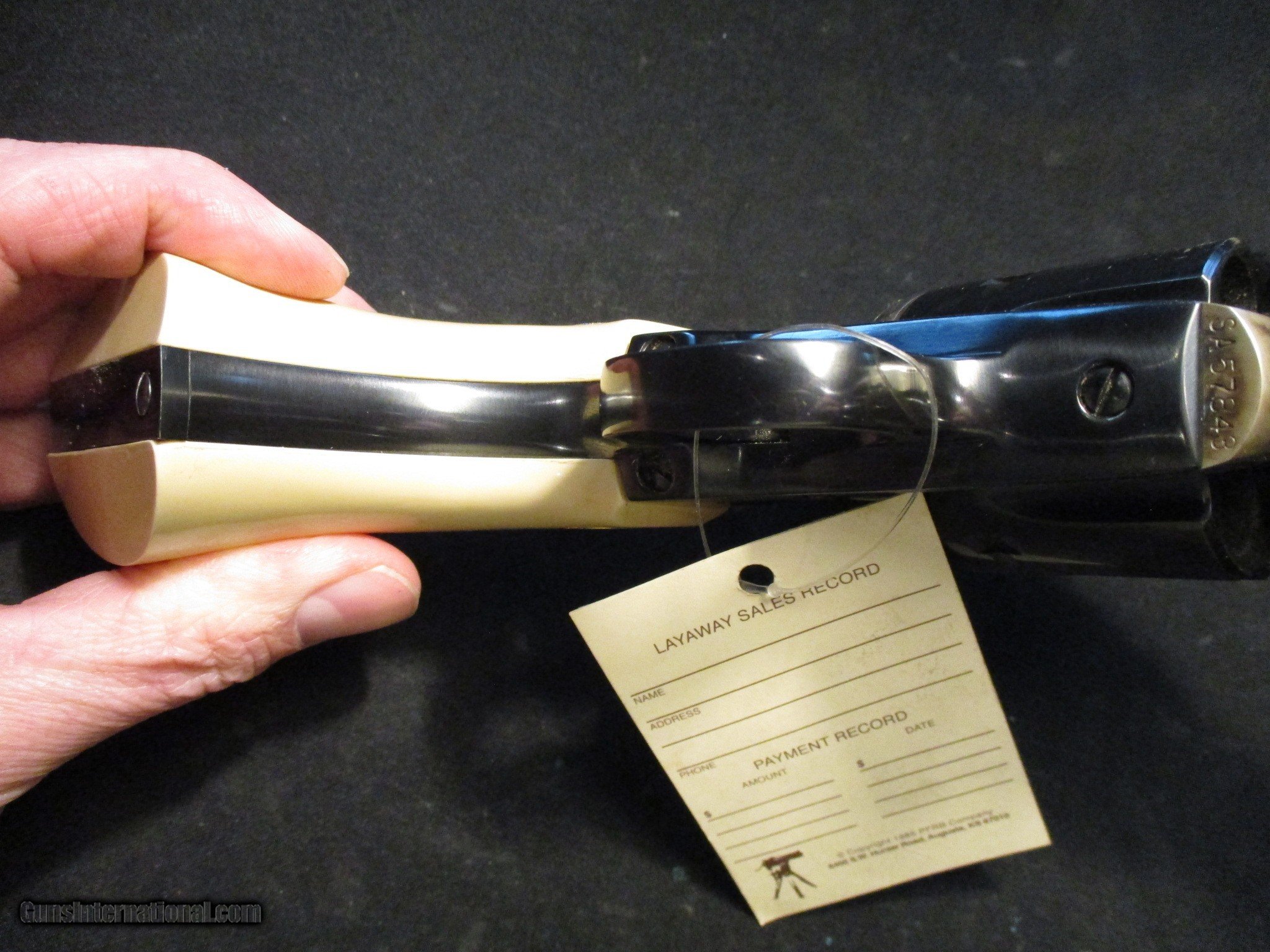 Description: Colt SAA, made in 1983. Case color frame, Ivory grips (faux I am sure), 4.75" barrel, 45LC. SN is SA578xx. CLEAN all original gun! Email me if you would like these pics sent to you, they will come through bigger and better than on the listing page here. We do offer Lay-A-Way. Our standard terms are 25% down, 90 days. Initial deposit is not refundable. Email me with any questions. I am a store front dealer, and I will close s if the gun sells locally. Once it has aI will pull it from my shelves. Please check your local laws to confirm it is legal to own in your state! Buyer pays $25 shipping and insurance to your FFL in the lower 48. AK, HI or PR is extra. I will ship to California, NO PROBLEM! All my guns come with a non-firing, 3 day unconditional return privilege, from the day UPS delivers to your dealer. Buyer pays shipping both ways if the gun comes back. I can add a new hard case by PLANO for secure shipping for $25 if the buyer wishes (highly recommended, cheap insurance, really helps keep the UPS monster from eating my guns!). No sales tax on guns ship out of Kansas, guns sold in Kansas are subject to Kansas sales tax. I am a licensed FFL, and will include a copy of my FFL with the gun for your dealer’s records. I will ship to a C&R if the gun is eligible. I will ship to California, but you need to confirm the gun is legal where you are, California or other. WE BUY AND CONSIGN GUNS AND GUN COLLECTIONS! We will travel to pick up collections! . WE ALSO TRADE FOR CLASSIC CARS AND TRUCKS! Email me with any questions, and good luck! SOLD |
